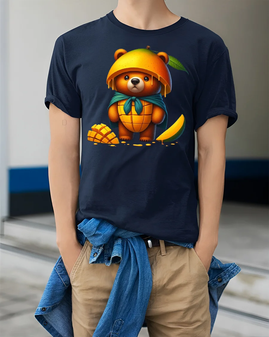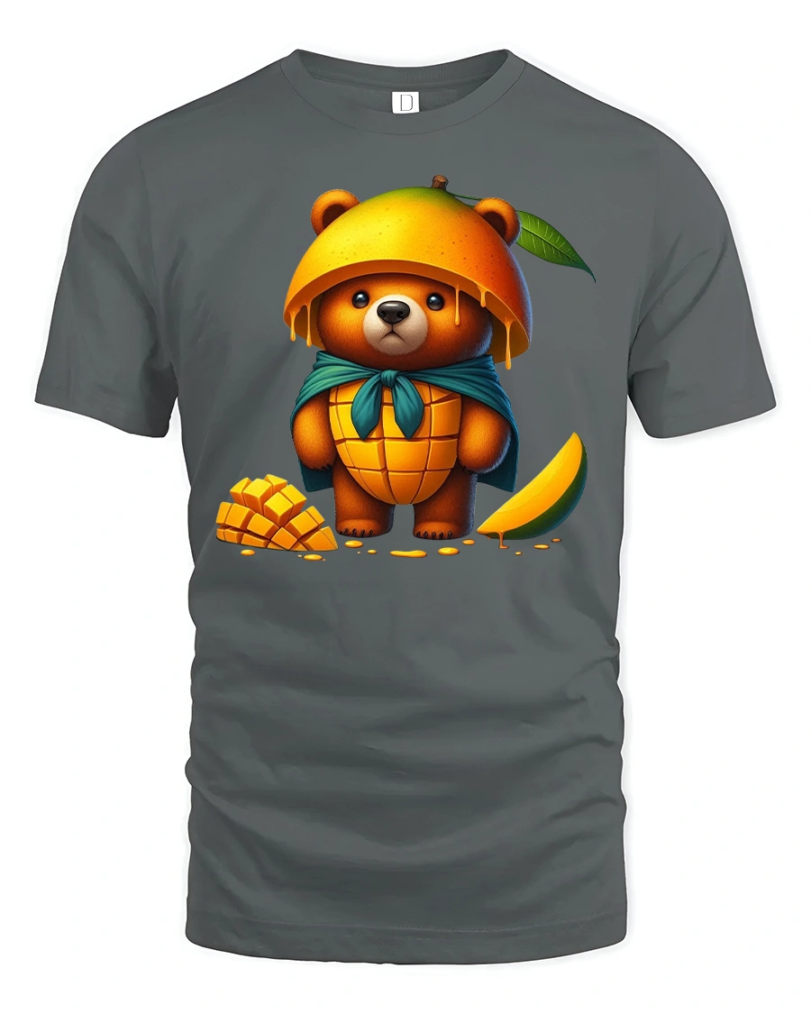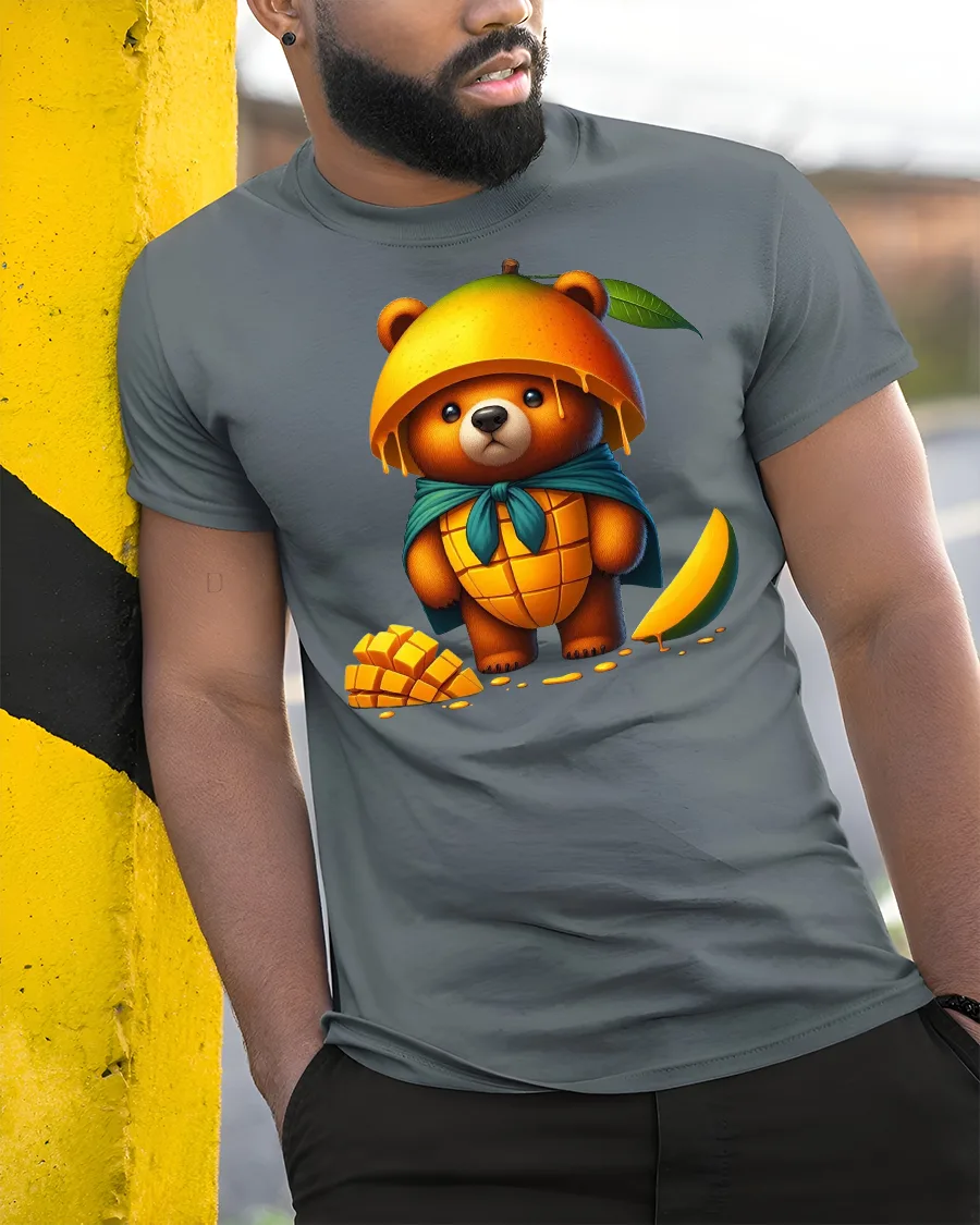 Featuring an adorable bear dressed as a juicy mango with dripping details and vibrant fruit accents, this graphic tee delivers instant smiles and cheerful energy.
