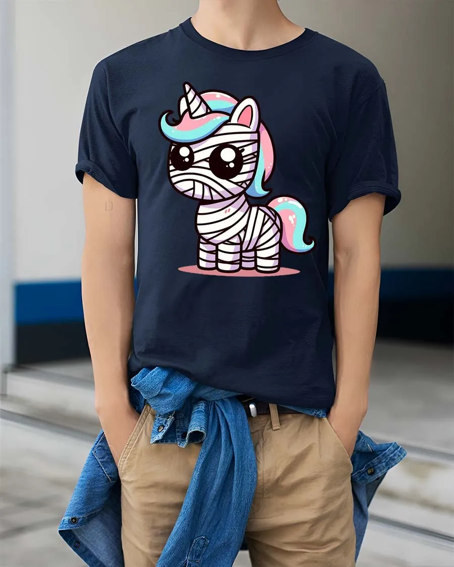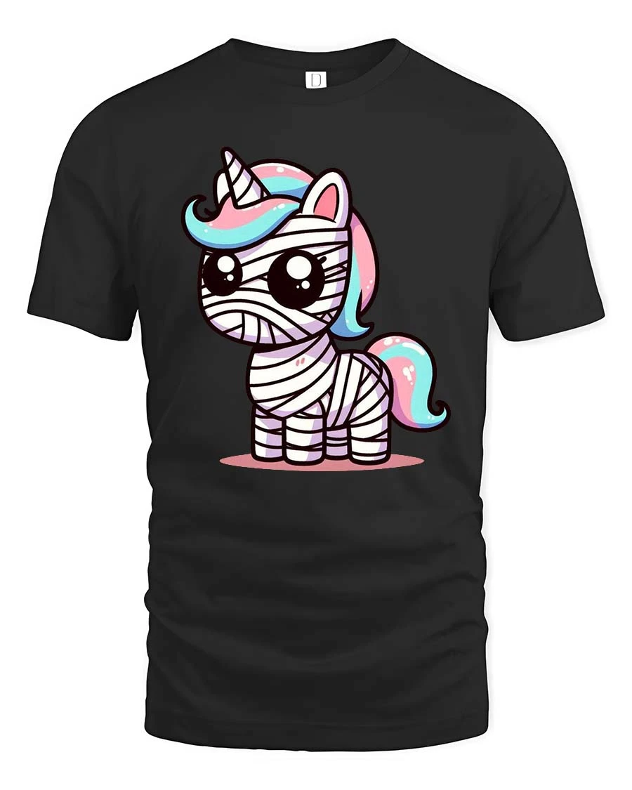 Featuring an adorable unicorn wrapped like a mummy with colorful pastel accents, this t-shirt brings together fantasy and Halloween vibes in a cute and eye-catching way.