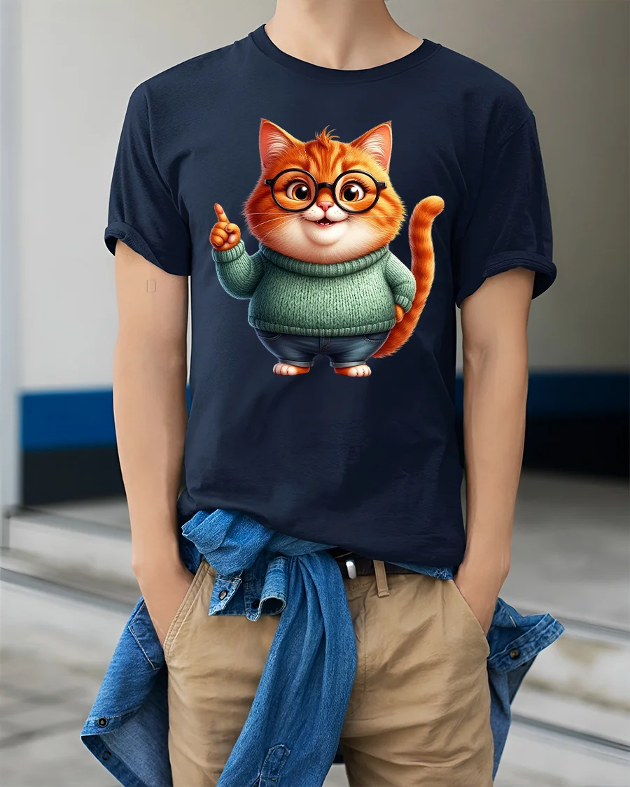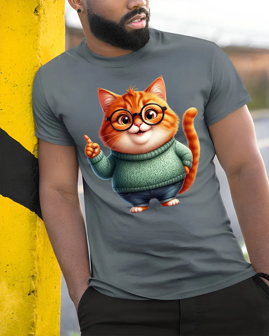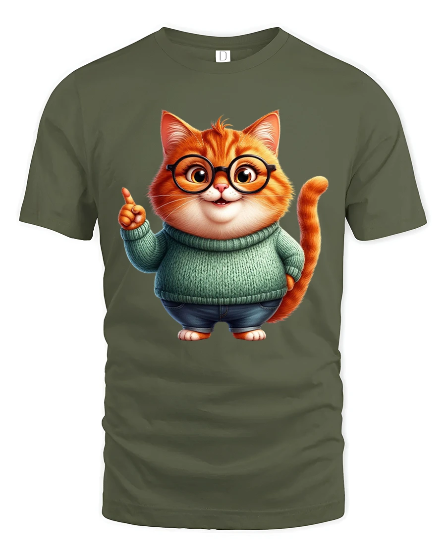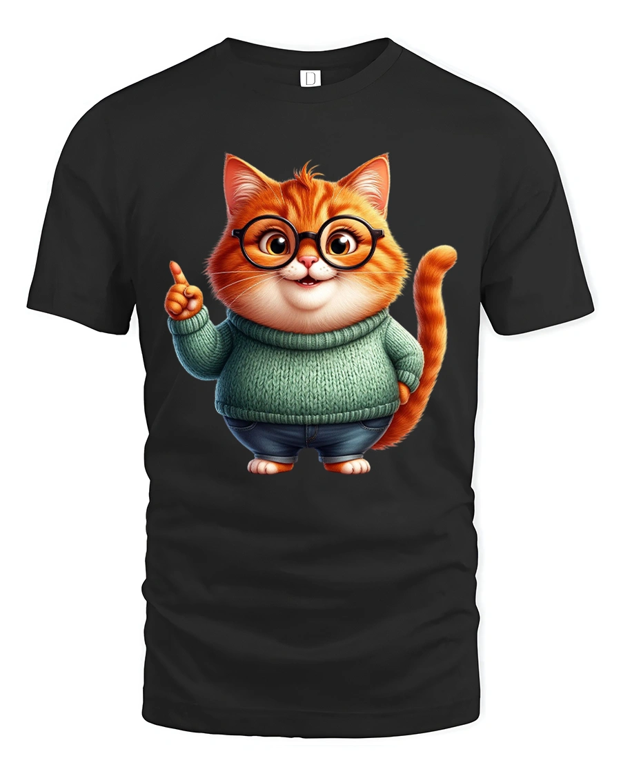 The cute nerdy cat graphic t shirt features an adorable cartoon cat wearing glasses and a cozy sweater with a playful and intelligent expression.