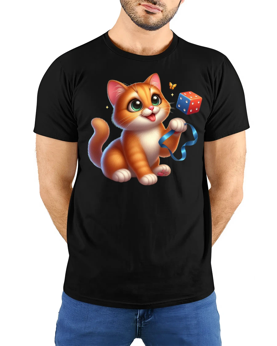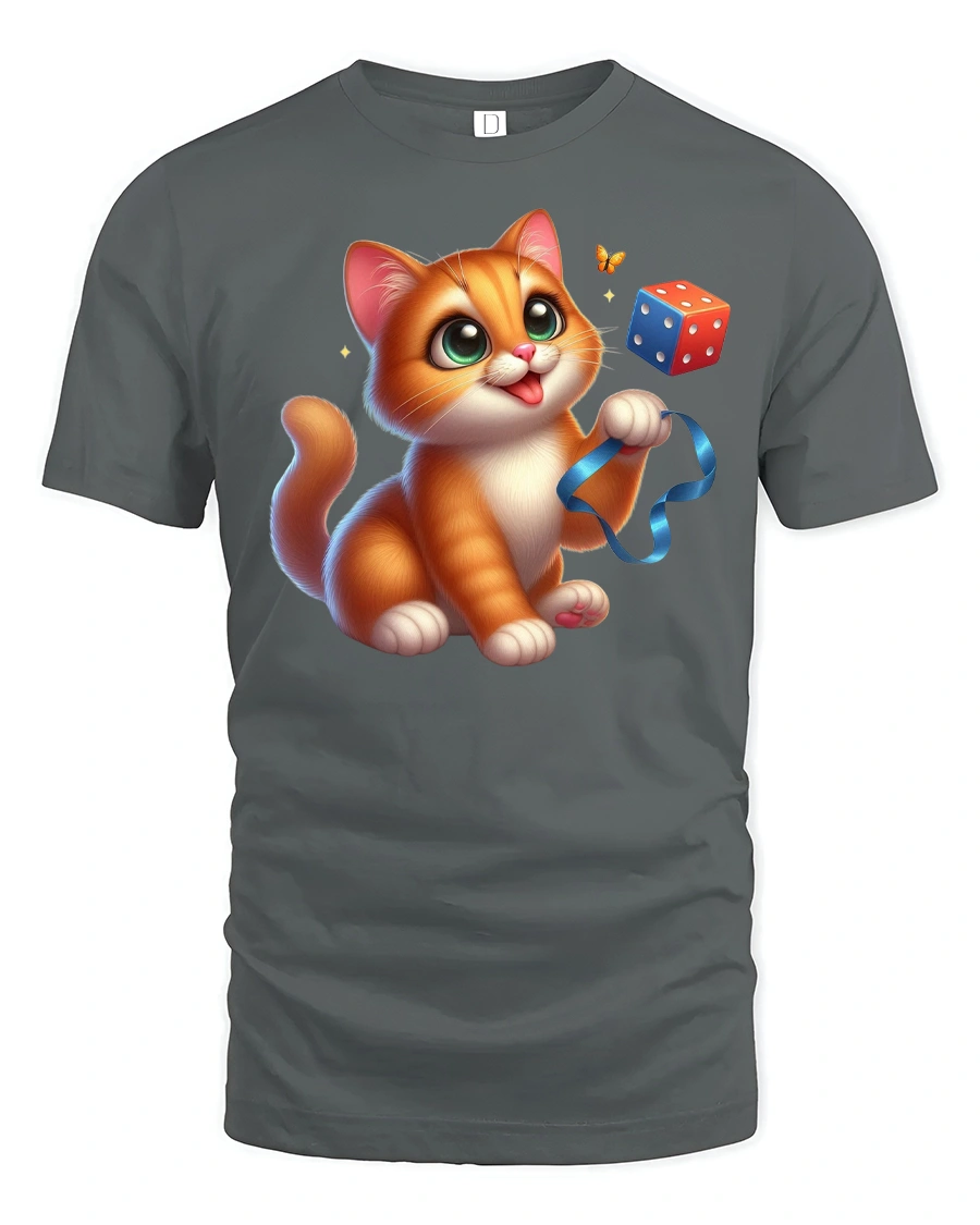Cute Orange Kitten Playful Dice Graphic Printed Tee is the perfect shirt for cat lovers who adore fun and quirky designs. Featuring an adorable orange kitten with bright eyes, holding a ribbon and playing with a dice, this tee captures the playful spirit of our feline friends. Its cartoon-style artwork is both heartwarming and eye-catching, making it a unique piece for everyday wear.