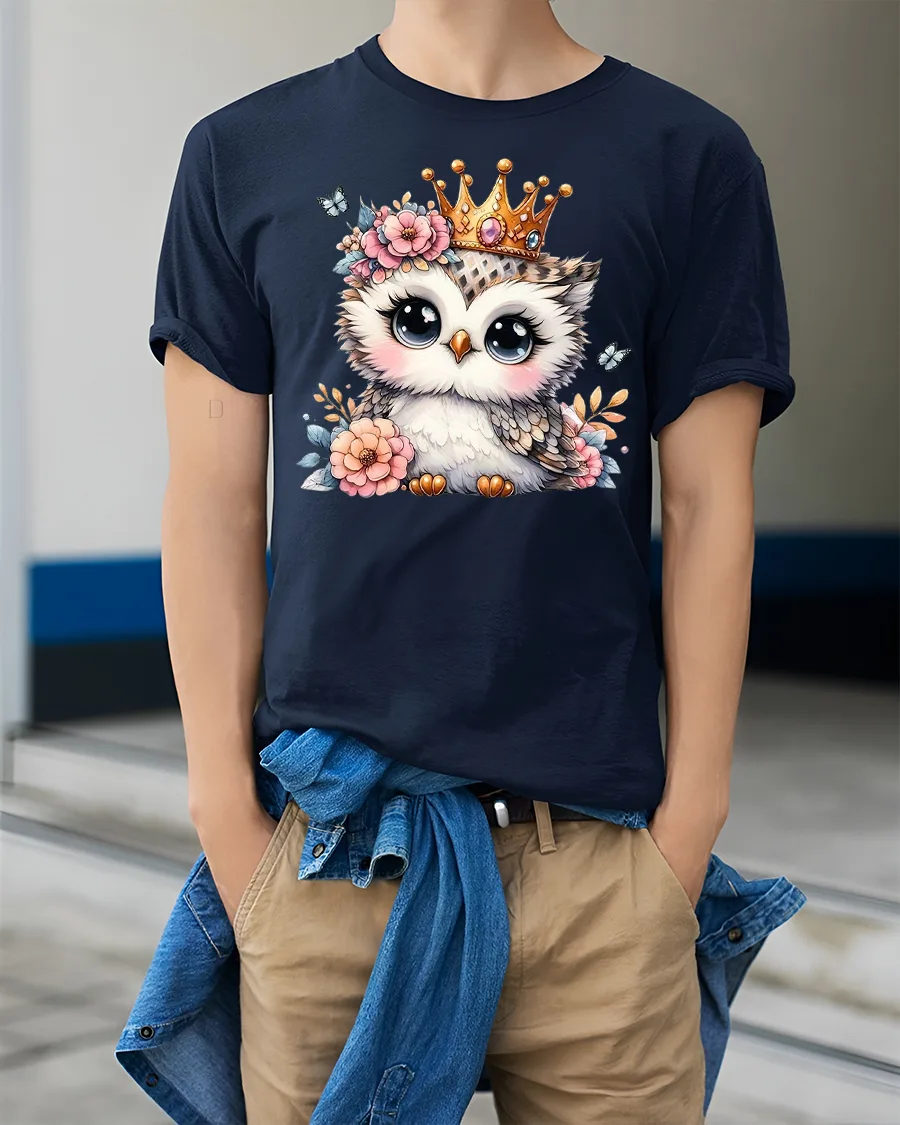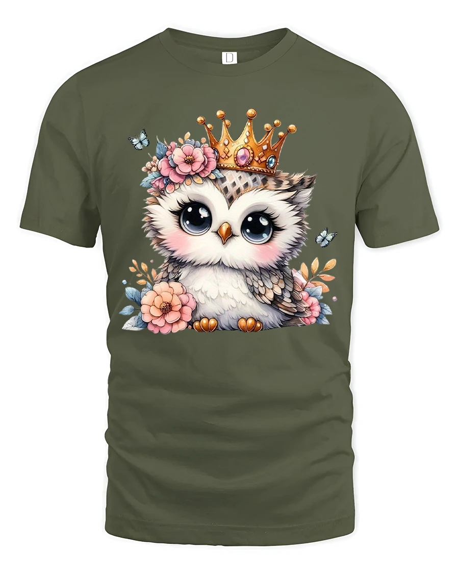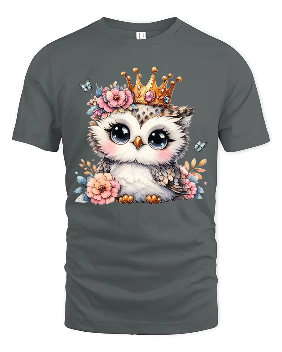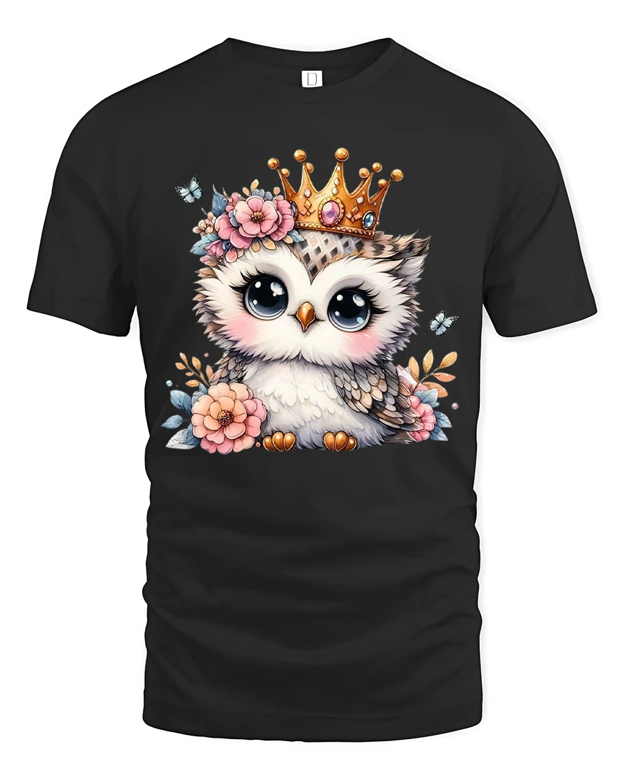 Cute Owl Princess Graphic Tee captures gentle charm with an adorable owl wearing a delicate crown and surrounded by soft florals.