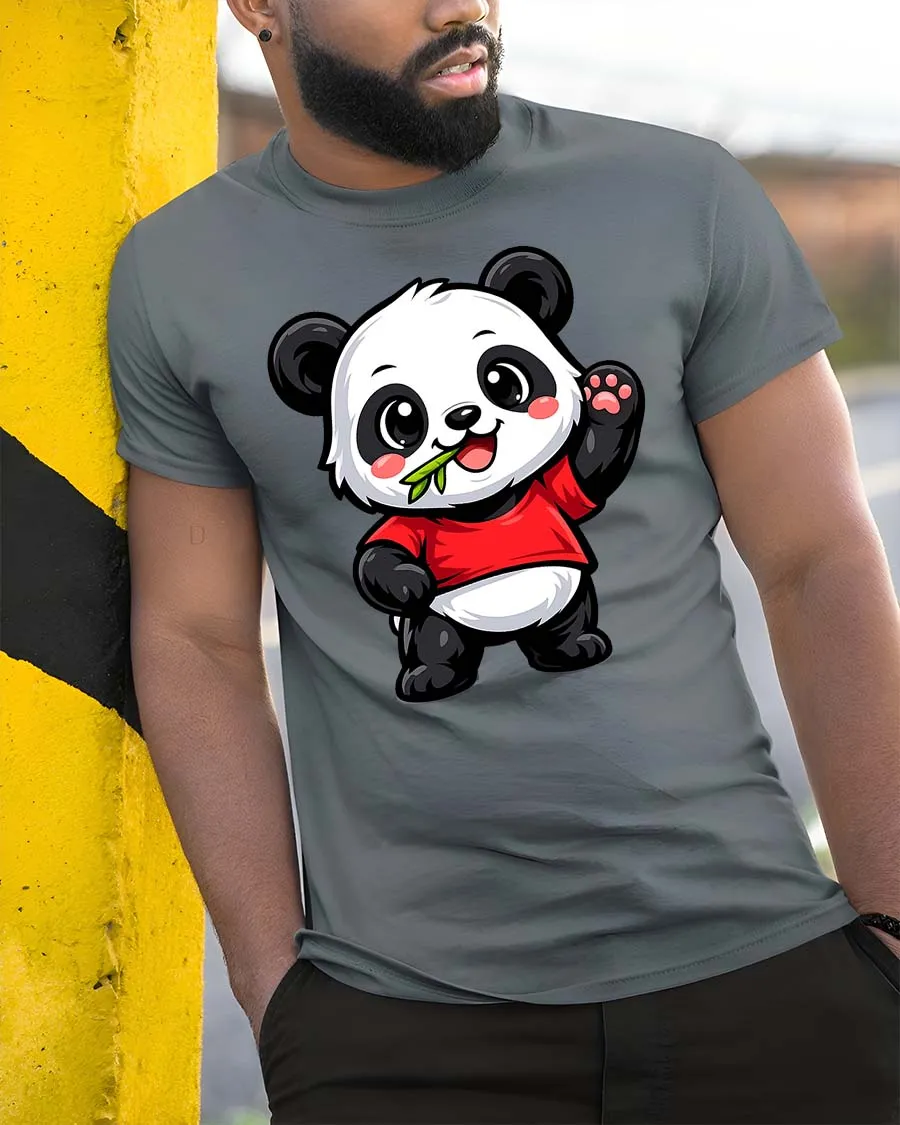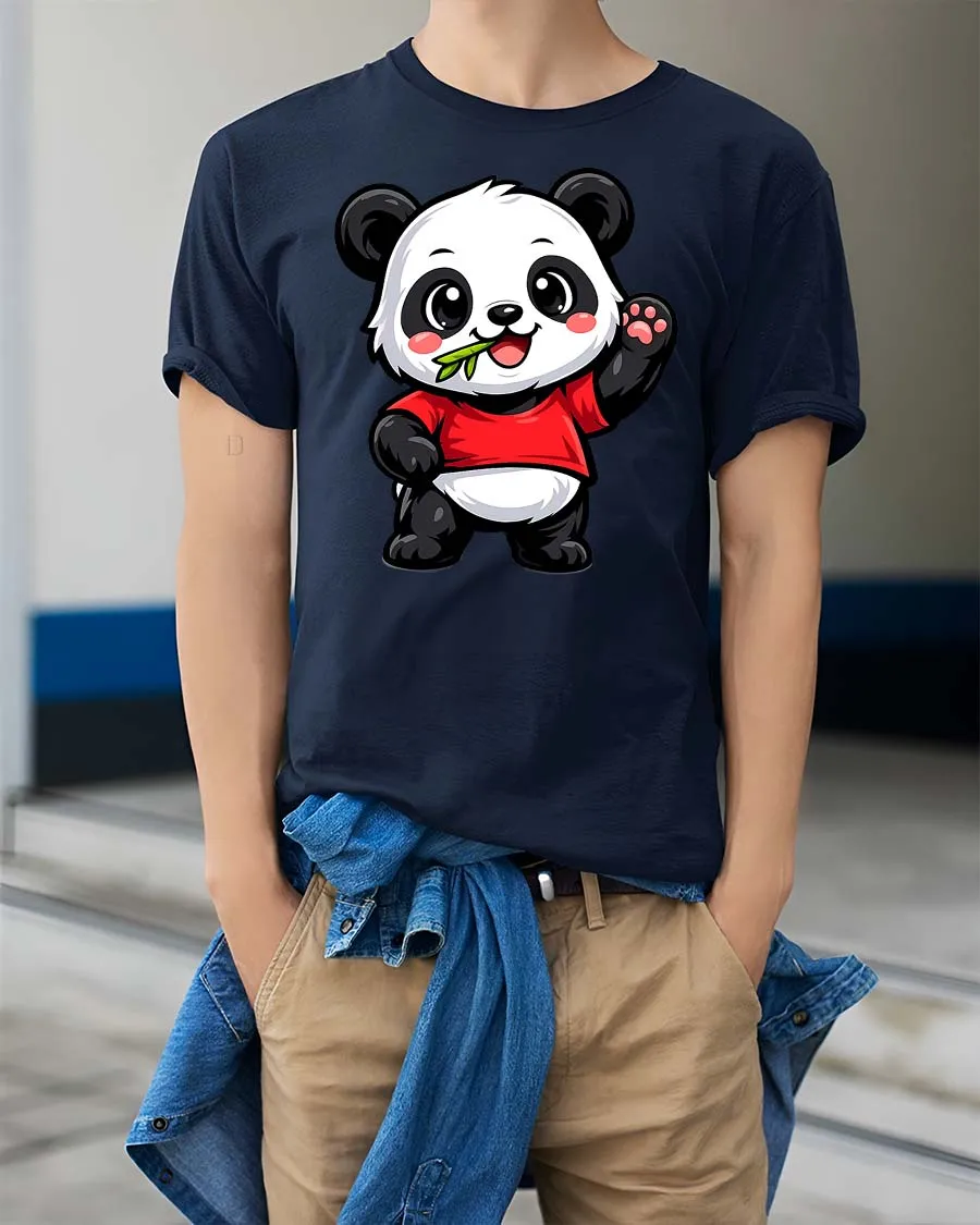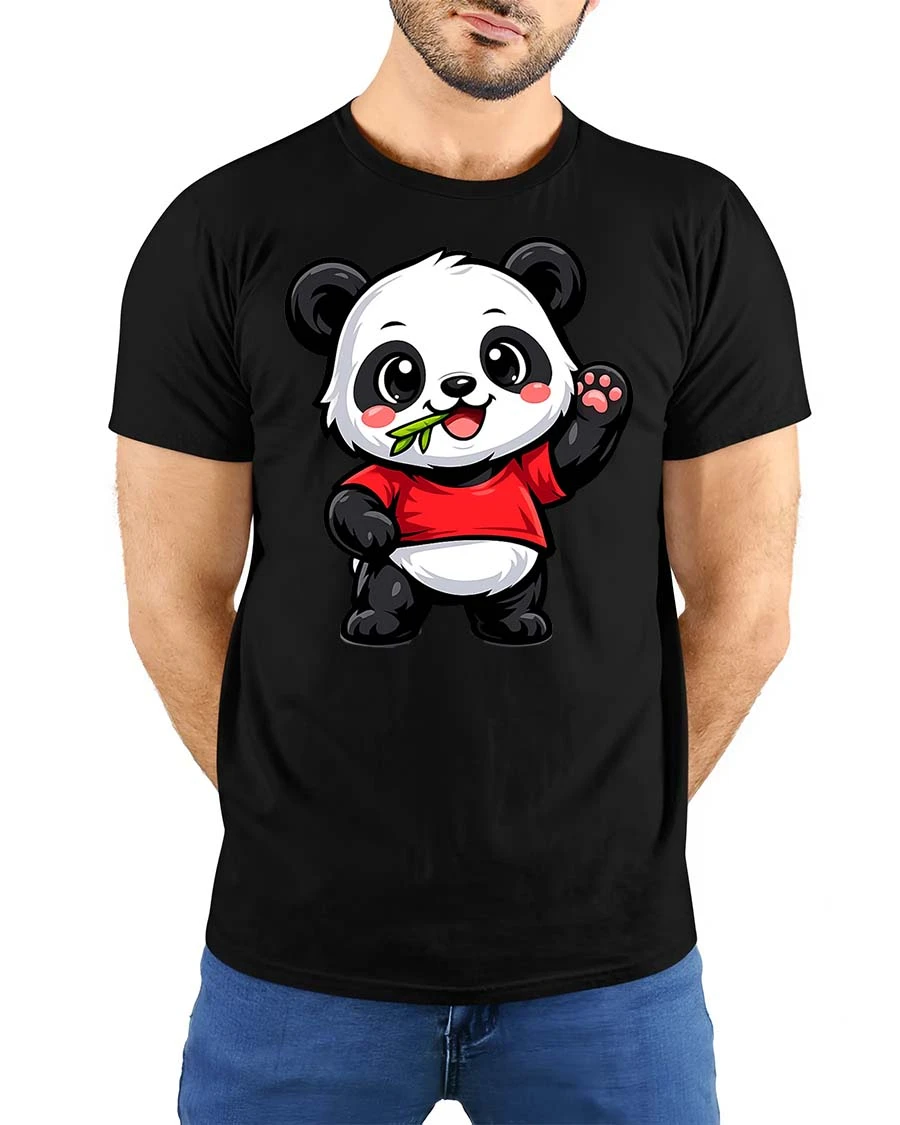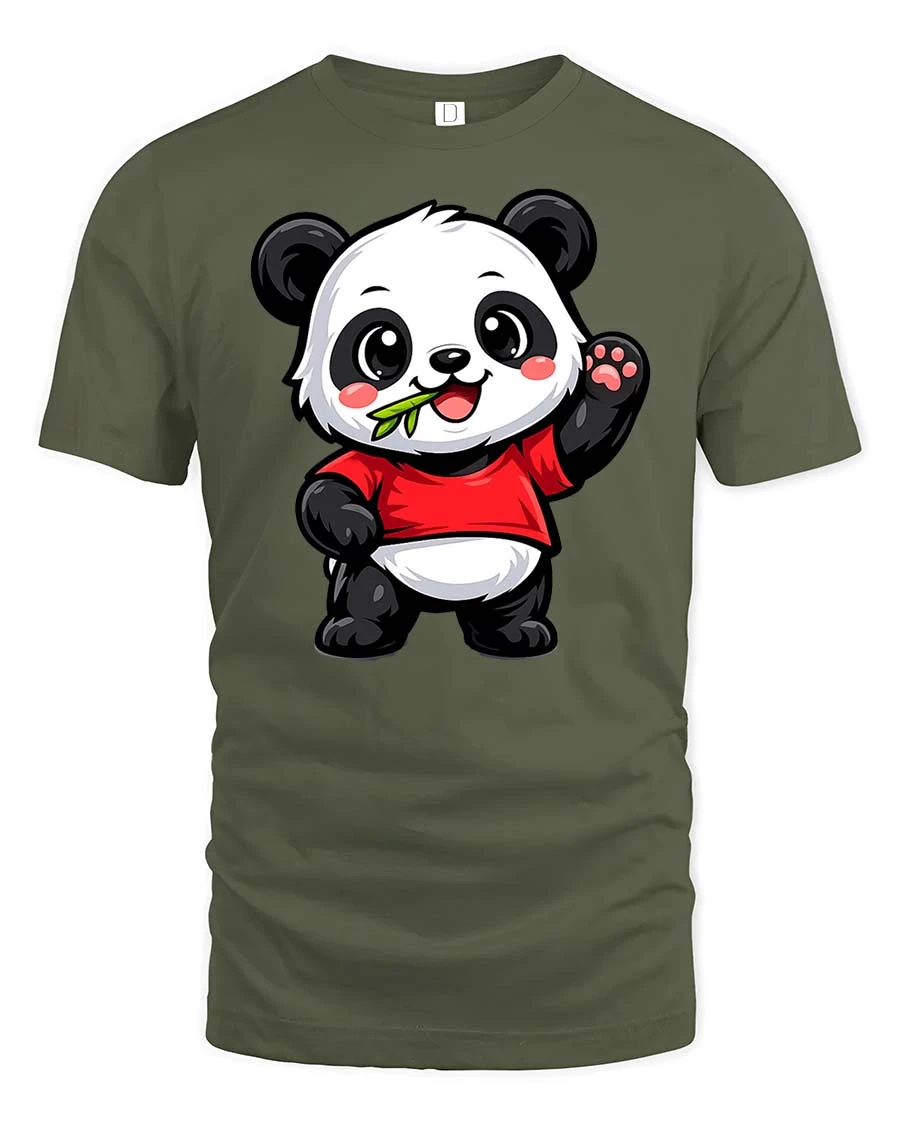 Cute Panda Eating Bamboo Cartoon Kawaii Animal Tshirt features an adorable panda character happily enjoying bamboo in a cheerful cartoon style.