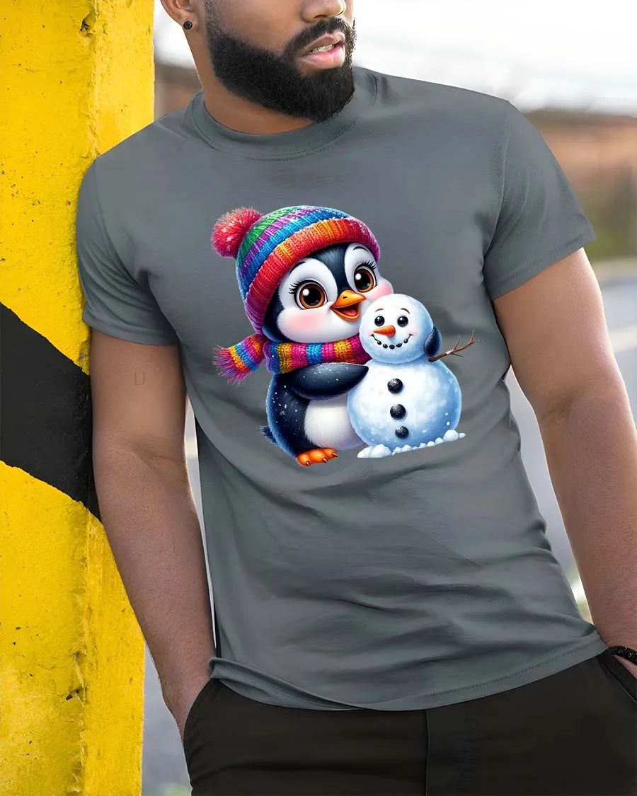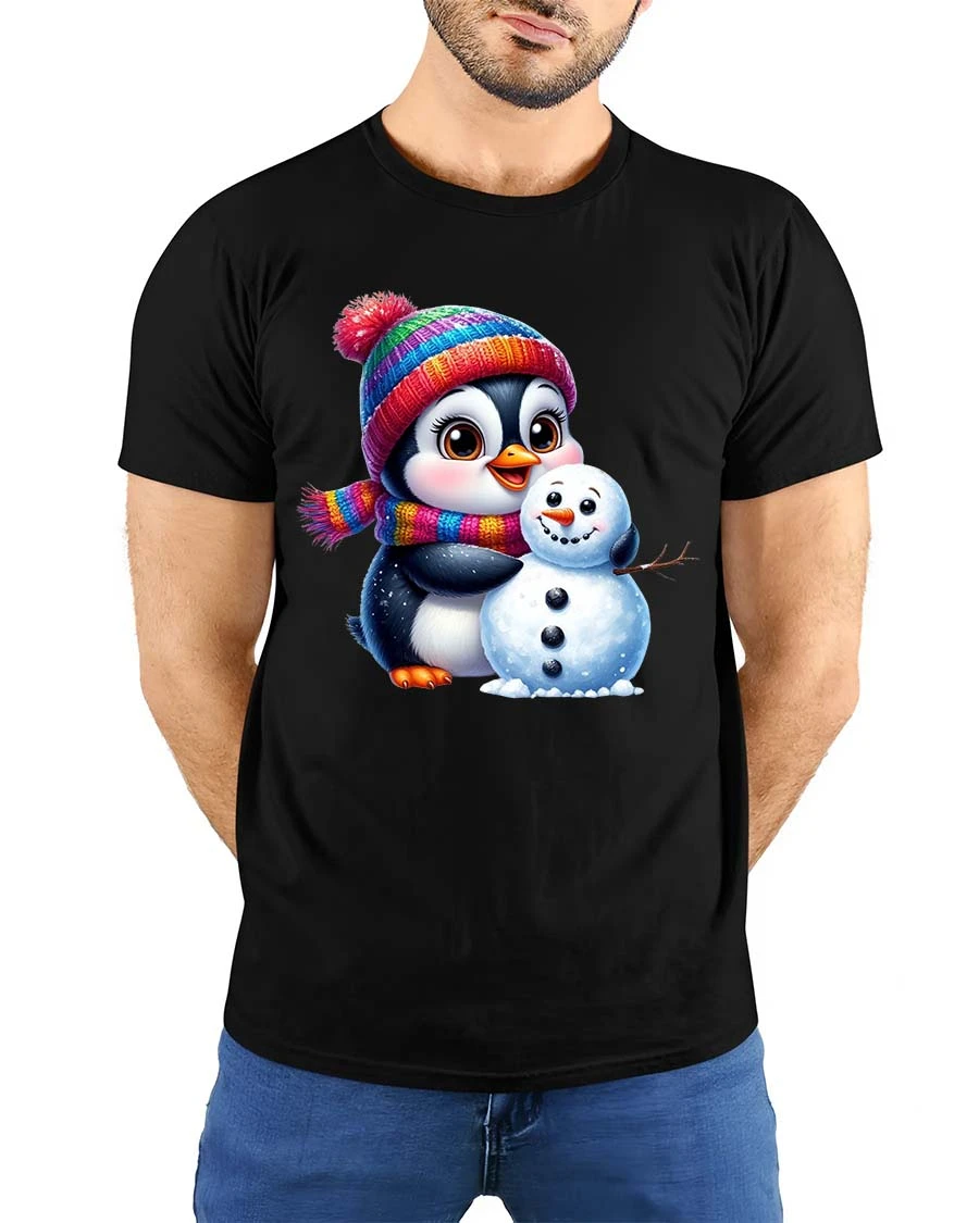 Stay cozy and cheerful with the Cute Penguin Snowman T-Shirt, featuring an adorable cartoon penguin wearing a colorful winter hat and scarf while hugging a smiling snowman.