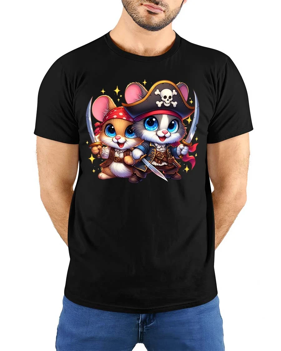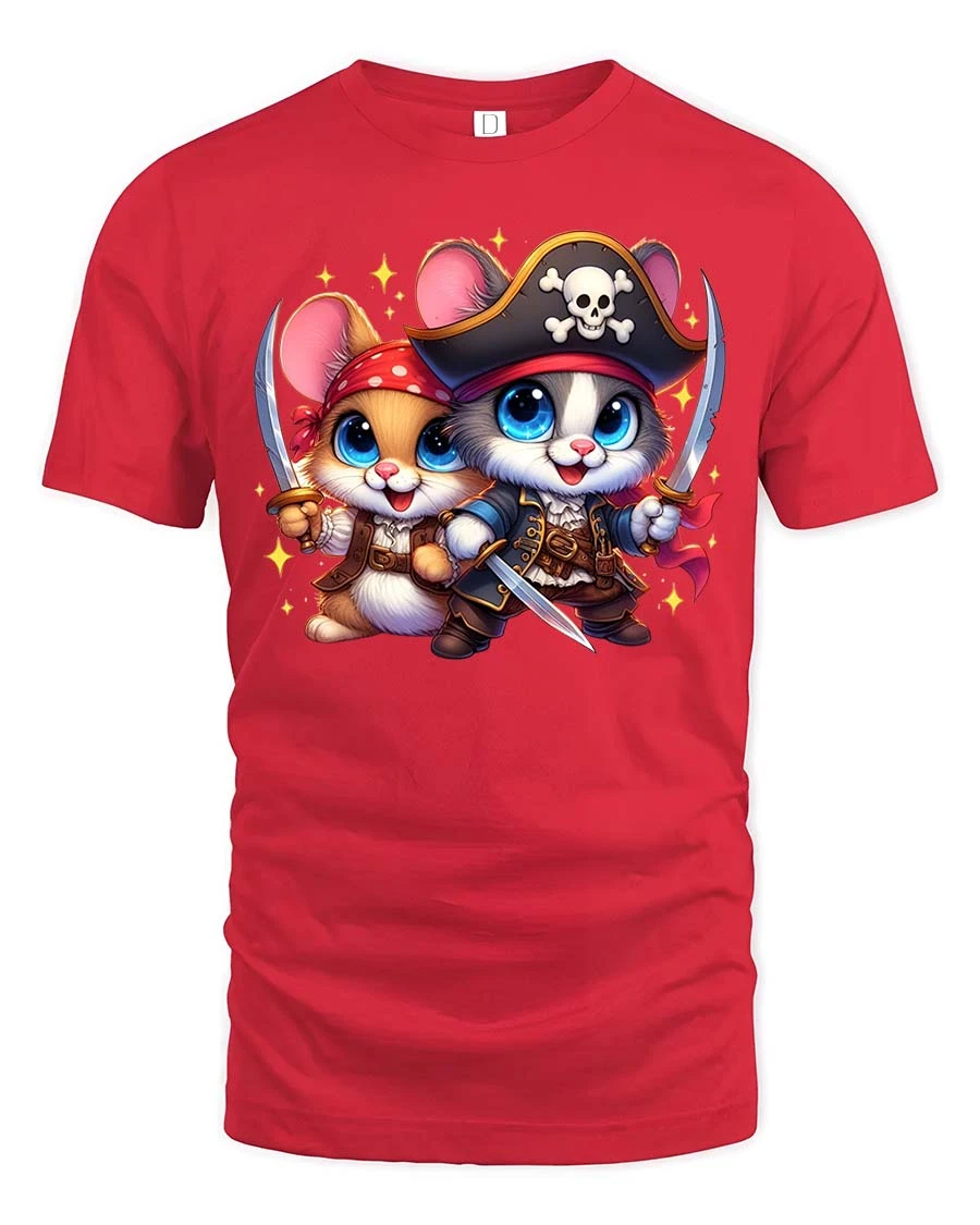 Cute Pirate Mice T-Shirt Funny Animal Adventure Graphic Tee is a charming and playful design that brings a fun pirate theme to life. Featuring two adorable cartoon mice dressed as pirates with swords and hats, this t-shirt captures a sense of adventure and imagination. The vibrant colors and detailed artwork make it a standout piece for anyone who loves cute characters and fantasy-inspired designs.