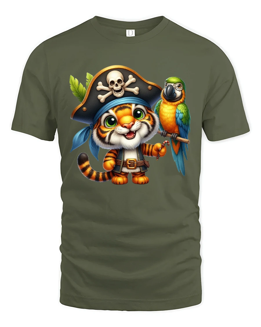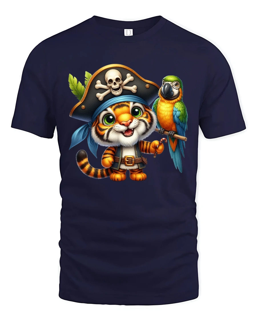 The Cute Pirate Tiger Cartoon Adventure Art Graphic Tshirt blends humor and fantasy into a lighthearted visual experience.