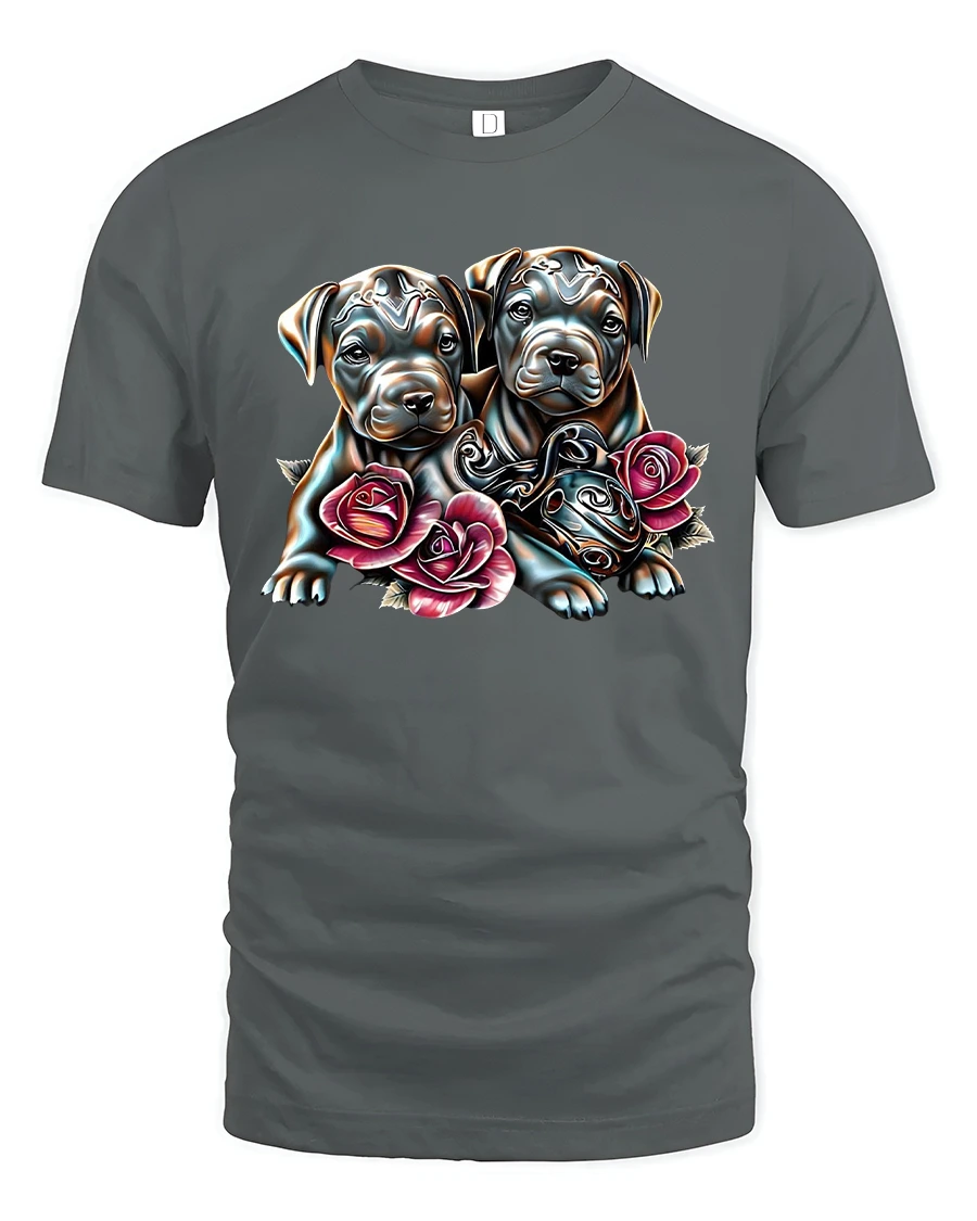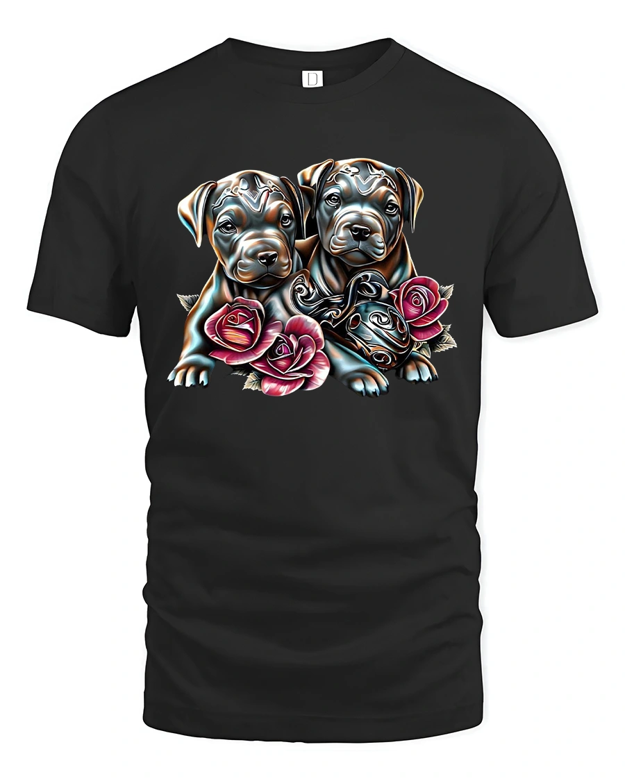 The Cute Puppy Duo with Roses Adorable Love T-Shirt makes the perfect gift for dog lovers and anyone who enjoys bright, happy art on their favorite tee.