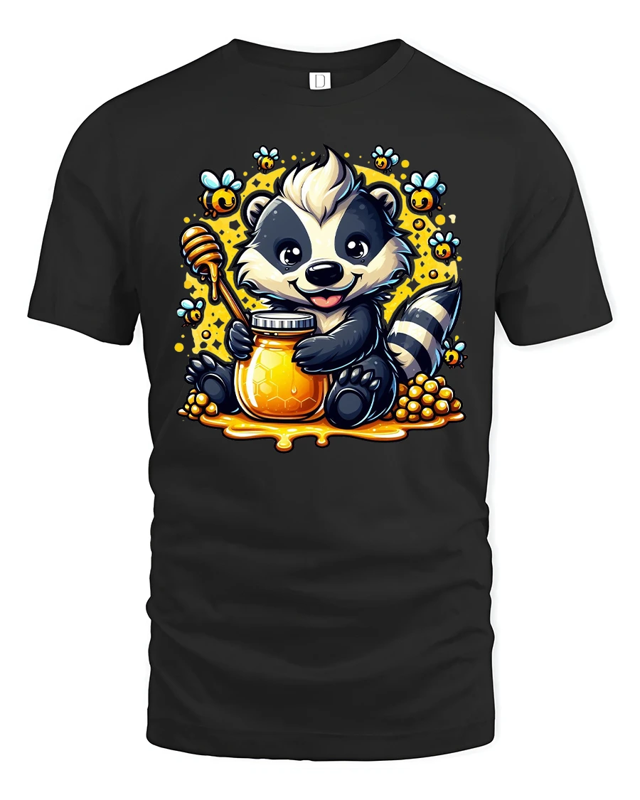 Featuring an adorable raccoon holding a golden honey jar surrounded by buzzing bees, this tee perfectly combines sweetness, humor, and style.
