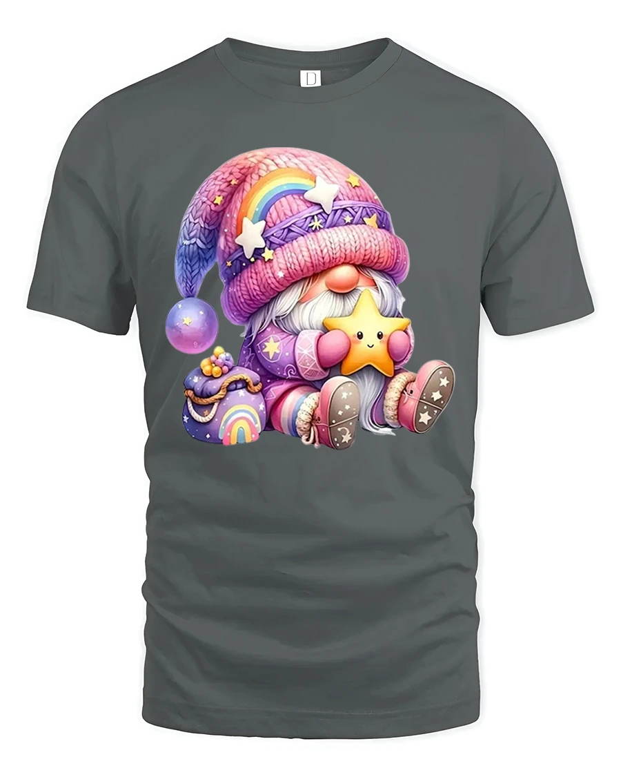 Whether you adore gnomes, collect kawaii themed apparel or enjoy wearing designs that spark happiness, this t-shirt offers a delightful blend of fun, color and magical charm. Let this sweet rainbow gnome brighten your style and your day.