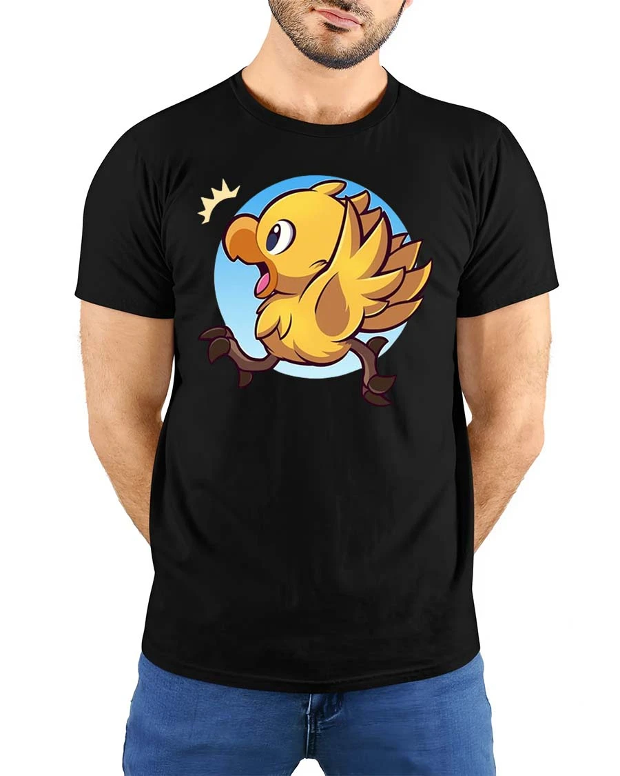 Cute Running Chick Cartoon Funny Baby Bird Kawaii Tshirt - model wearing black tee with hands behind back