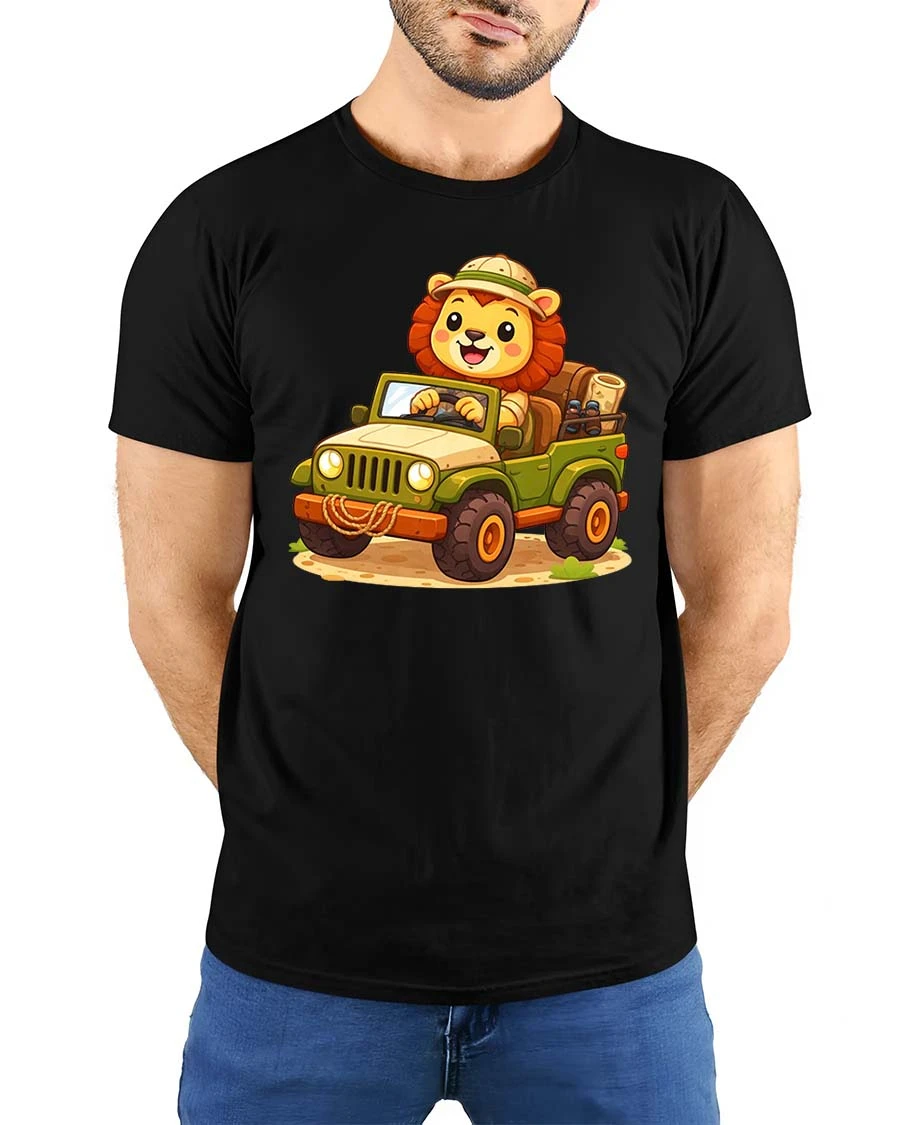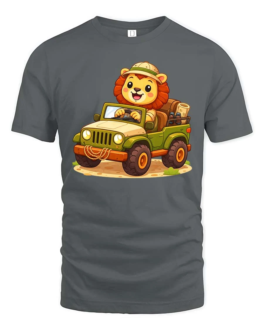 The Cute Safari Lion Jeep Cartoon Adventure Graphic T-Shirt features an adorable lion explorer driving a safari jeep on a fun jungle adventure.