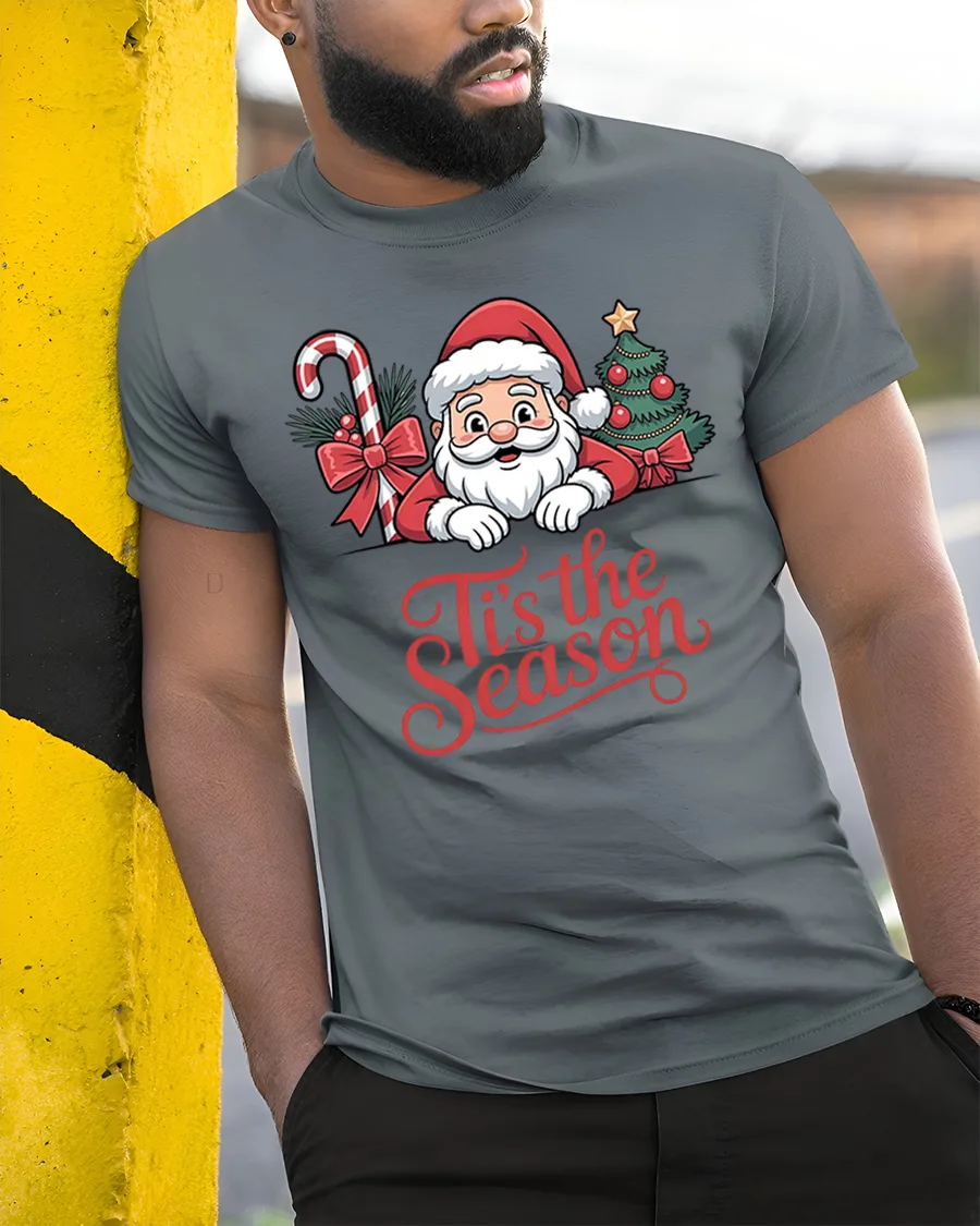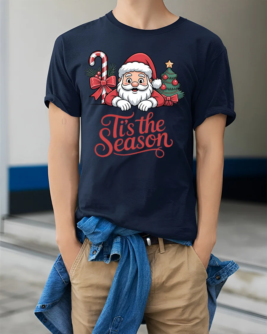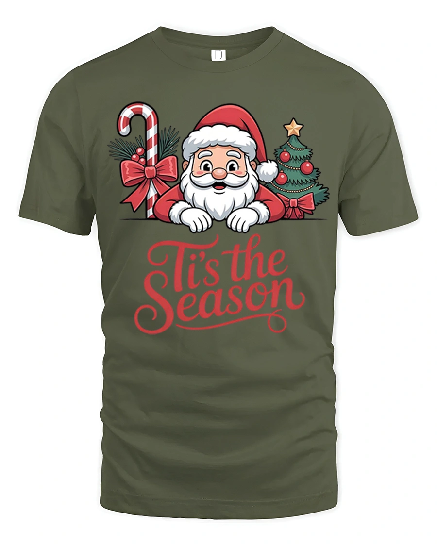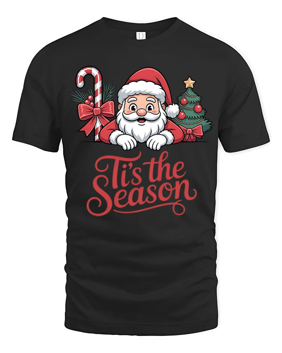 This Cute Santa Tis the Season Christmas Cheer Graphic T-Shirt is a joyful and festive way to celebrate the holiday season. Featuring a cheerful Santa surrounded by a candy cane with a bow and a decorated Christmas tree, the artwork brings classic holiday charm to life. The bright red “Tis the Season” lettering adds a warm and welcoming message that instantly puts you in a festive mood.
