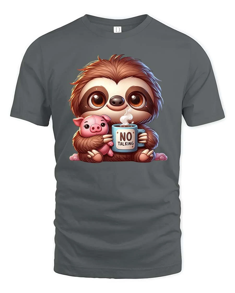This adorable graphic features a sleepy sloth cuddling a tiny pig while holding a warm cup of coffee that reads “No Talking,” capturing the true mood of early mornings.