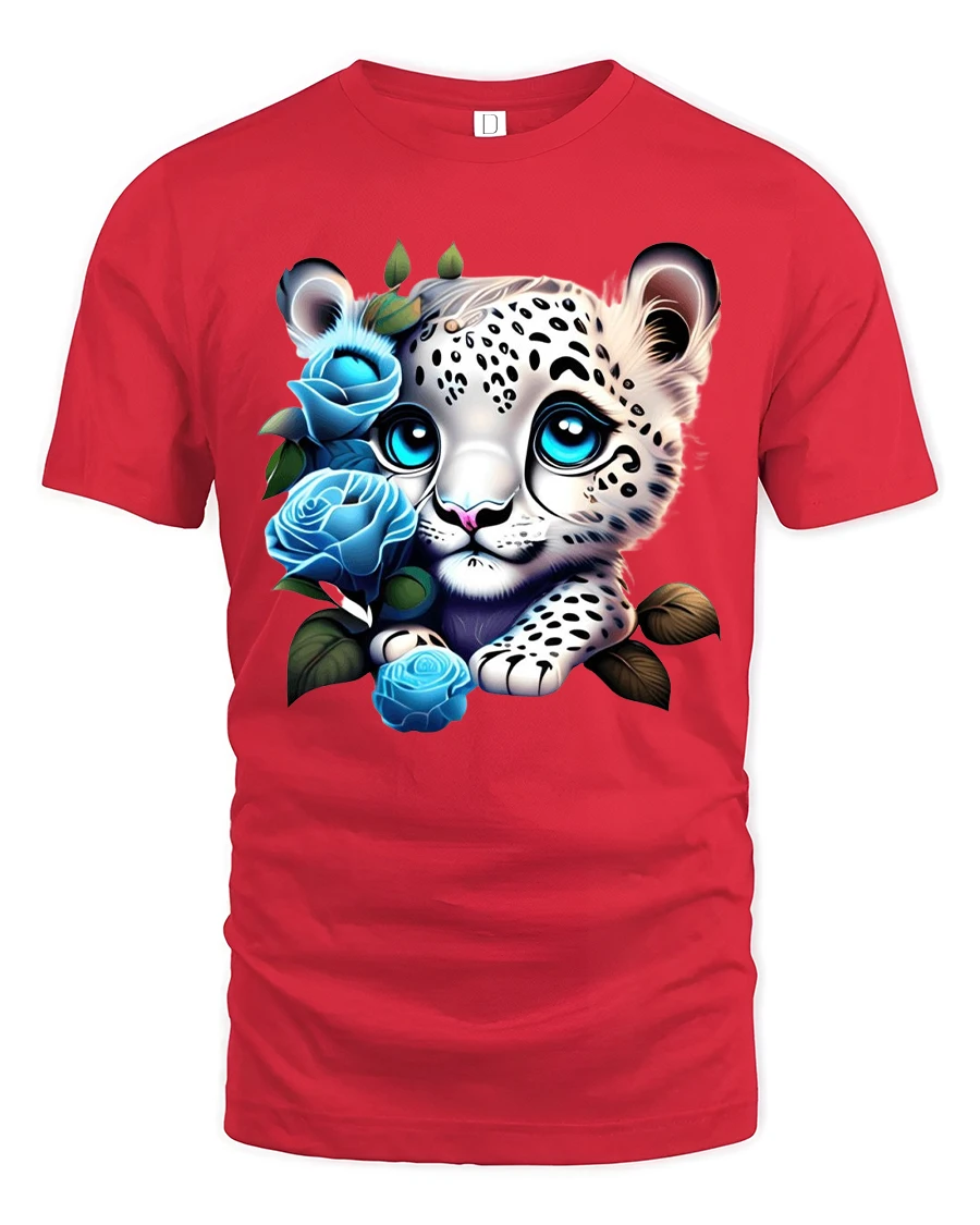 The Cute Snow Leopard Cub Blue Rose Fantasy Art Graphic Tee features an irresistibly adorable leopard cub paired with elegant blue roses.