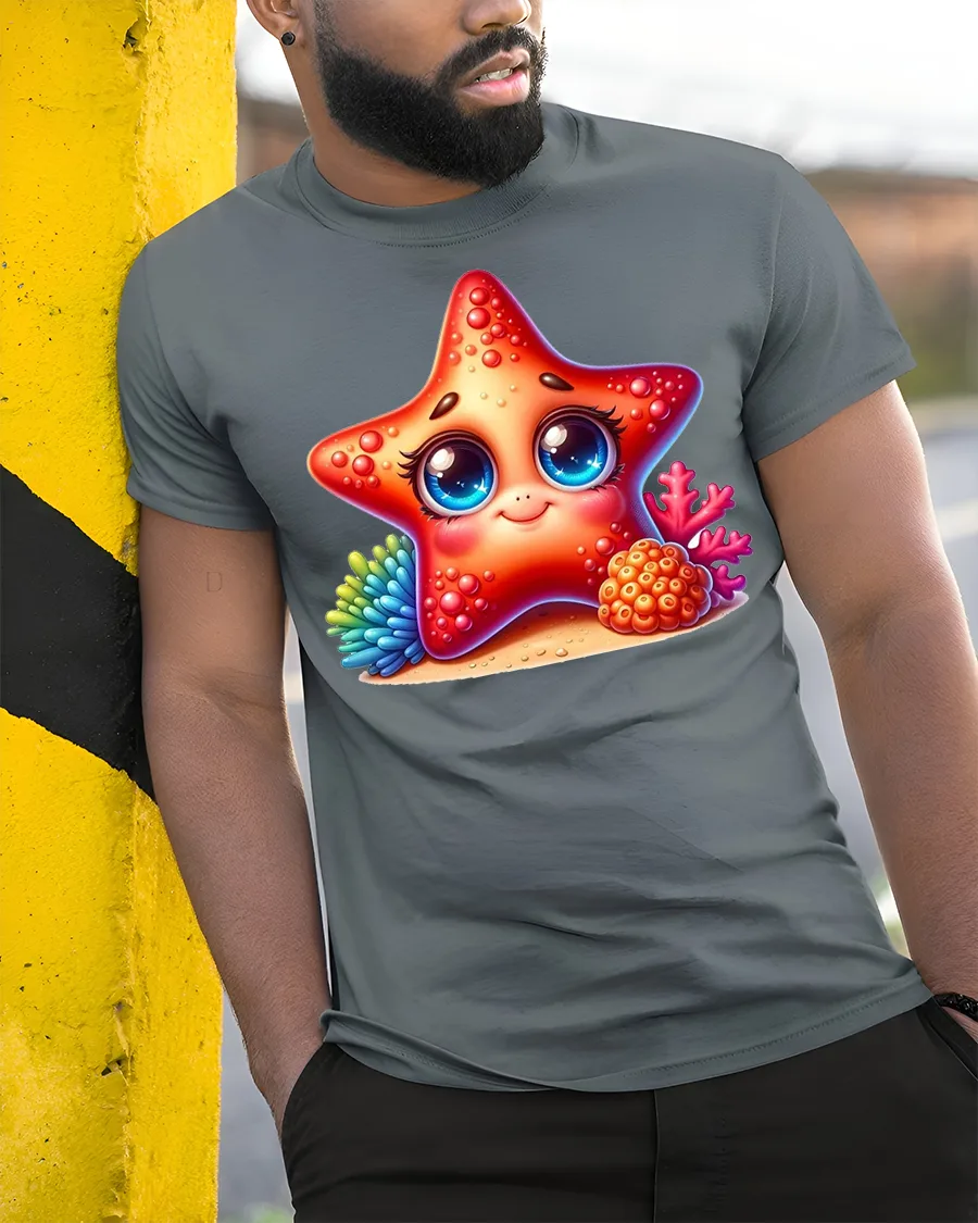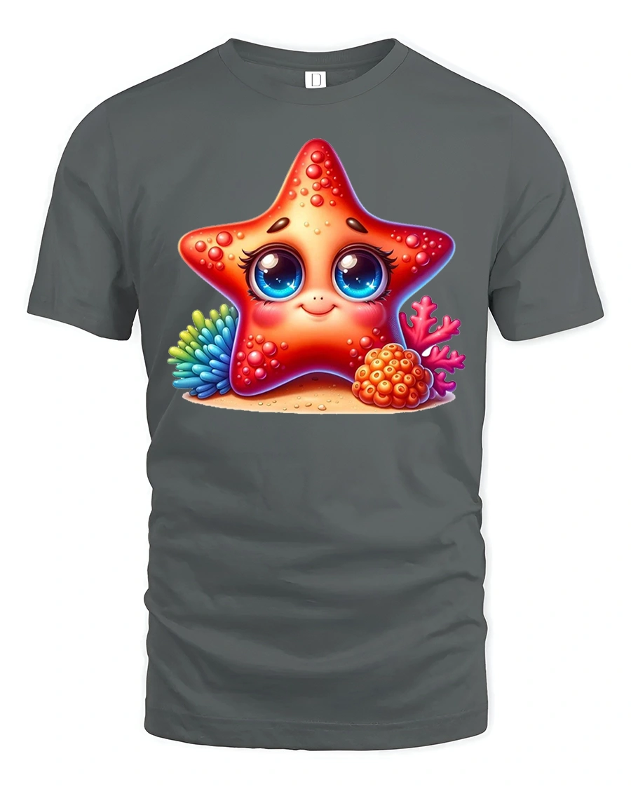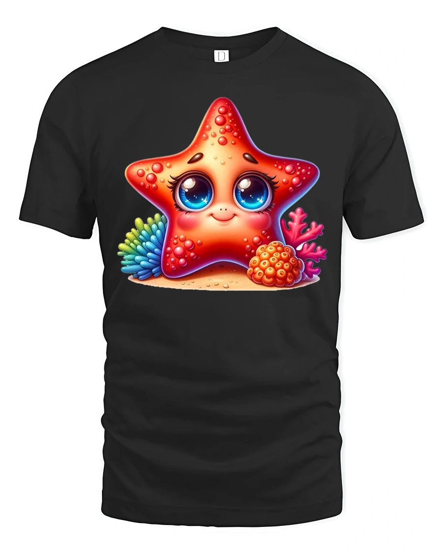 Cute Starfish Ocean Tee Adorable Coral Reef Cartoon Tshirt brings bright colors, cheerful energy, and ocean-themed charm to your everyday wardrobe. Designed with an irresistibly cute starfish character featuring big sparkling eyes, this tee captures the playful magic of underwater life. The vibrant coral details and colorful sea plants surrounding the starfish add a fresh, tropical feel that stands out beautifully.