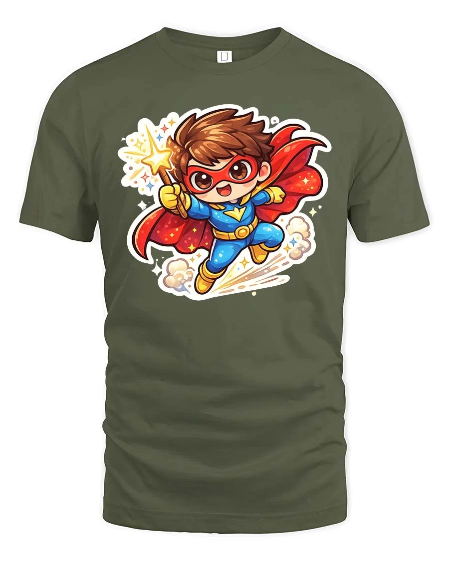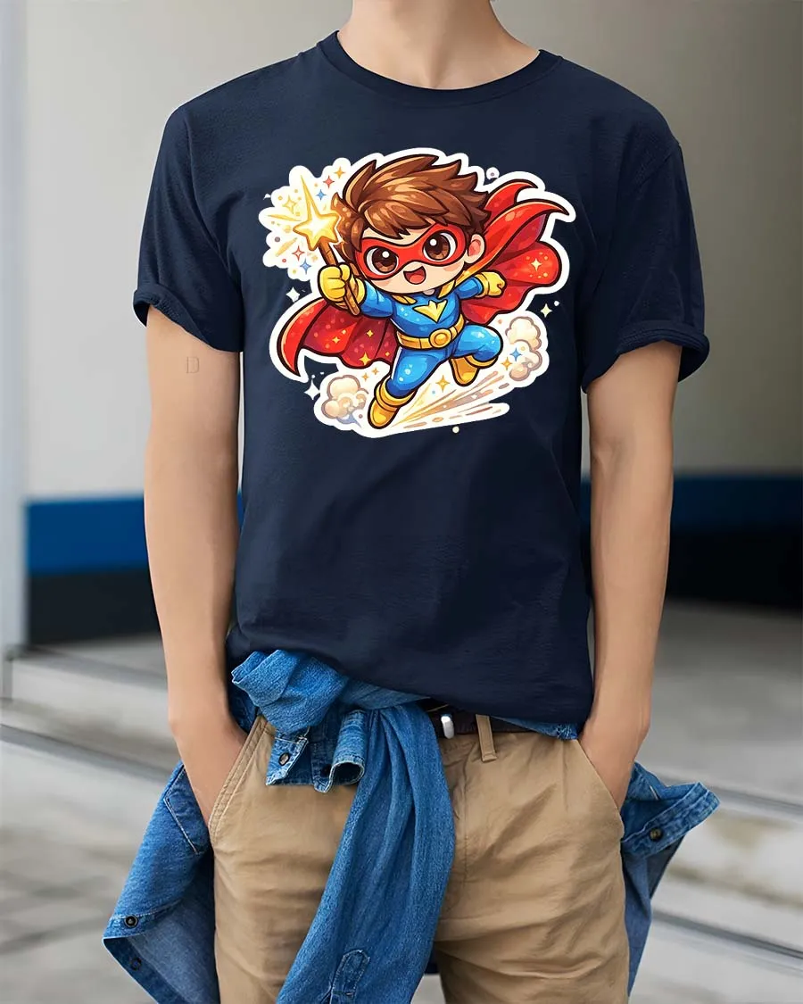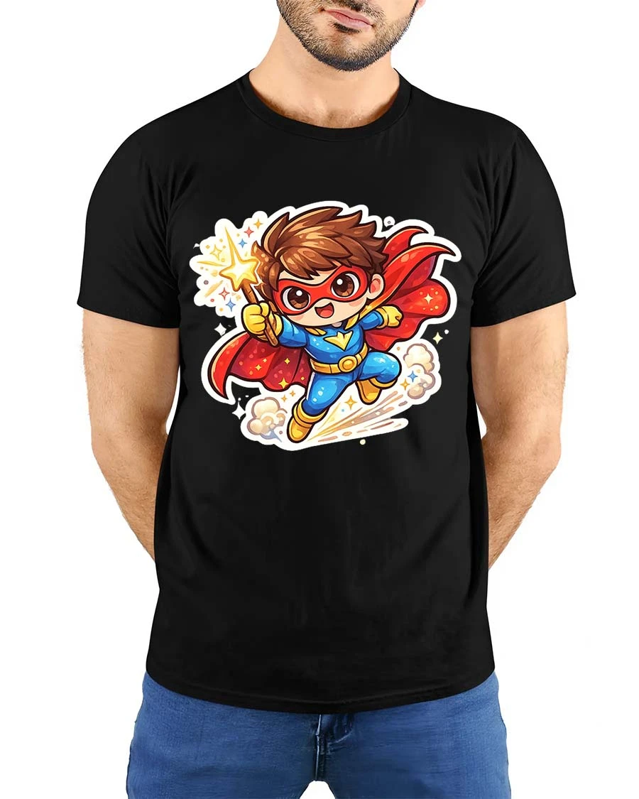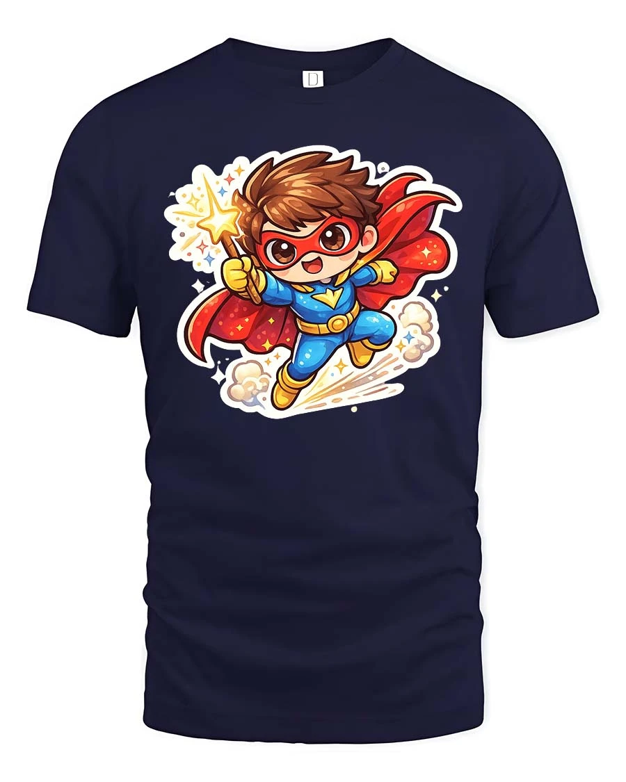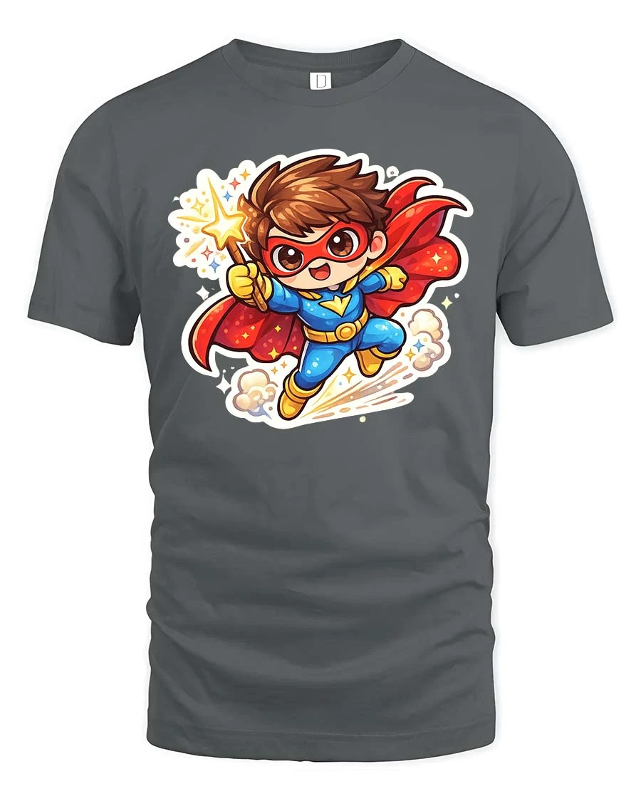Featuring an adorable cartoon superhero with a flowing cape and magical spark effect, this t-shirt captures the joy of adventure and creativity.