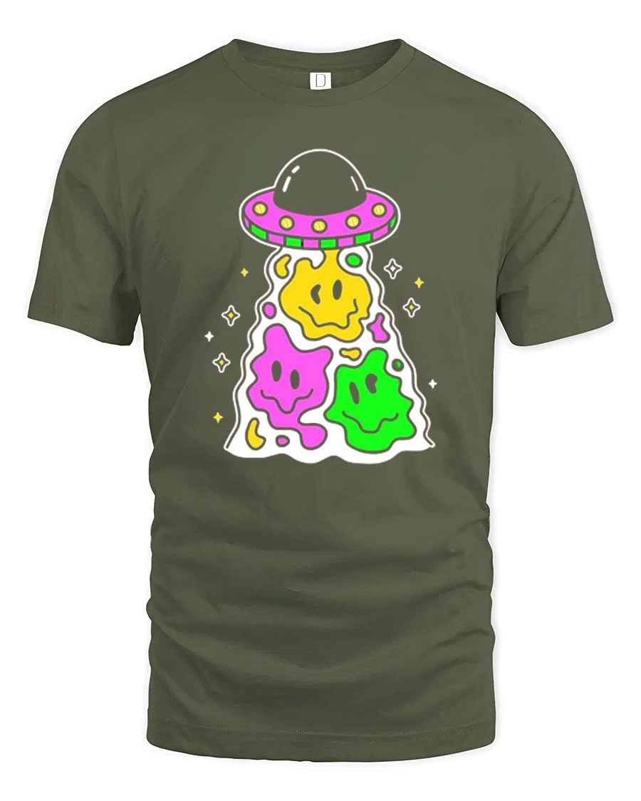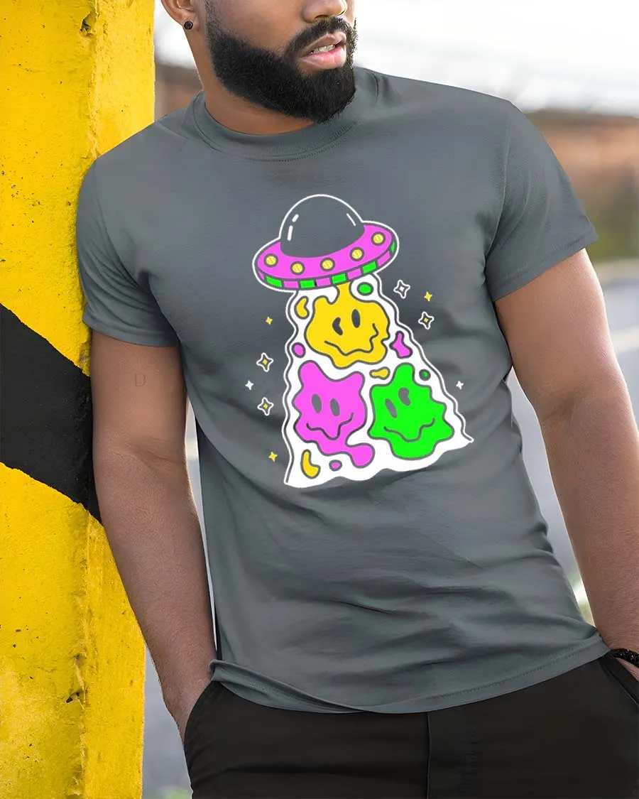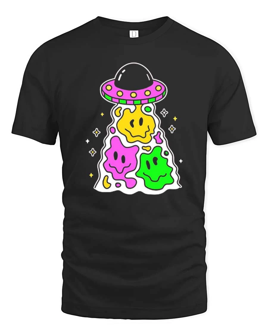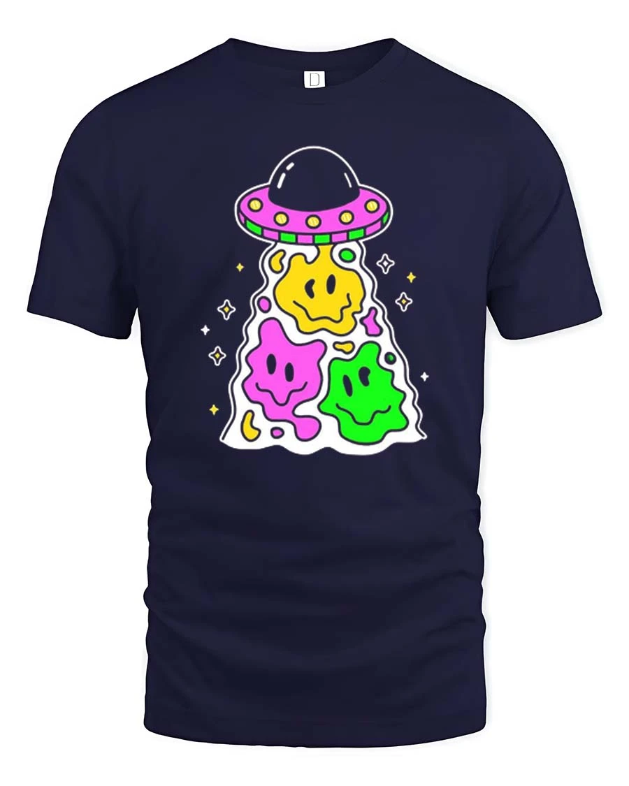 Cute UFO Smiley Alien Kawaii Cartoon Graphic T Shirt features a playful illustration inspired by fun space themes and colorful cartoon design.