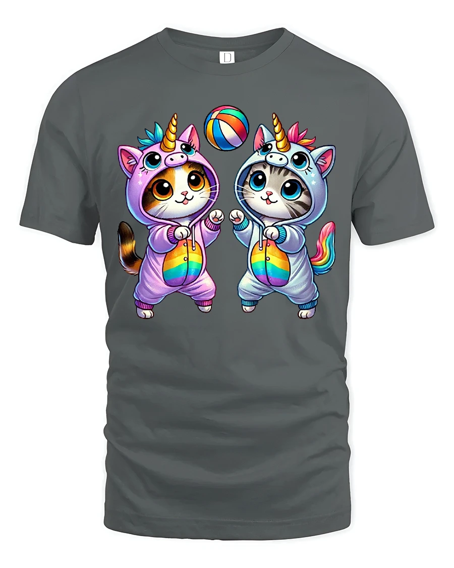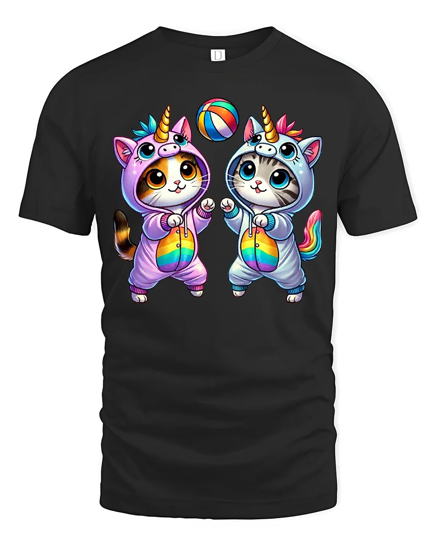 This Cute Unicorn Cat Duo Rainbow Playtime Kawaii T-Shirt brings colorful charm and joyful energy to your wardrobe. Featuring two adorable cats dressed in rainbow unicorn onesies while playing with a striped ball, the design captures the perfect mix of playful fantasy and irresistible cuteness. Their bright eyes, matching outfits and rainbow tails create an eye-catching artwork that fans of magical creatures and cute animals will love.