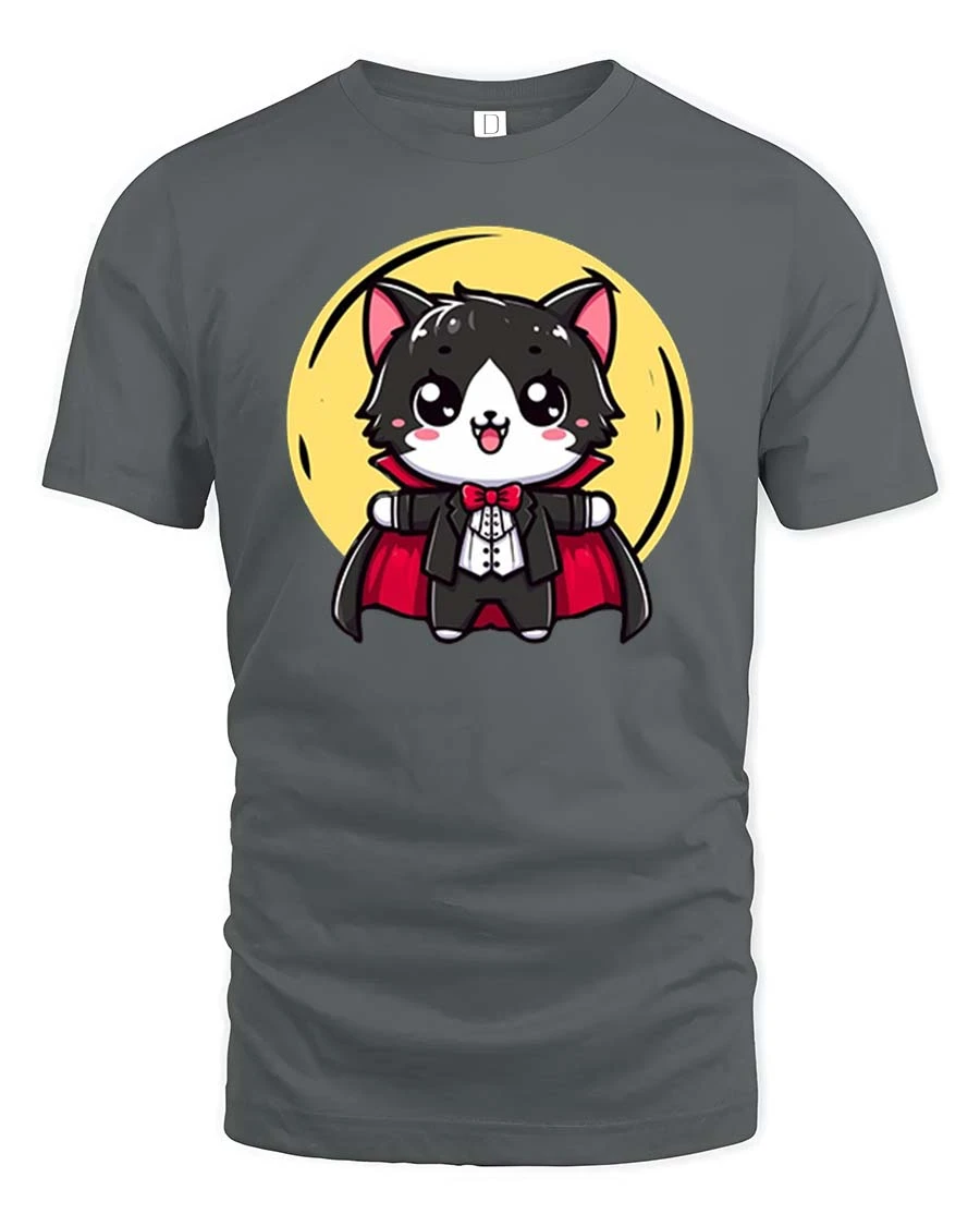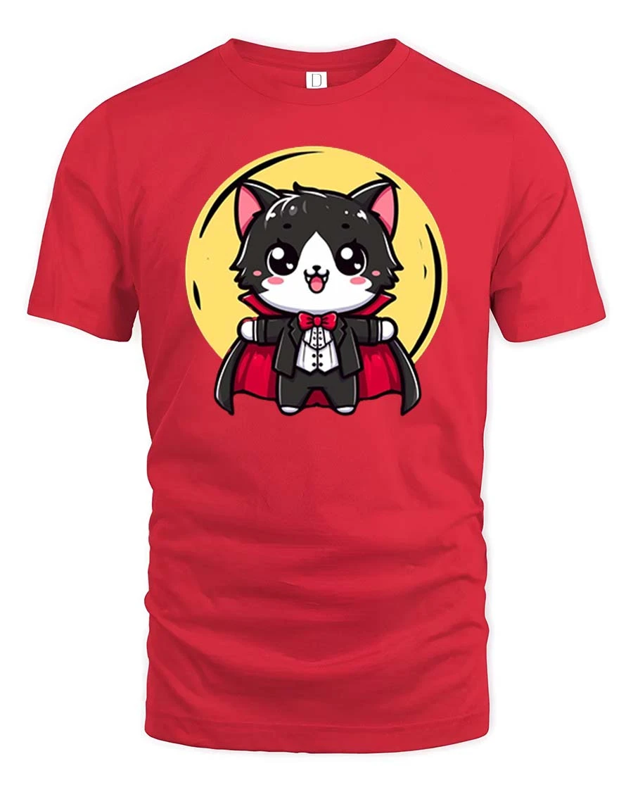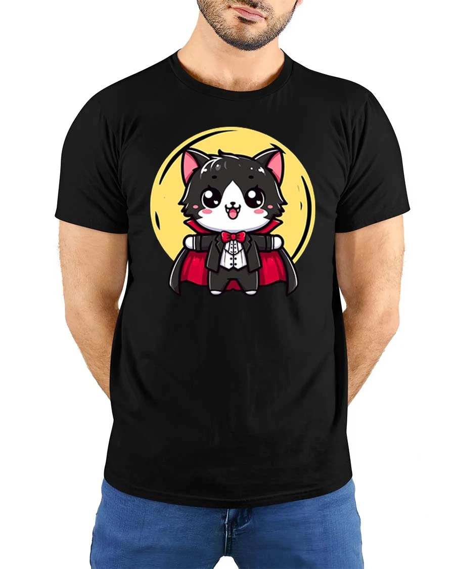 Cute Vampire Cat Cartoon Halloween Graphic T-Shirt Tee is ideal for those who enjoy charming spooky artwork and expressive graphic fashion.