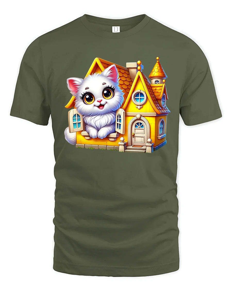 Cute White Cat Cozy Cottage Fairy Tale Cartoon Graphic Tee adds a touch of happiness imagination and charm to any casual outfit.