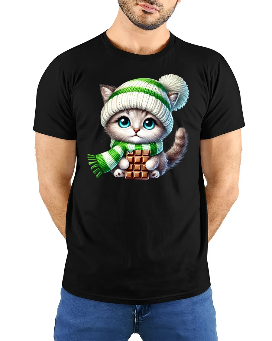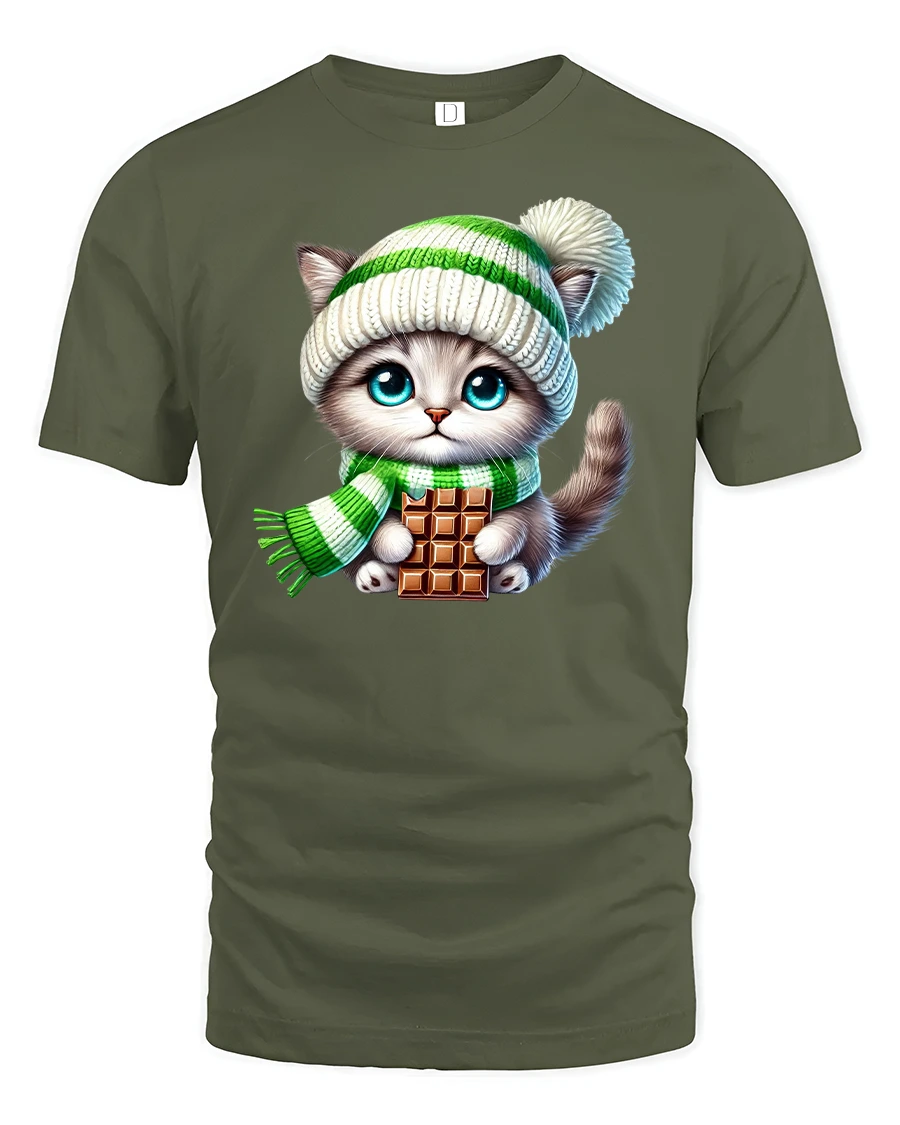 Cute Winter Kitten Chocolate Lover Cartoon Printed Tee brings warmth, sweetness, and style together in one adorable design. Featuring a wide-eyed kitten dressed in a cozy green beanie and scarf, holding a delicious chocolate bar, this tee captures the perfect winter vibe for cat and chocolate lovers alike.