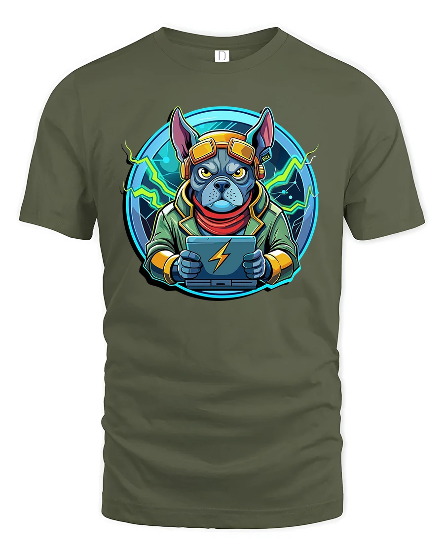 Cyber Gamer Dog Tee Futuristic Bulldog Gaming Tshirt brings an electrifying mix of gaming energy and cyberpunk attitude. Featuring a bold neon bulldog wearing goggles and gripping a high-tech controller, this tee is perfect for gamers who love unique character designs and futuristic style. The bright electric colors and vibrant digital theme make it stand out effortlessly in any casual or gaming setting.
