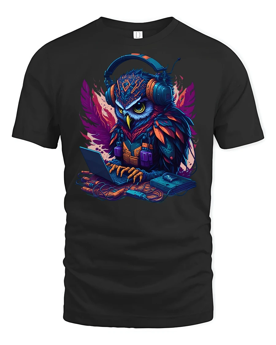 Cyber Owl Hacker Gamer Graphic Art Print T-Shirt blends cutting-edge design with bold animal art, perfect for gamers, tech lovers, and owl enthusiasts. Featuring a fierce, neon-colored owl wearing headphones and typing away on a laptop, the design captures the energy of both intelligence and modern digital culture.