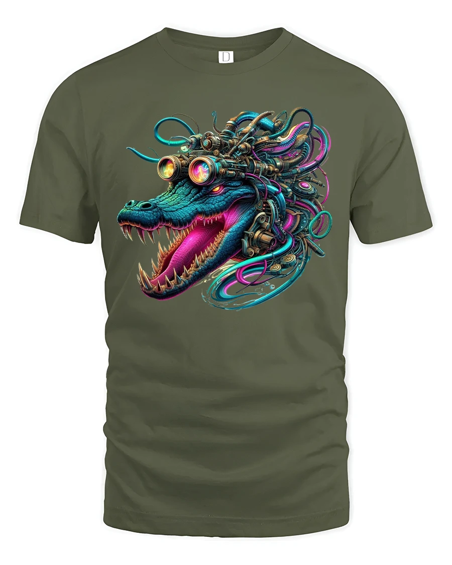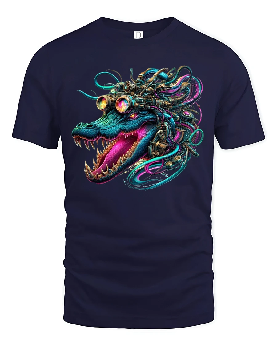Cyberpunk Alligator Head Graphic Print T-shirt is a bold and futuristic design that fuses wildlife with high-tech sci-fi aesthetics. The fierce alligator head, enhanced with neon colors, cyber cables, and glowing goggles, creates a unique look perfect for fans of cyberpunk style and edgy streetwear.
