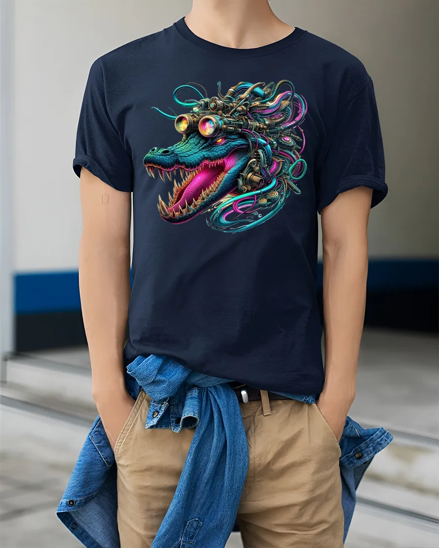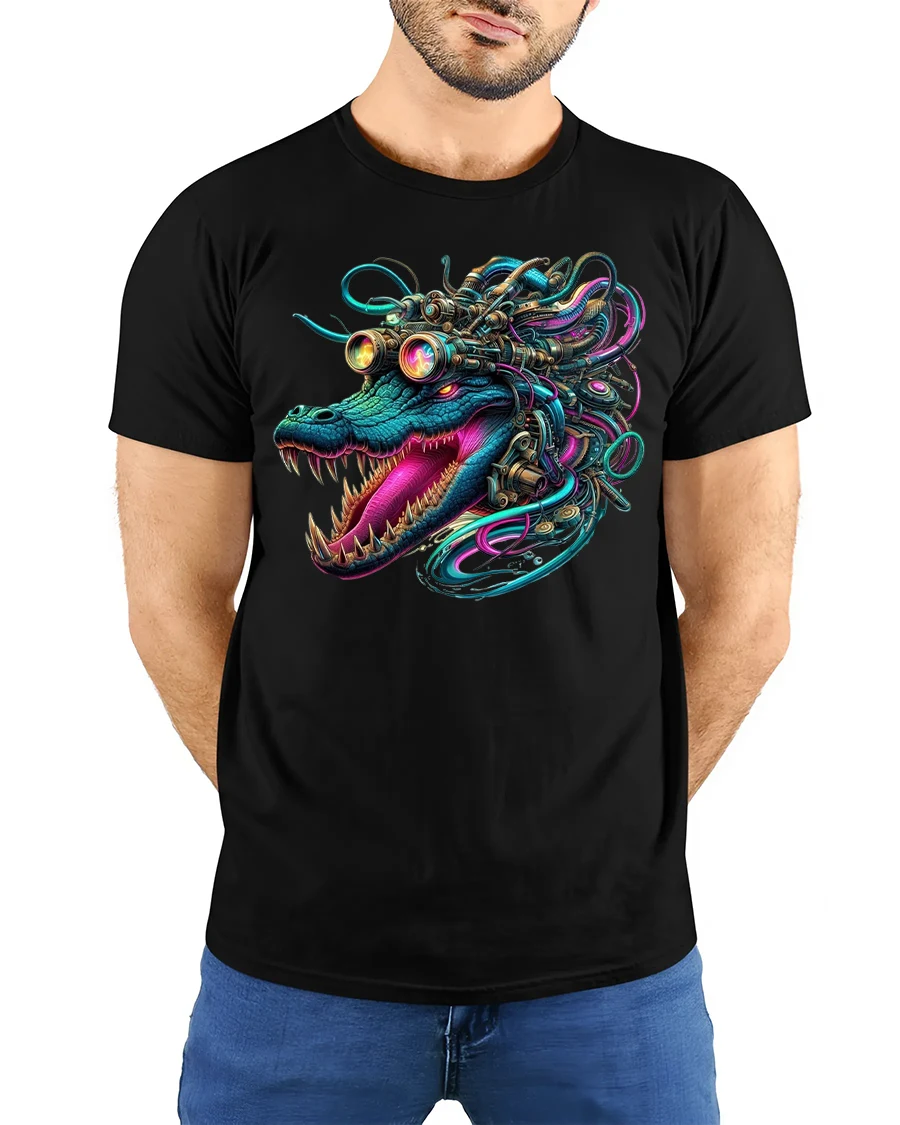 Ideal for US buyers who enjoy bold fashion and unique graphic designs, this futuristic crocodile graphic tee makes an excellent gift for gamers, sci-fi lovers, or streetwear enthusiasts. Pair it with jeans, joggers, or layered under a jacket for a complete cyberpunk-inspired outfit. Step into the future of fashion with this standout alligator design.