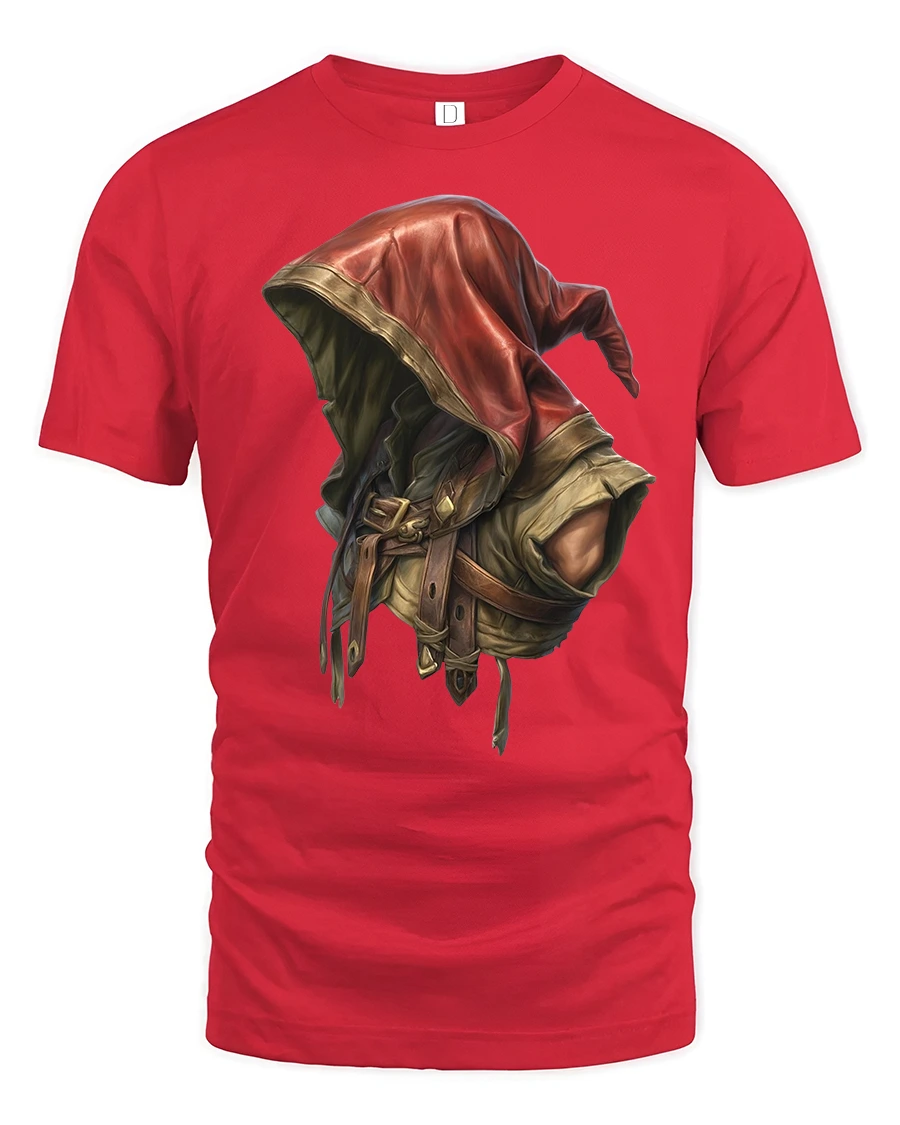 Dark Rogue Hooded Warrior Tee with Epic Fantasy Art Design - red t-shirt on white background