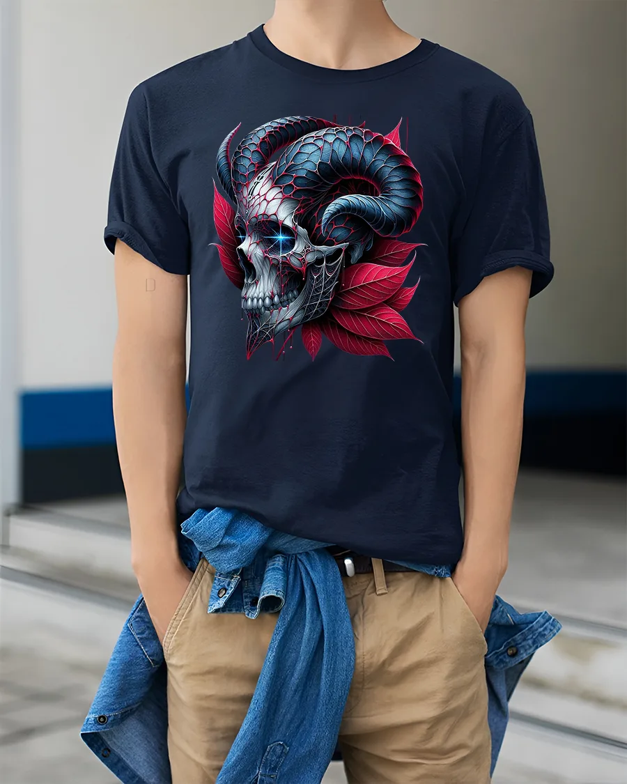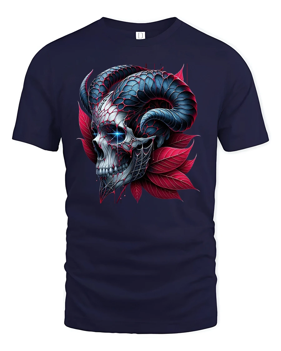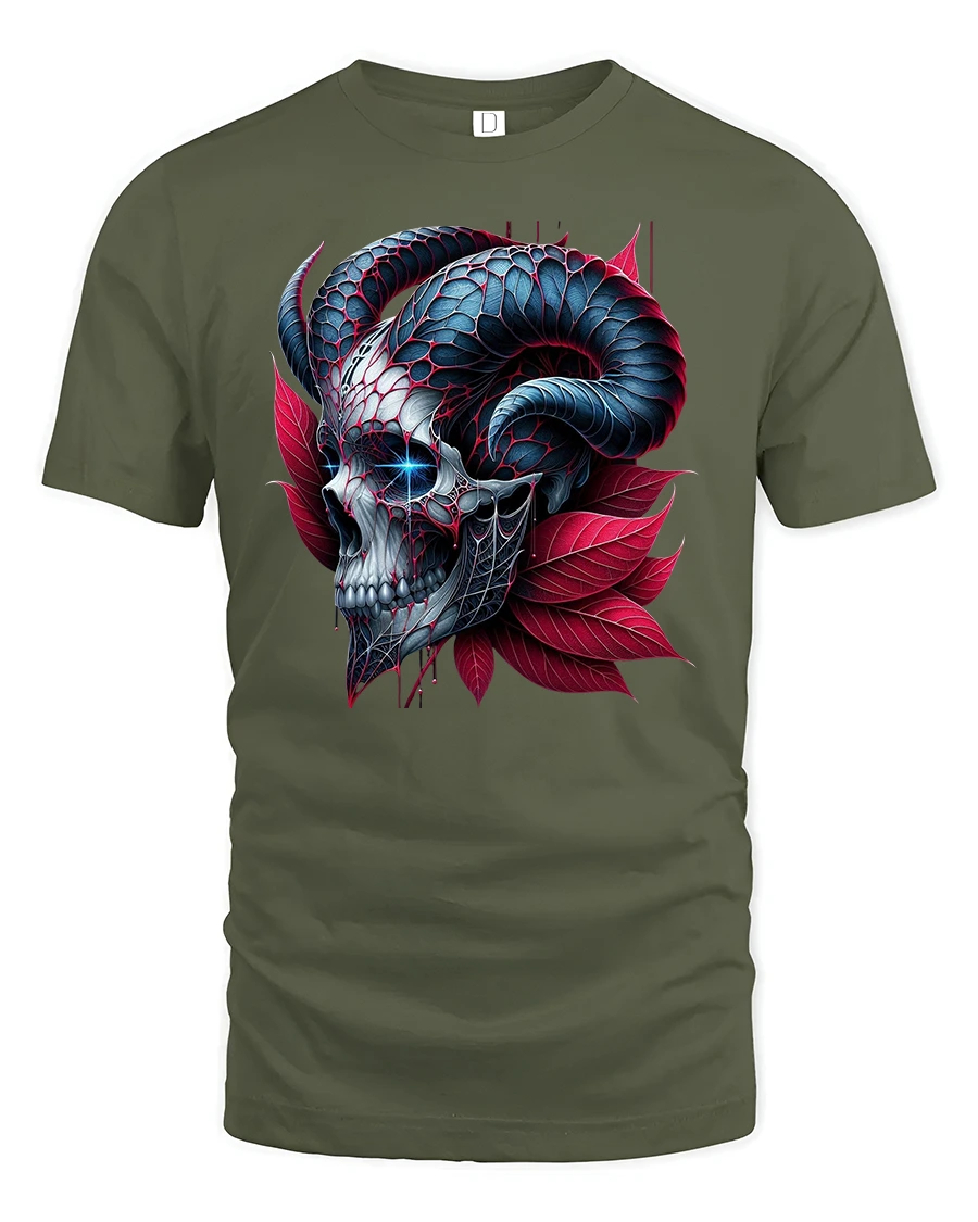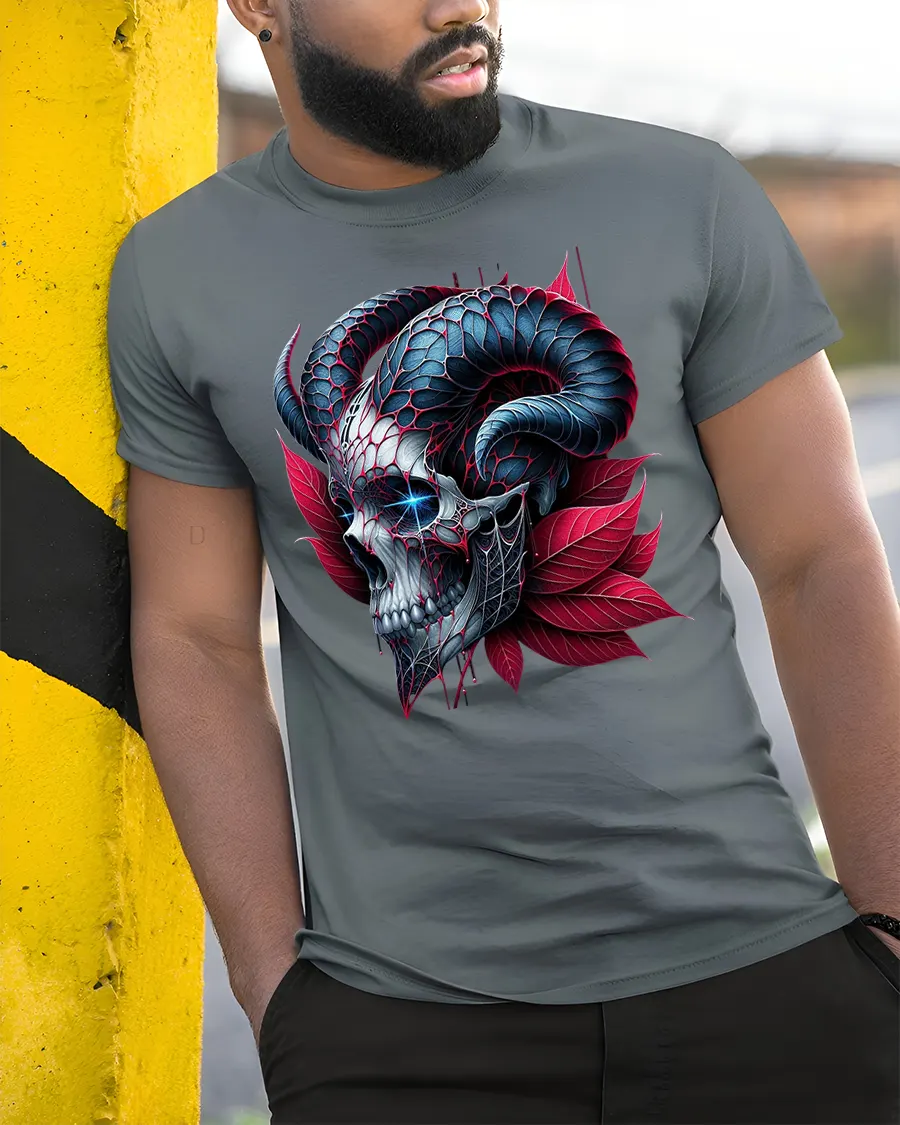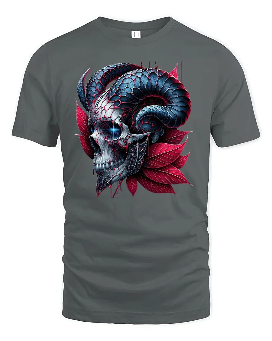 The Dark Skull Horns T-Shirt captures the essence of gothic fantasy with a bold, high-contrast skull design crowned by twisted ram horns and surrounded by red petals.
