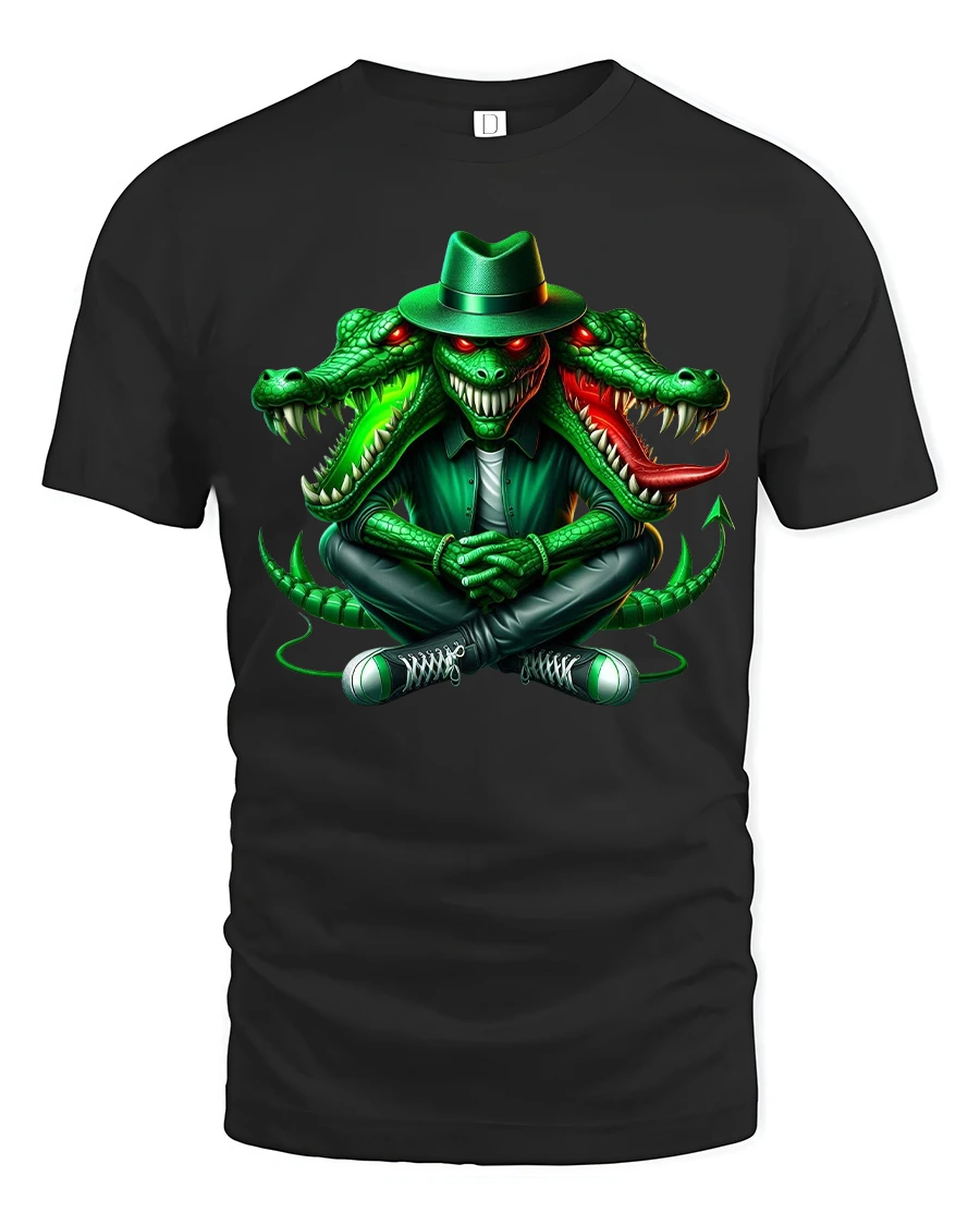 Featuring a fierce crocodile character with bold colors and intense expression, this design instantly commands attention.