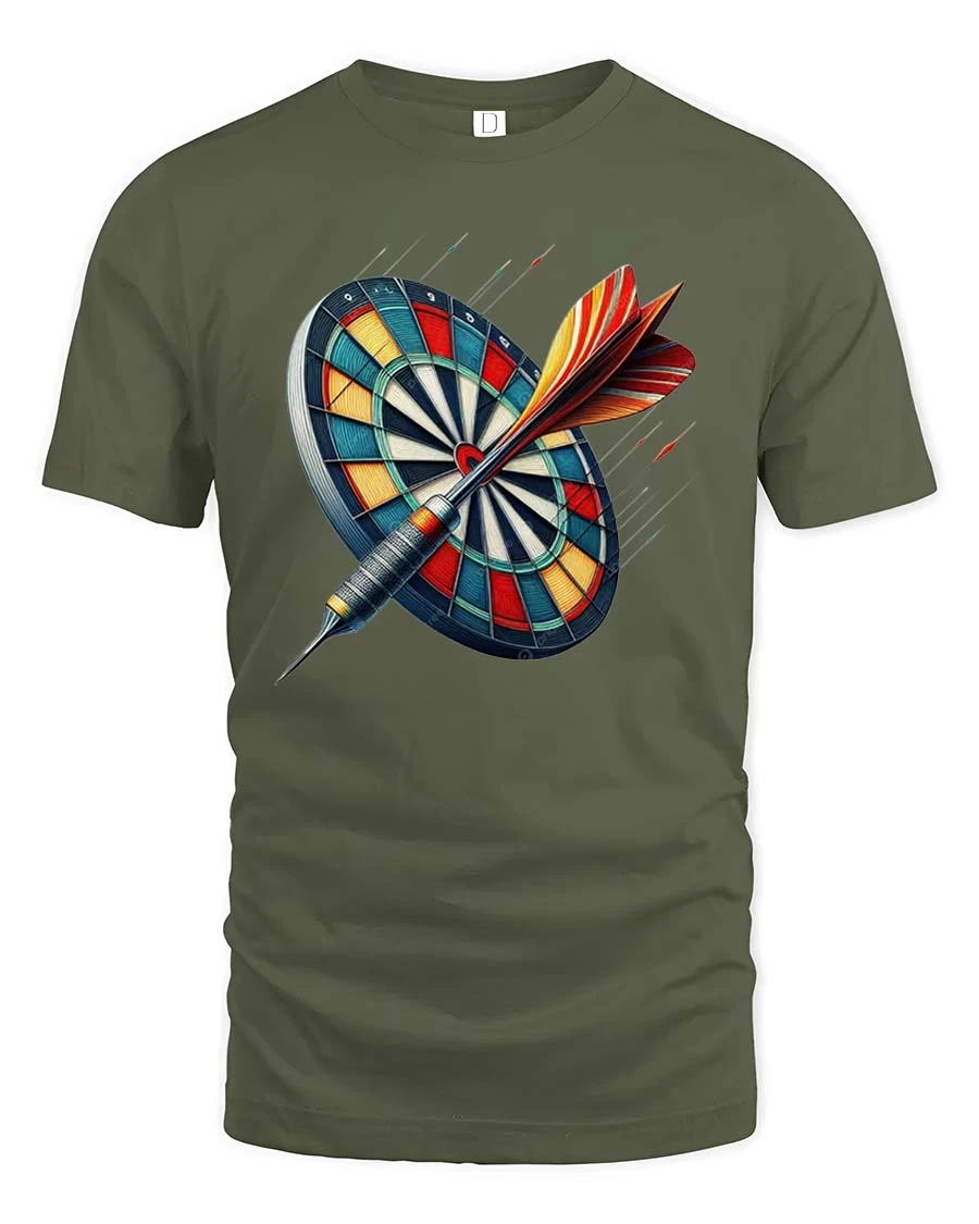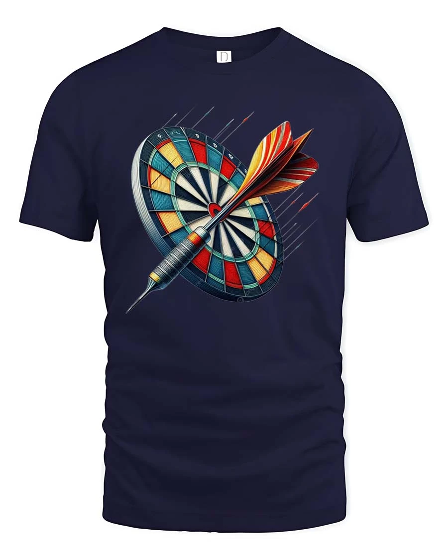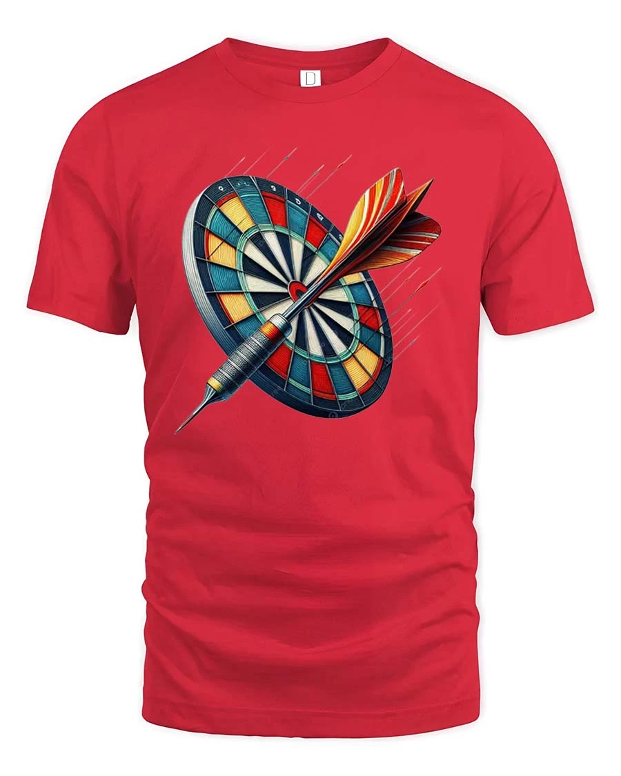 This dartboard bullseye t-shirt features a striking graphic of a dart hitting the center of a colorful dartboard.