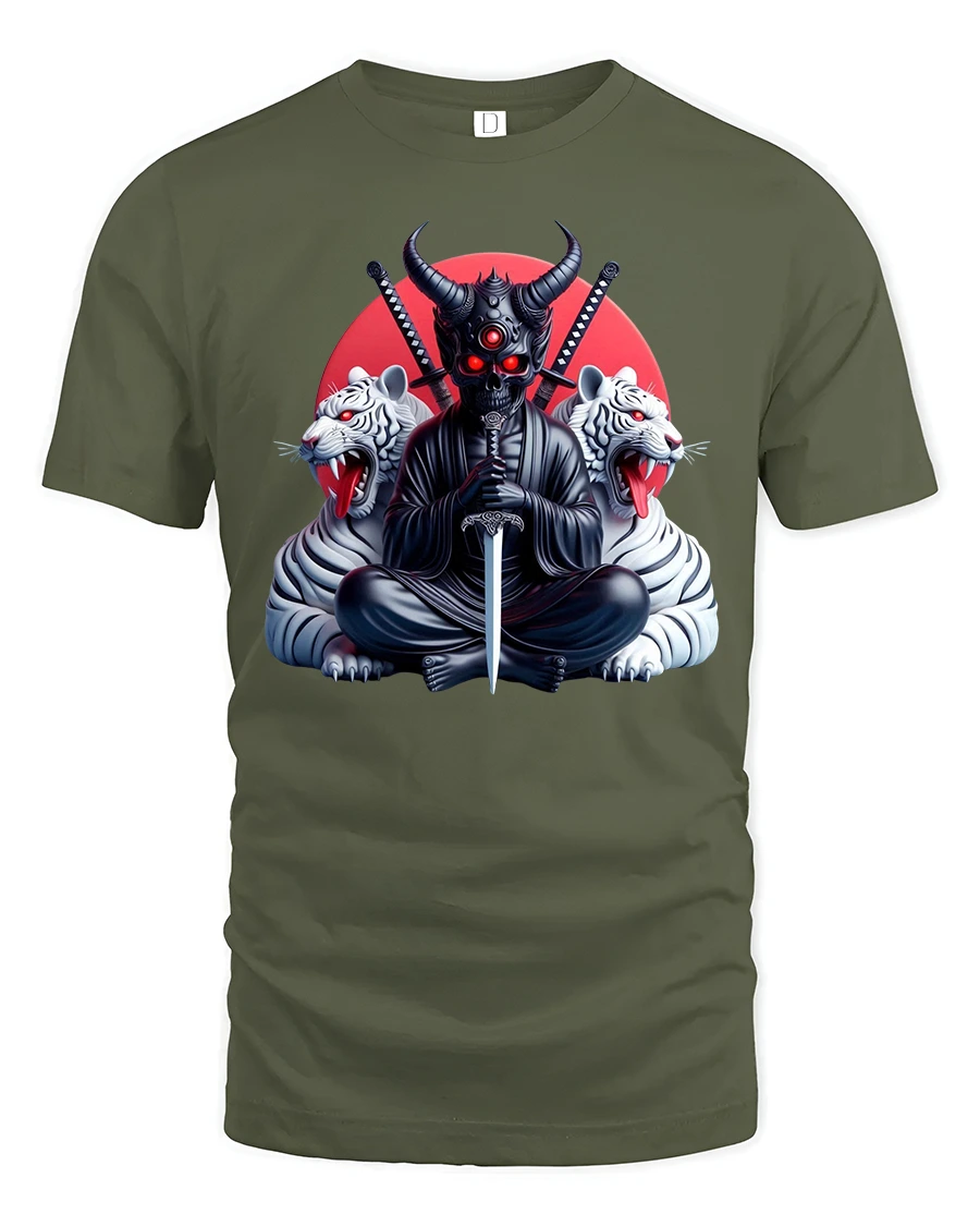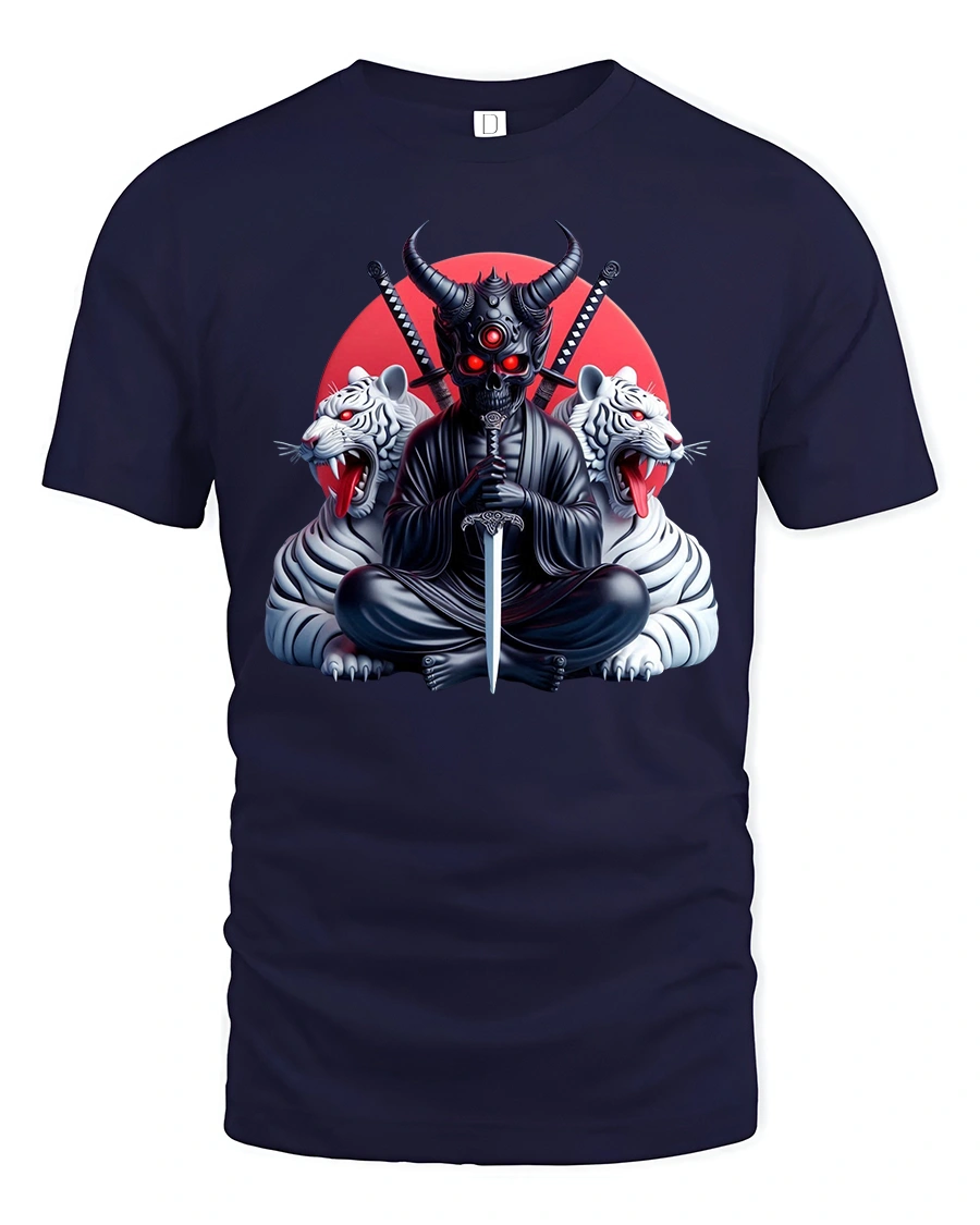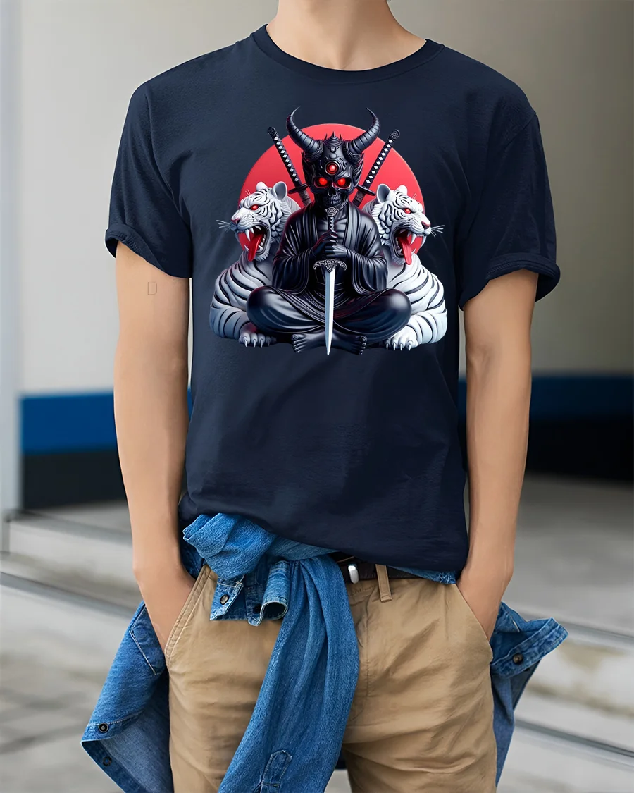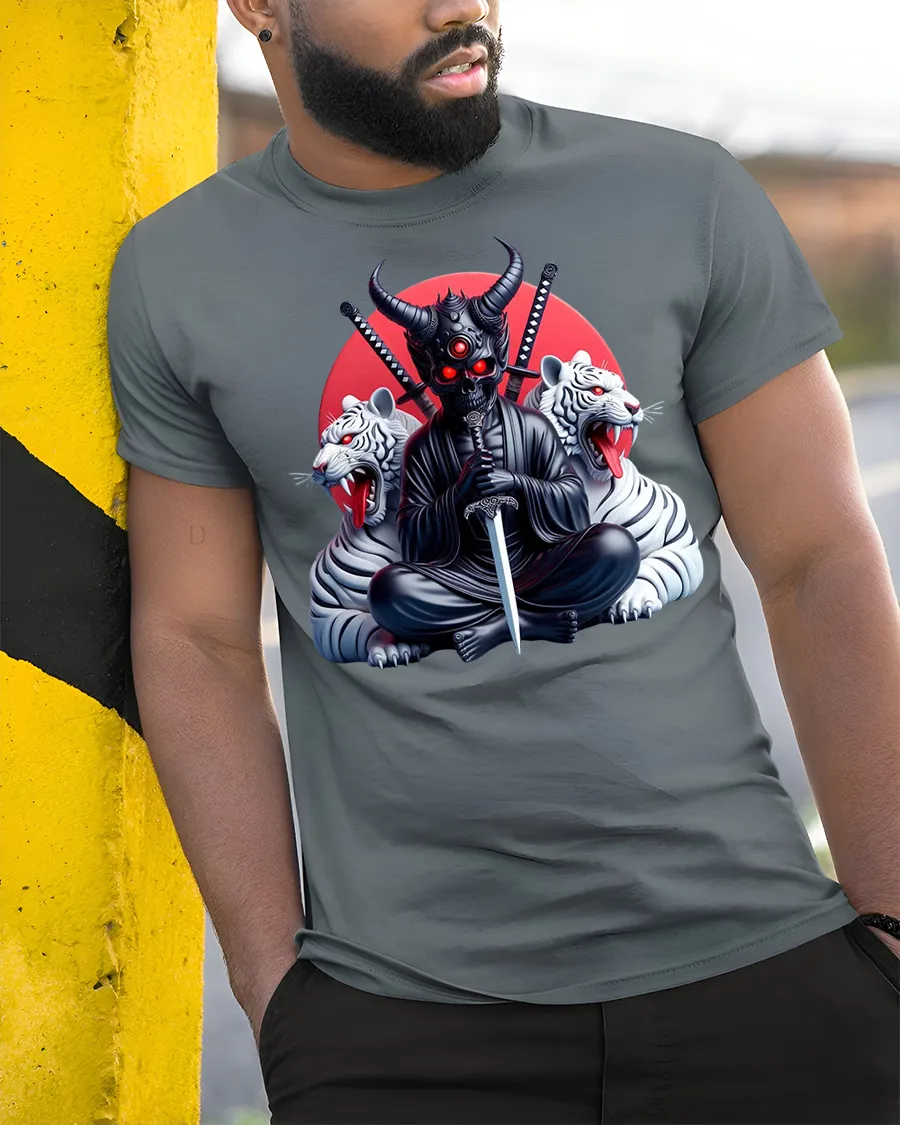 This samurai graphic tee features a striking demon warrior design inspired by Japanese mythology and anime aesthetics.