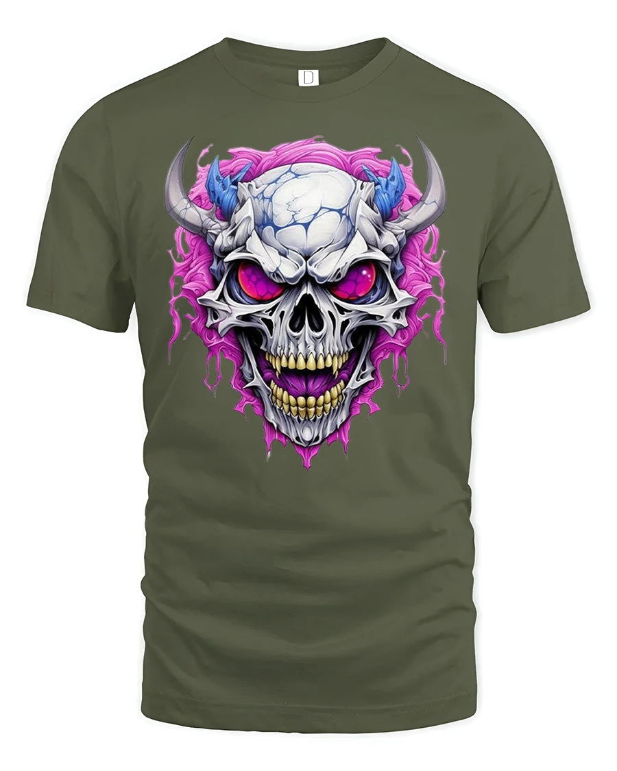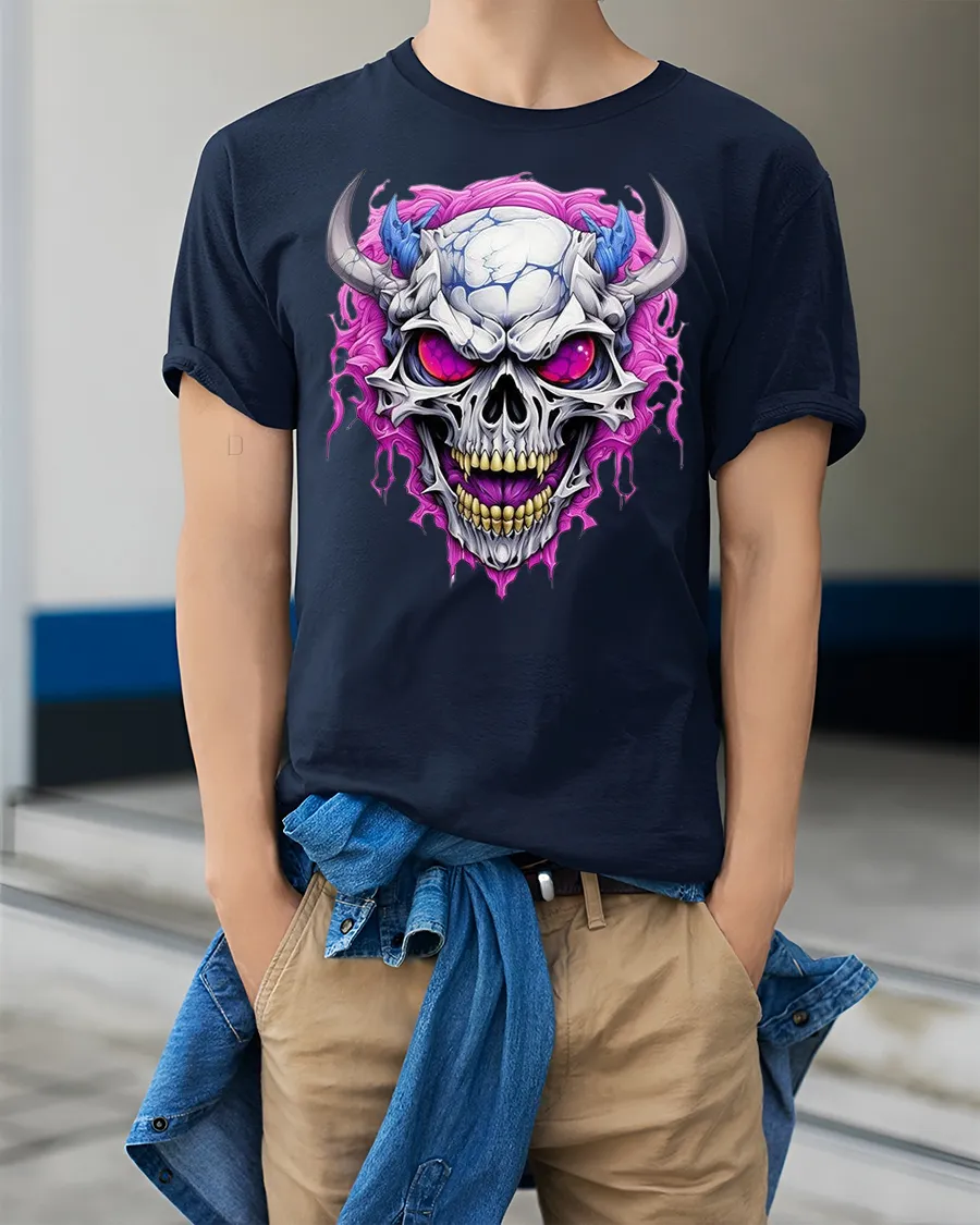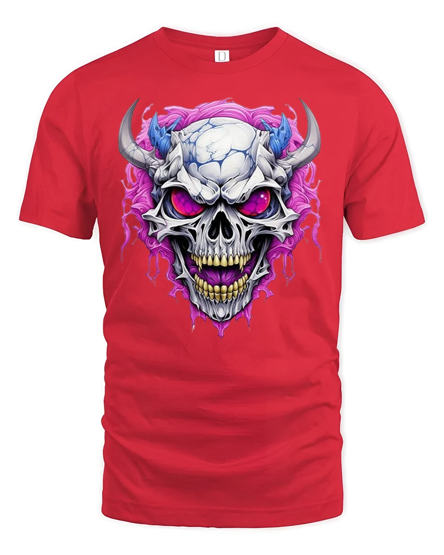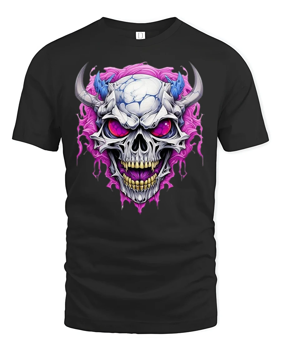 Demonic Horned Skull Tee Fierce Glowing Eyes Graphic Tshirt is designed for those who love intense dark artwork and bold gothic aesthetics. The striking design features a menacing horned skull with glowing purple eyes and vivid energy swirling around it, creating a powerful and fearsome look. The sharp details and vibrant colors make this piece a standout option for fans of dark fantasy, metal themes, and edgy graphic fashion.