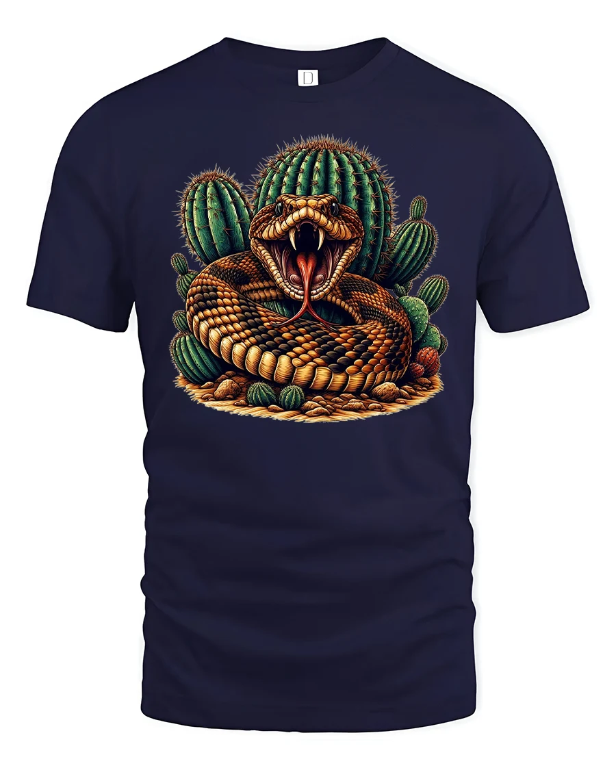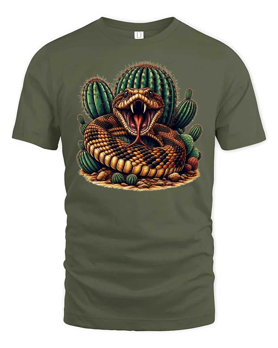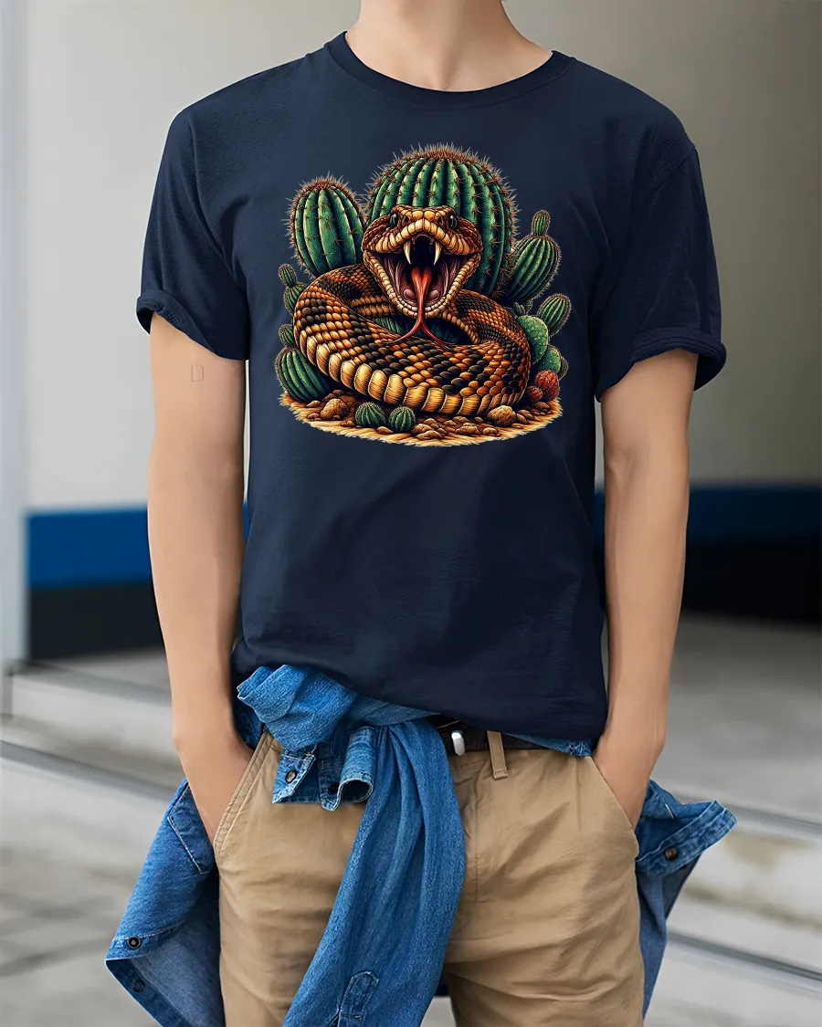 Desert Rattlesnake Cactus Graphic Wild Style T-shirt is a bold and fierce design made for those who love the untamed side of nature. Featuring a coiled rattlesnake with its fangs out and cactus backdrop, this tee combines desert grit with reptilian power for a unique fashion statement.