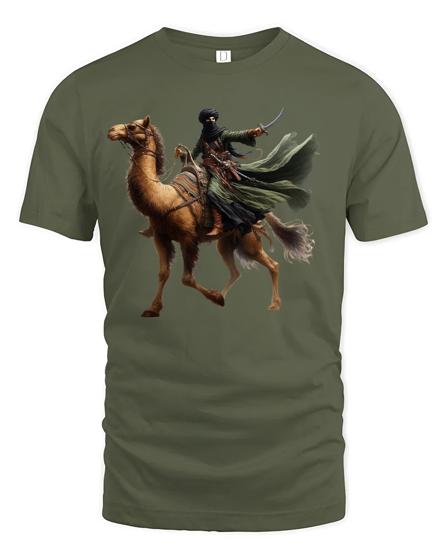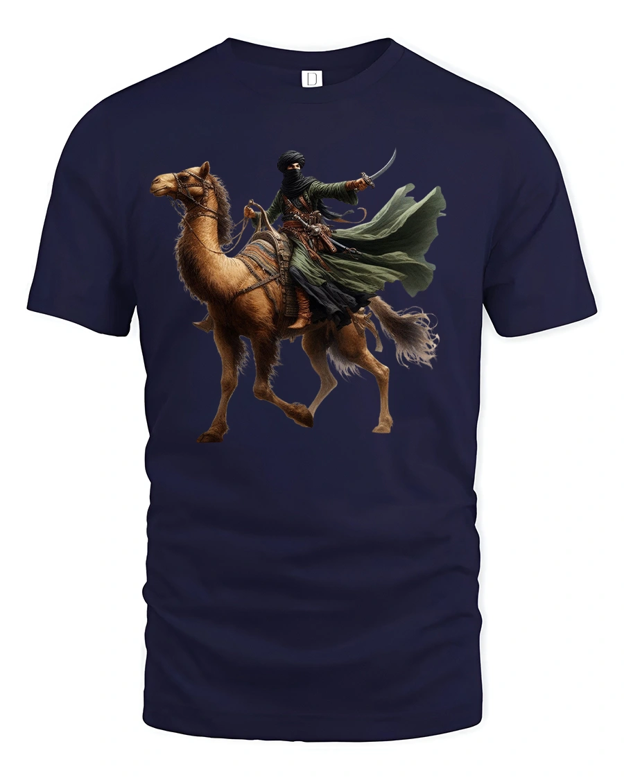 Ride through the sands of legend with the Desert Warrior Rider Epic Camel Adventure T-Shirt, a powerful tribute to courage, freedom, and timeless adventure. This bold graphic captures a fearless nomad warrior astride his camel, blade in hand and cloak flowing in the desert wind. Crafted from high-quality cotton, this t-shirt combines comfort, durability, and striking visual appeal.