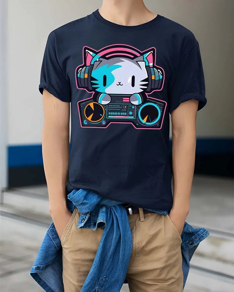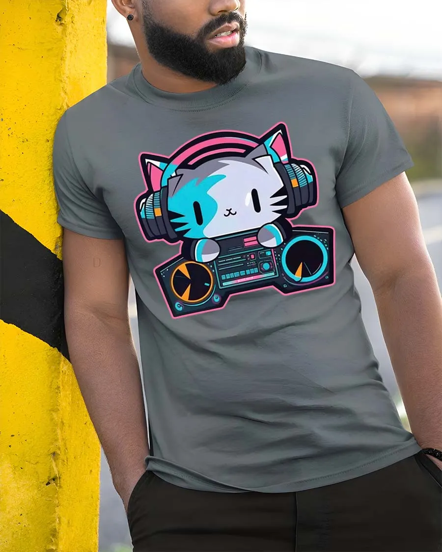This DJ cat graphic t-shirt is ideal for DJs, music lovers, and anyone who enjoys fun cartoon designs.