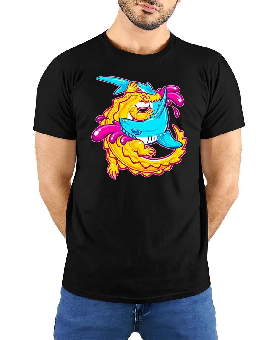 Featuring a vibrant dragon intertwined with a fierce shark, this t-shirt delivers an eye-catching blend of fantasy and ocean energy.