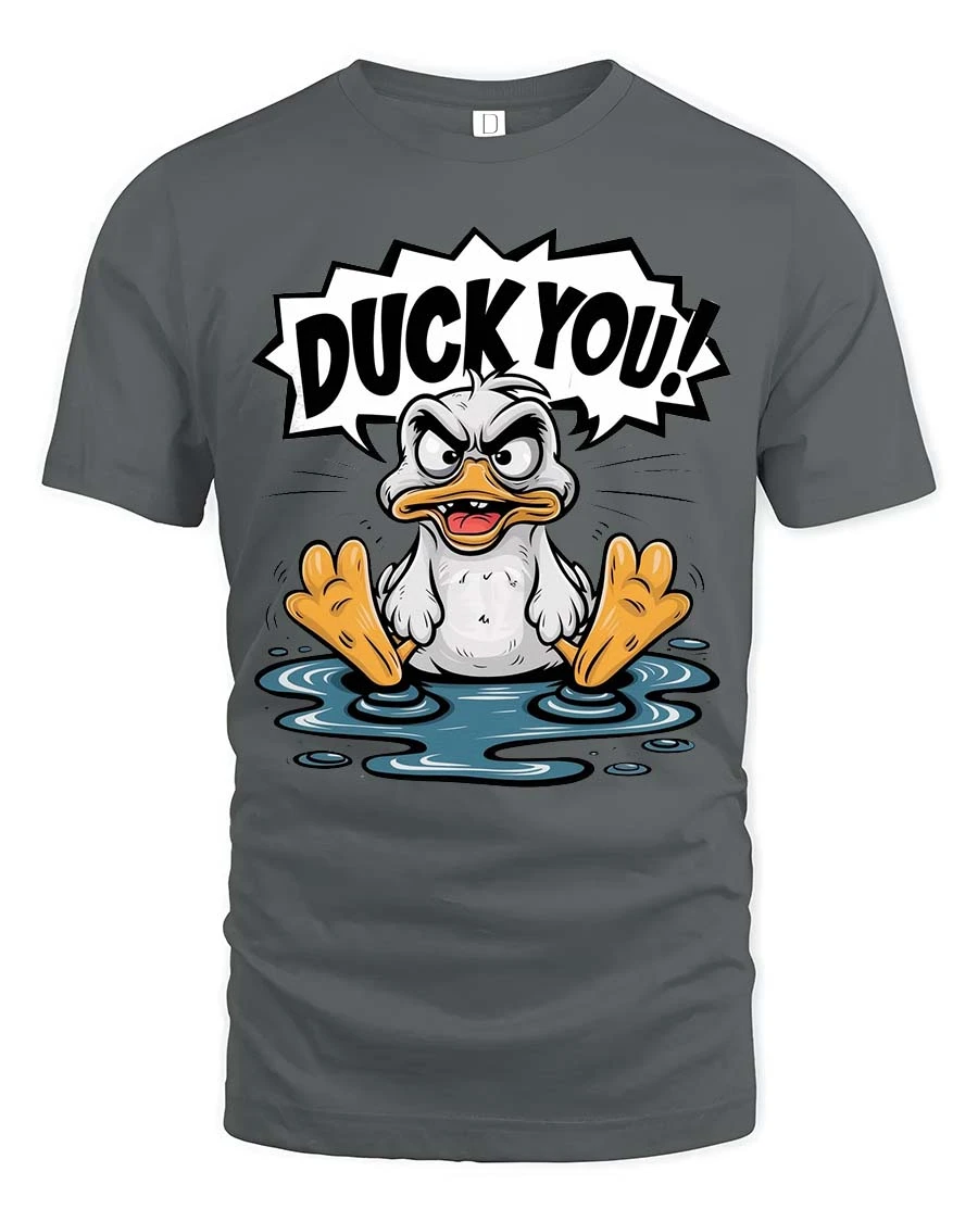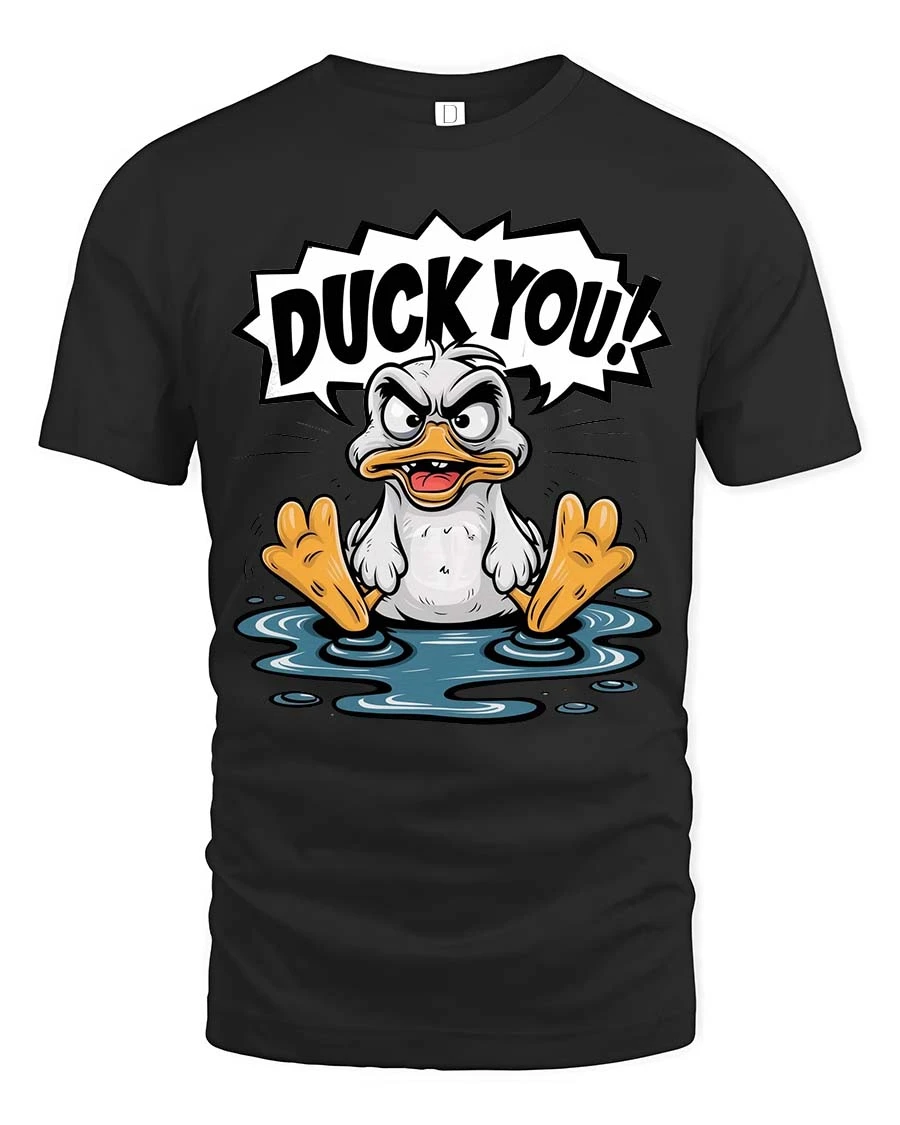 The Duck You Funny Angry Duck Graphic T-Shirt Humor Cartoon Tee features a hilarious cartoon duck with an angry expression sitting in water while shouting the playful phrase “Duck You!”.