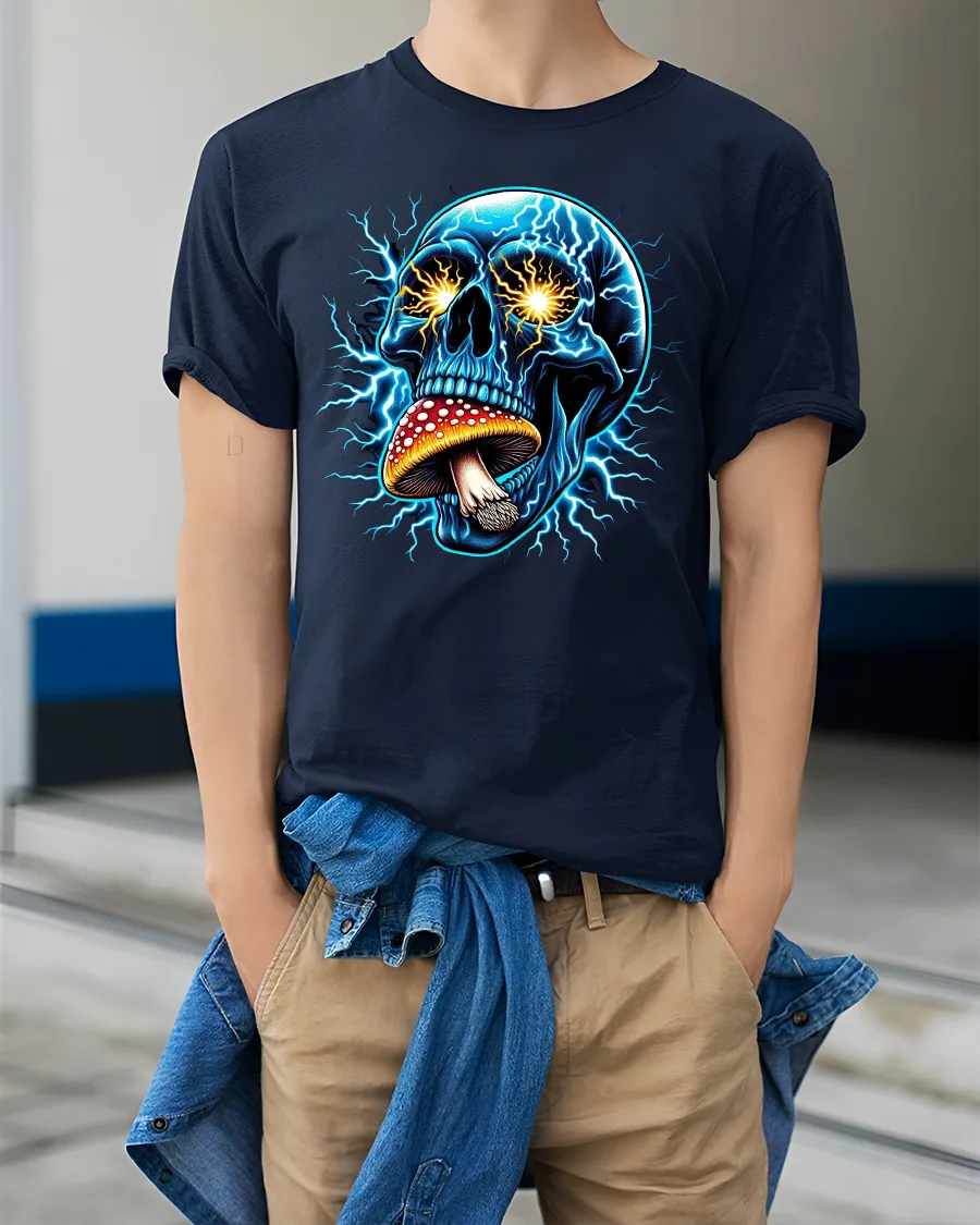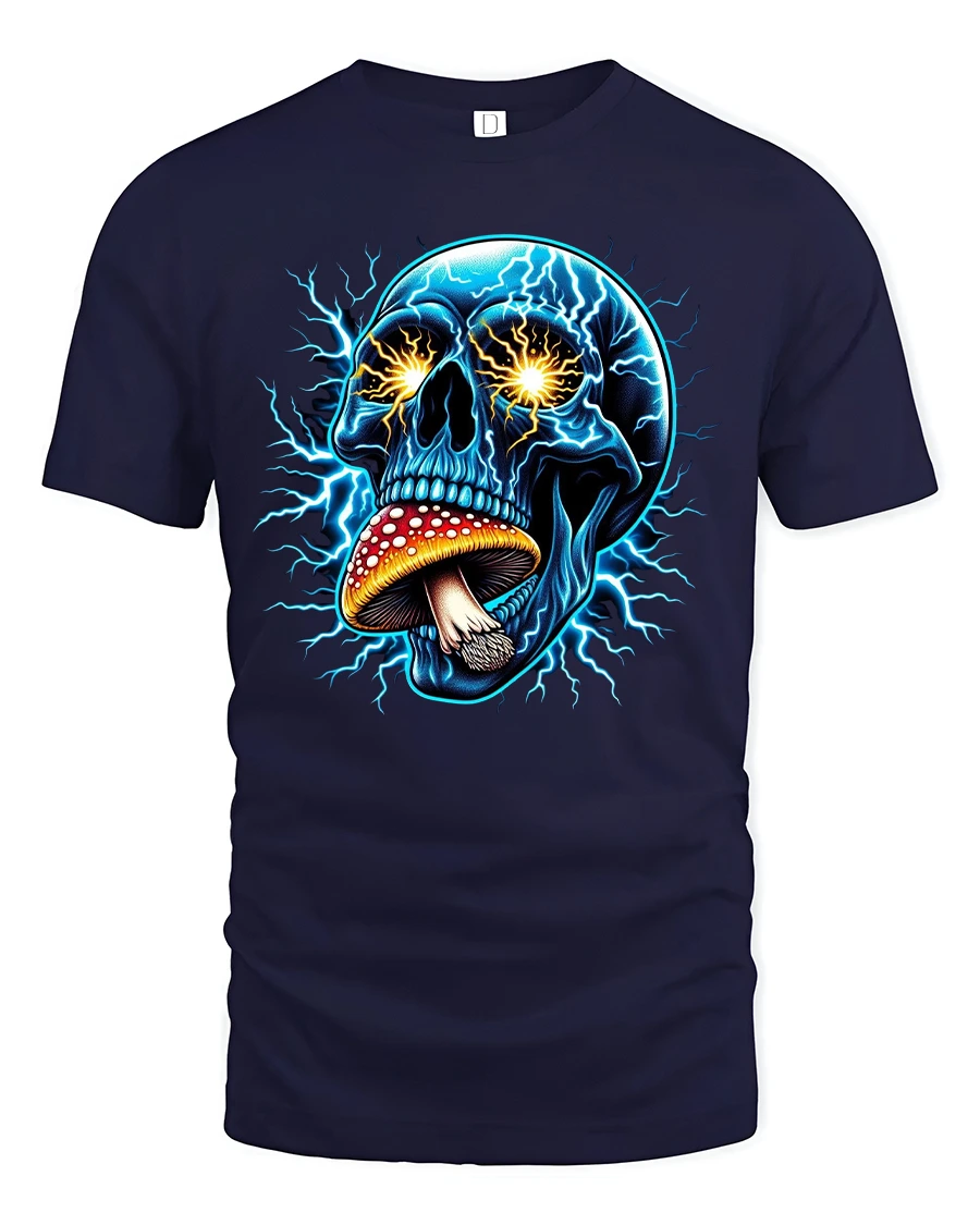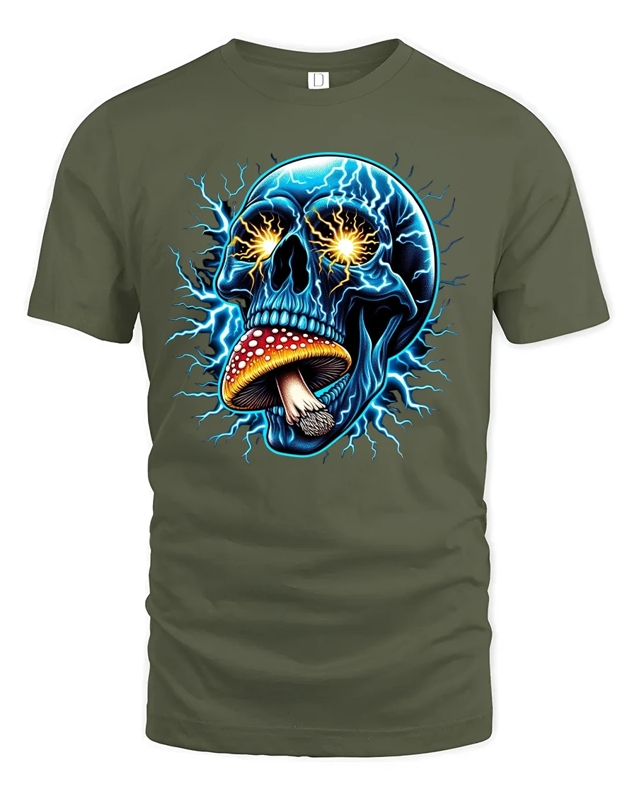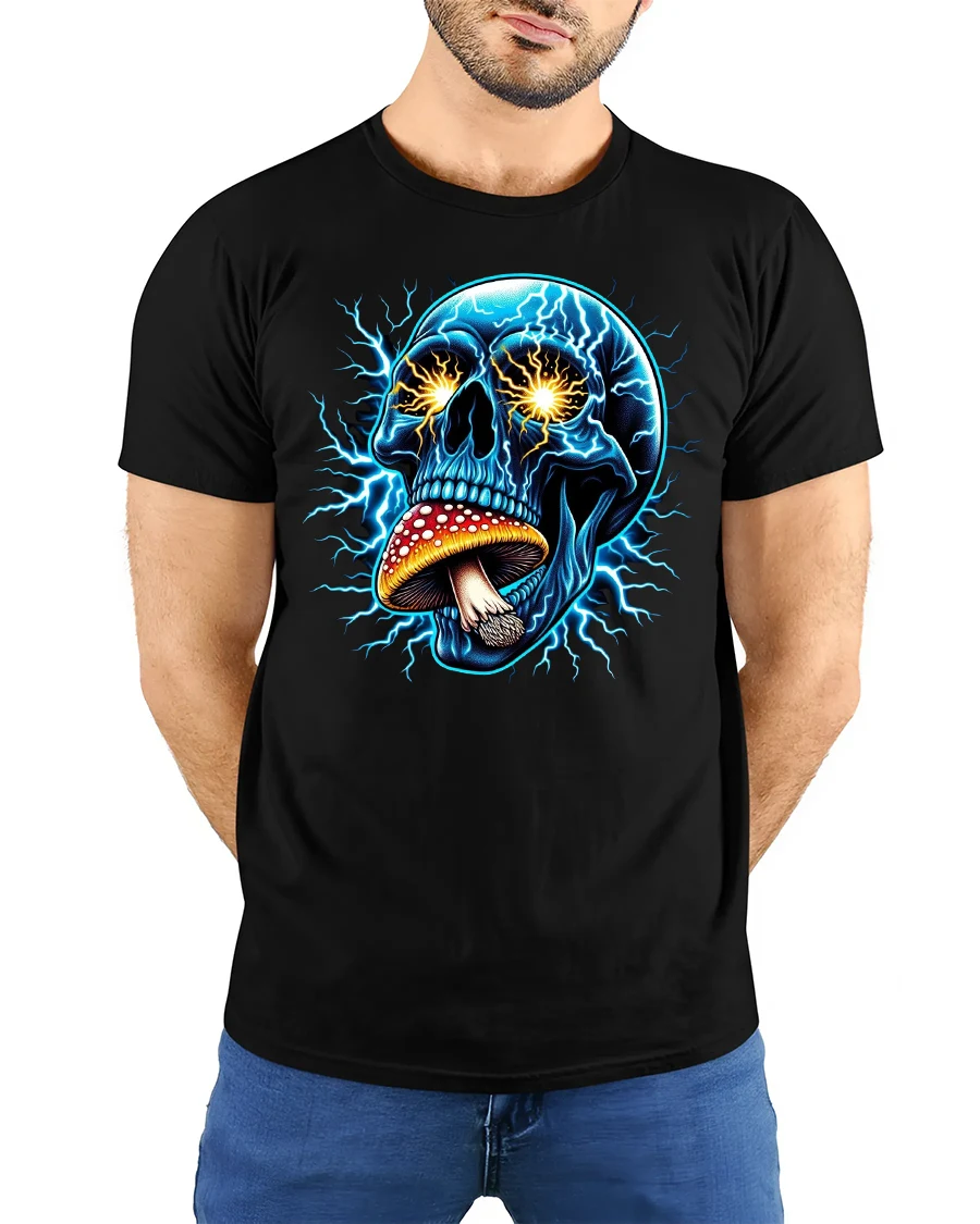 Electric Skull With Mushroom Psychedelic Print Tee is a bold, eye-catching graphic shirt that fuses dark horror vibes with trippy psychedelic energy. The glowing electric skull, complete with lightning bolts and a wild mushroom, creates a design that’s perfect for those who love edgy, alternative fashion.