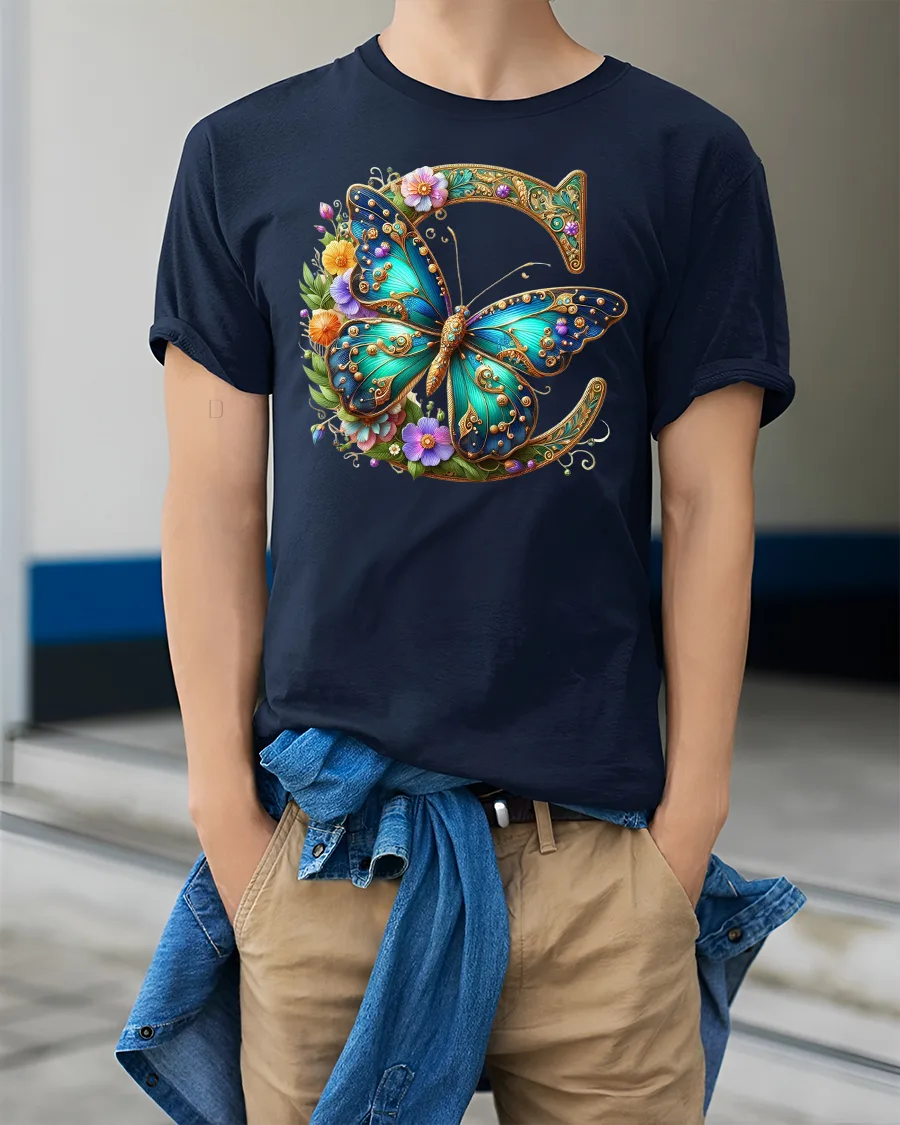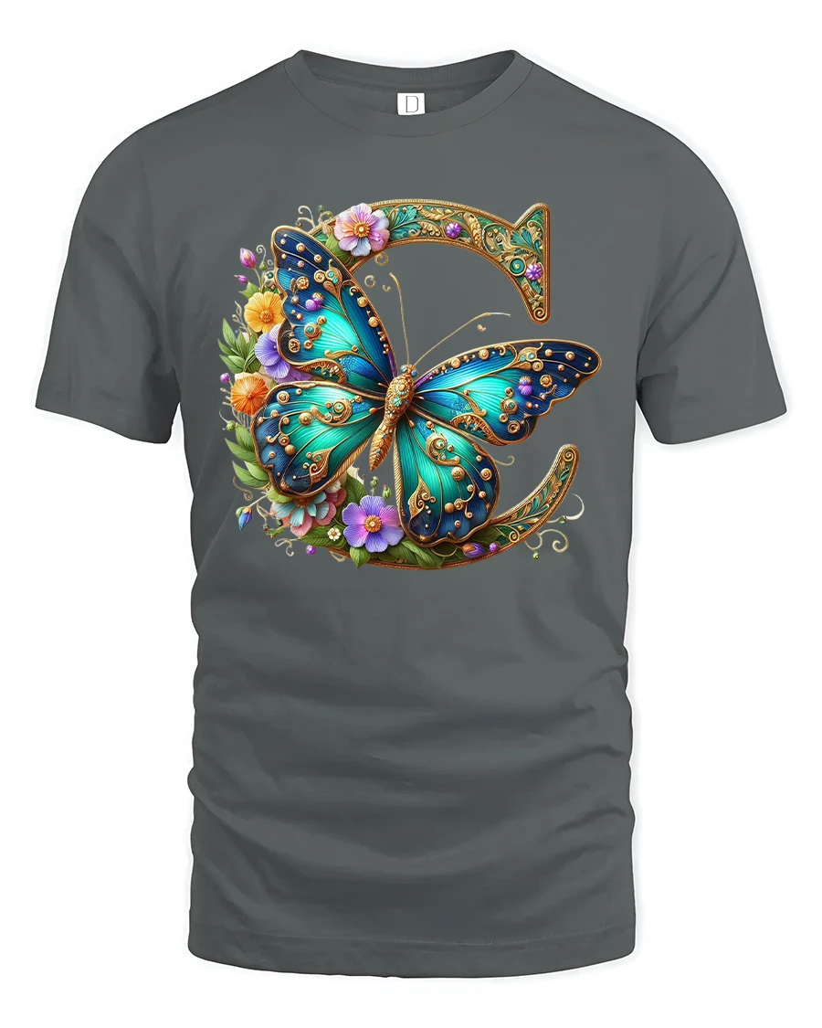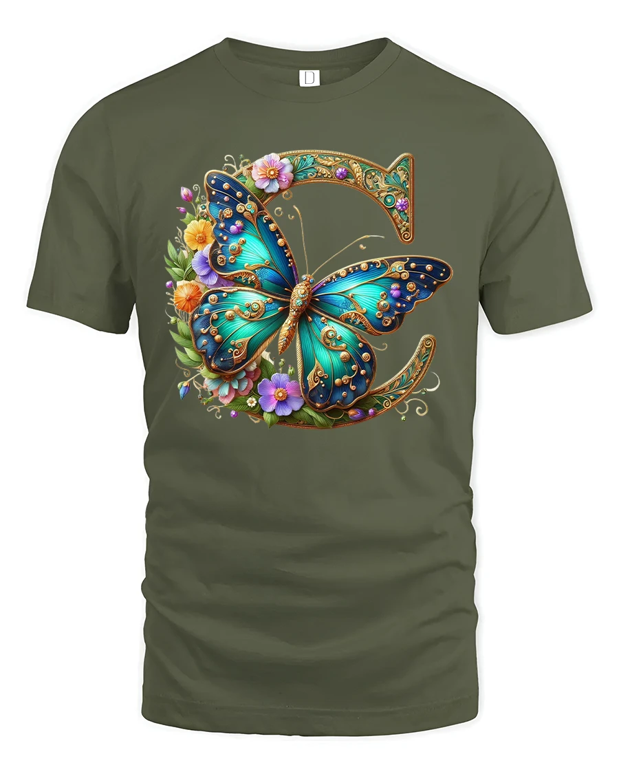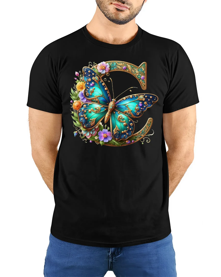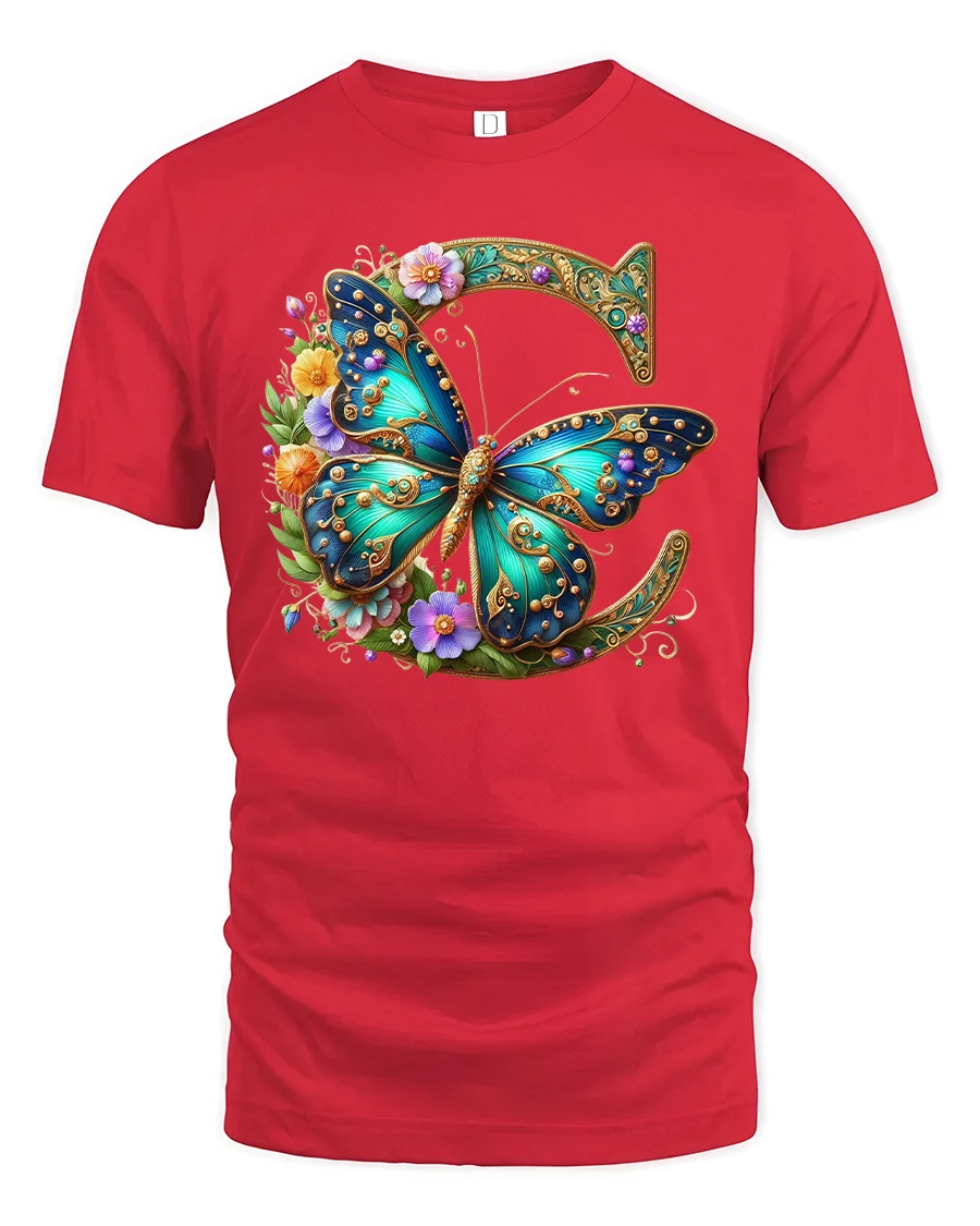 Bring beauty and elegance to your wardrobe with the Elegant Butterfly Floral Monogram Letter C Graphic T-Shirt. This stunning tee features a luxurious design of a jeweled butterfly resting on a floral-decorated letter C. The vibrant colors and intricate golden accents make it a wearable piece of art. Crafted from soft, breathable cotton, this shirt offers both comfort and style that lasts all day.
