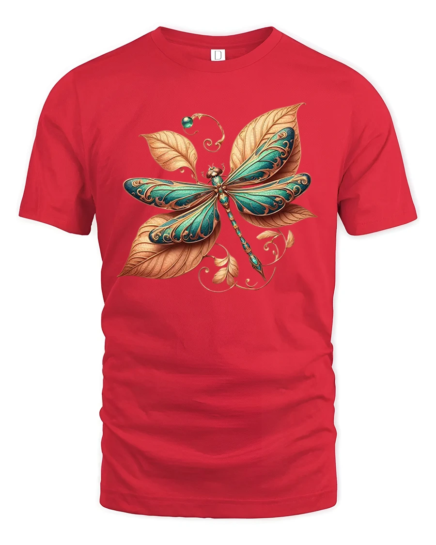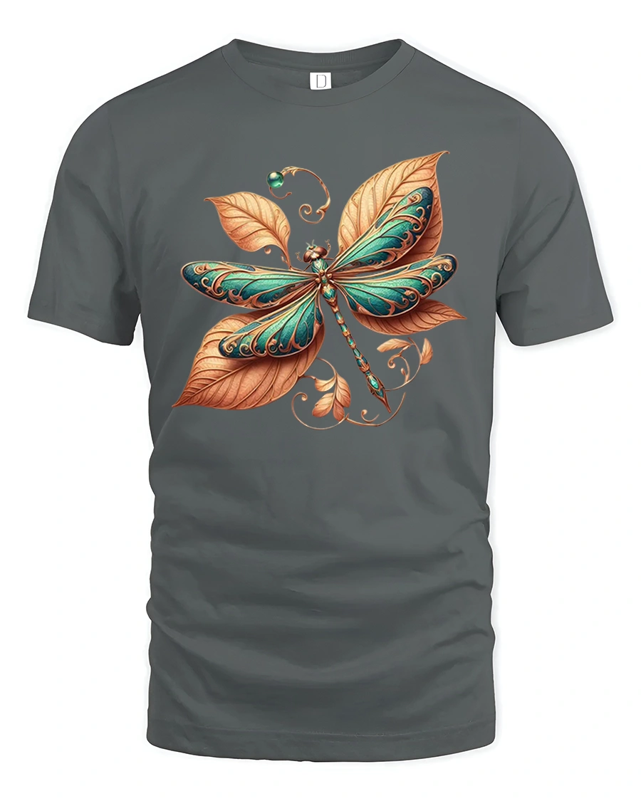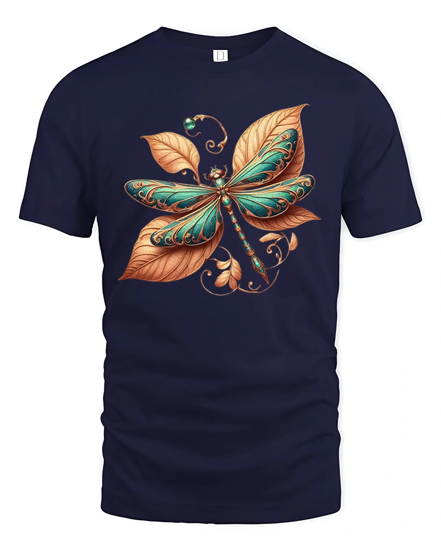 This tee features a finely detailed dragonfly surrounded by flowing leaves and ornamental patterns, symbolizing transformation, balance, and calm energy.