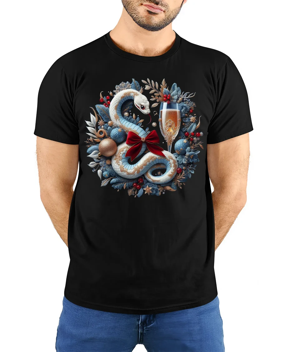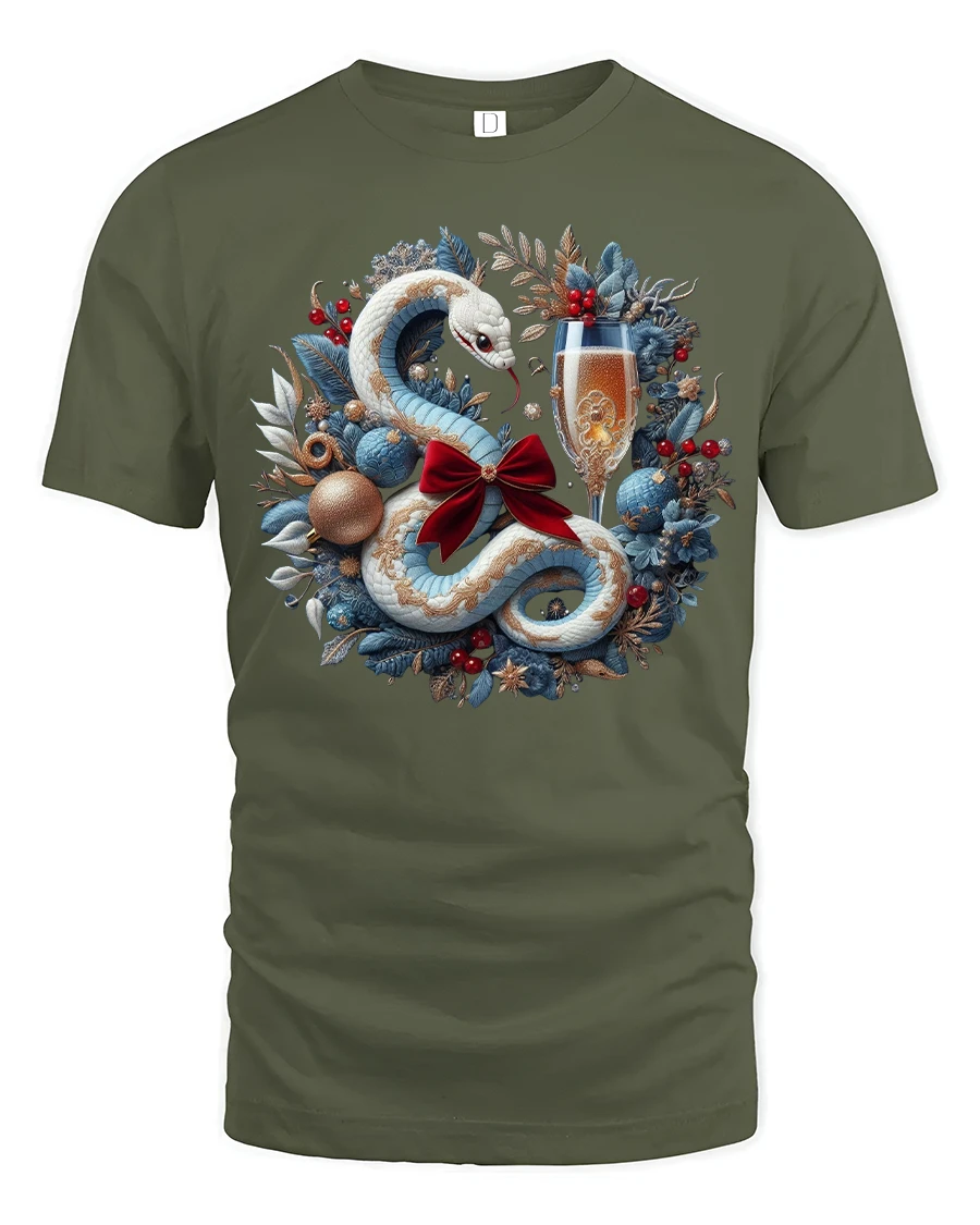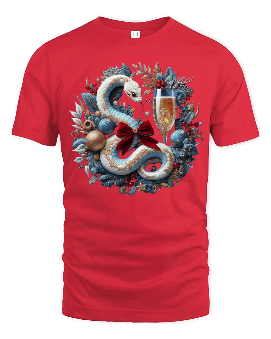 This Elegant Holiday Snake Wreath Champagne Celebration Tee blends bold fantasy art with festive winter charm. The design features a beautifully detailed serpent wrapped gracefully through a wreath of winter foliage, berries and shimmering accents, creating a striking holiday composition. A sparkling champagne flute and a deep red bow add a celebratory touch that enhances the elegant theme.
