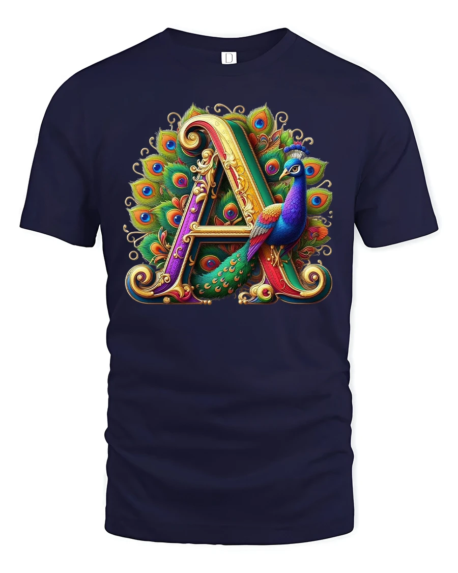 Elegant Letter A Peacock Art Graphic Printed T-Shirt is the perfect combination of style, individuality, and elegance. Featuring a beautifully detailed letter A surrounded by vibrant peacock feathers and an artistic peacock design, this shirt is ideal for anyone who loves personalized fashion with a creative touch. The bold, colorful artwork makes this tee a standout piece for everyday wear or special occasions.