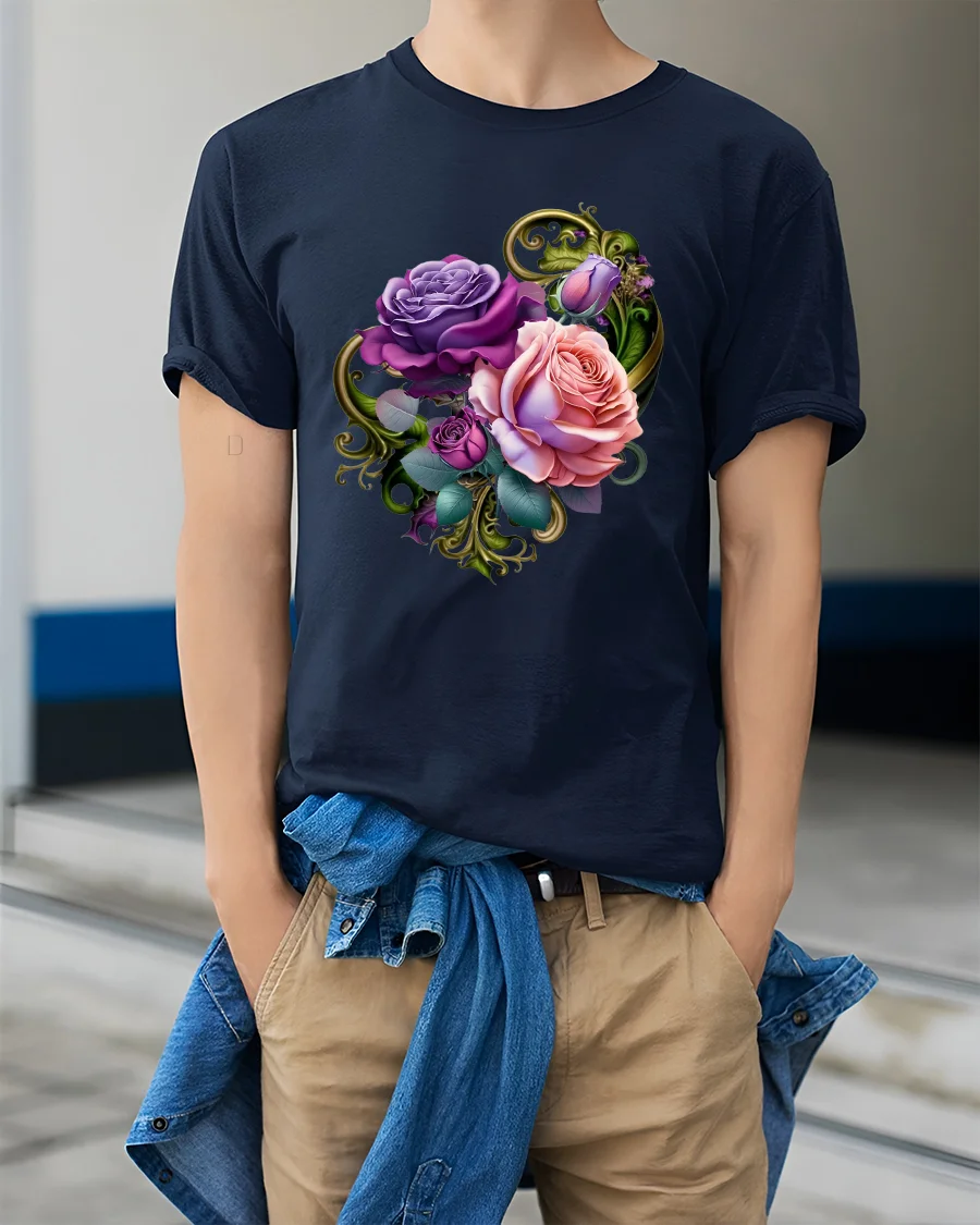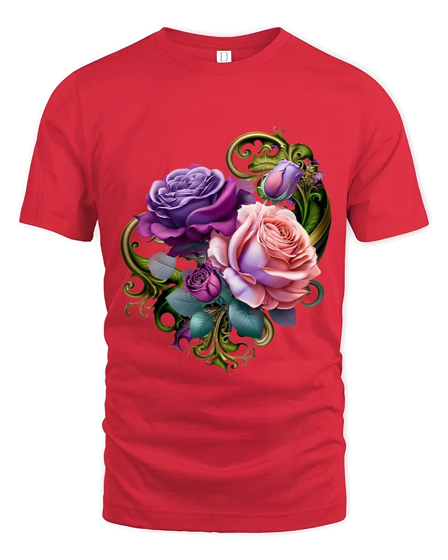 Elegant Purple and Pink Rose Bouquet Graphic Tee brings together soft romance and vivid artistic detail. Featuring a beautifully blended bouquet of purple and pink roses surrounded by lush leaves and ornamental vines, this design creates a charming botanical look perfect for flower lovers. The artwork’s rich tones and smooth shading make the floral elements appear fresh and lively, giving the tee a visually elegant and feminine appeal.