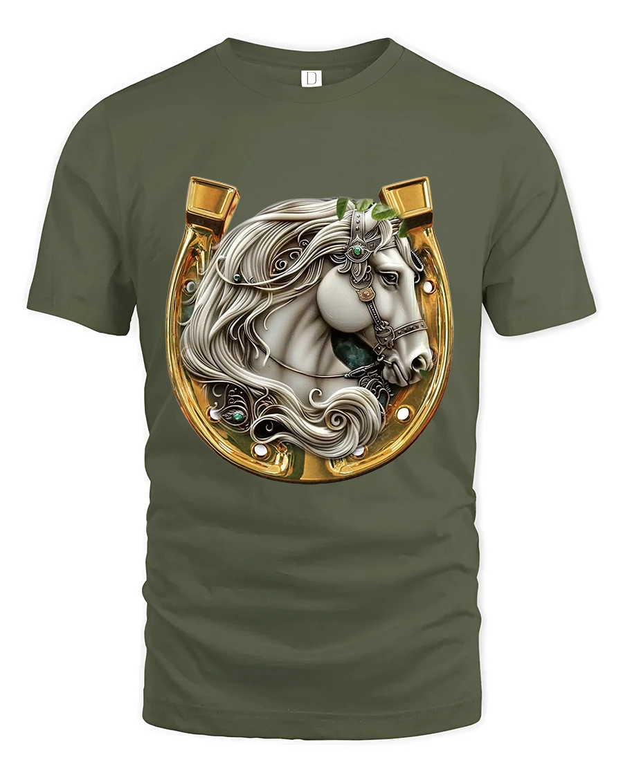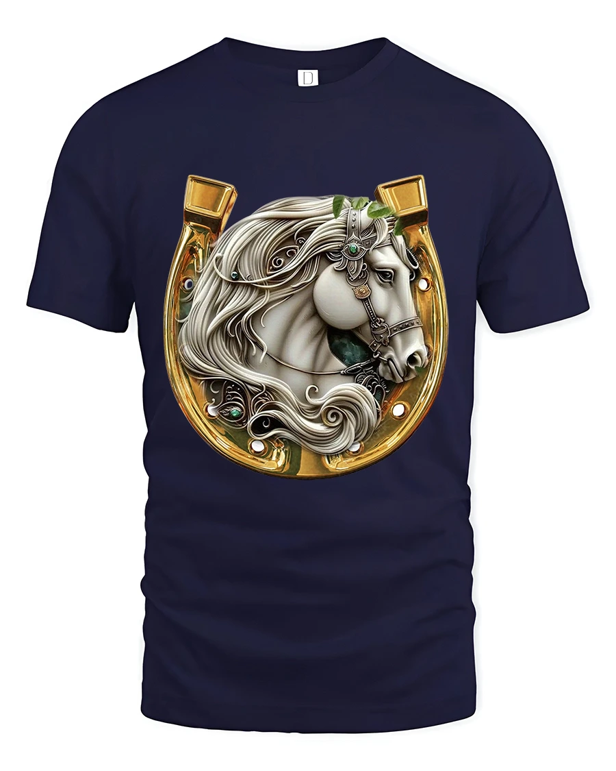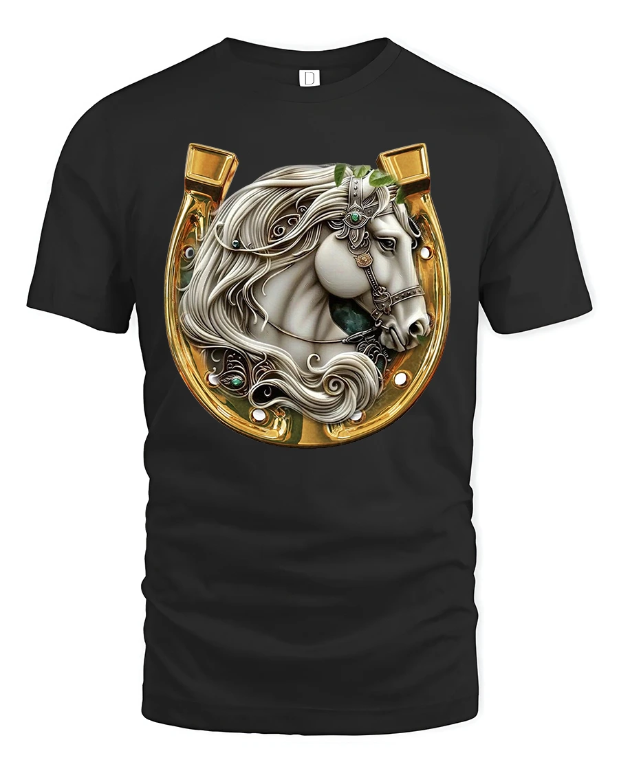 Elegant White Stallion Horseshoe Graphic Tee captures the beauty, strength, and noble presence of a majestic horse framed inside a gleaming golden horseshoe. The detailed artwork showcases flowing white mane textures, decorative bridle accents, and gemstone-like embellishments that make the design feel luxurious and artistic. This tee is perfect for horse enthusiasts, Western-style fans, ranch lovers, and anyone who appreciates high-detail equestrian art.