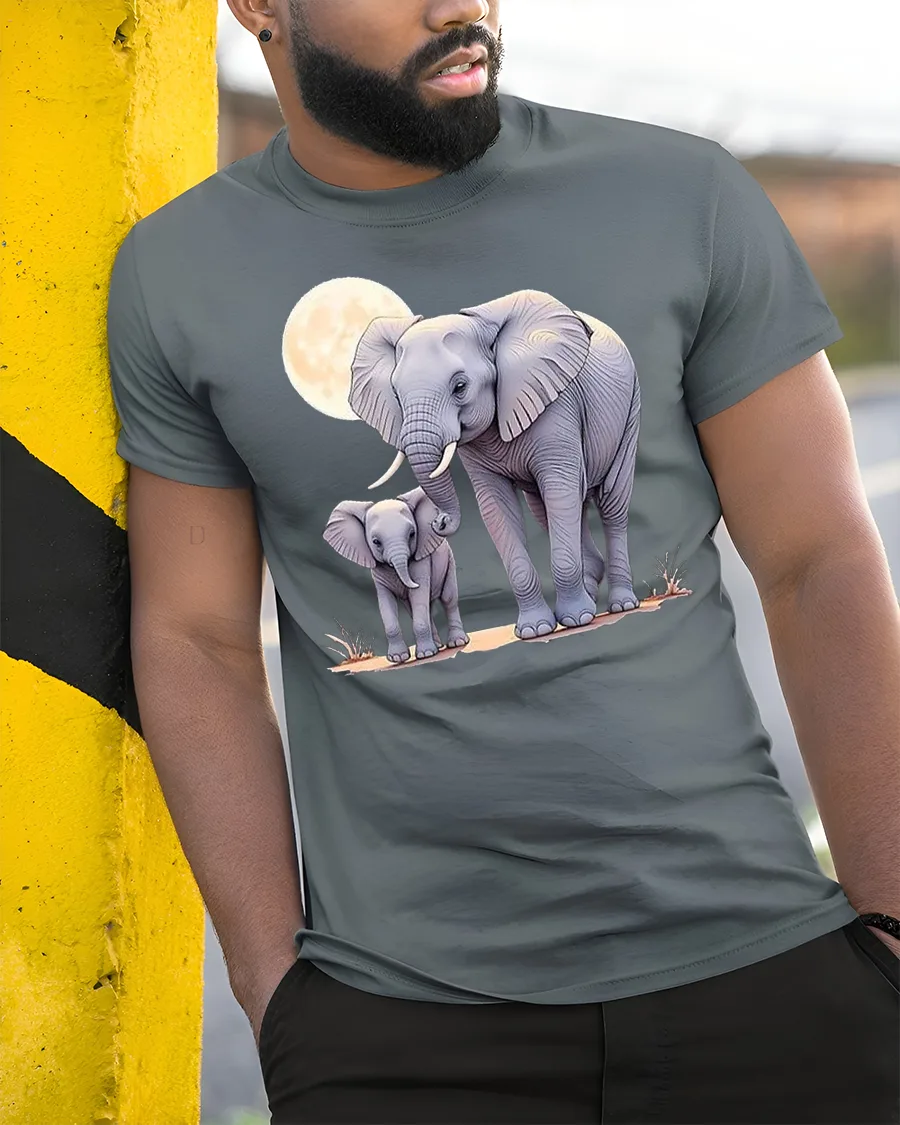 Elephant and Baby Moonlight Graphic Print T-shirt is a heartwarming design that captures the gentle bond between a mother elephant and her baby under the soft glow of the moon. Perfect for animal lovers, wildlife enthusiasts, and anyone who appreciates the beauty of nature, this tee brings serenity and style together in one wearable piece of art.