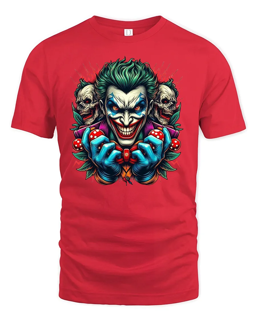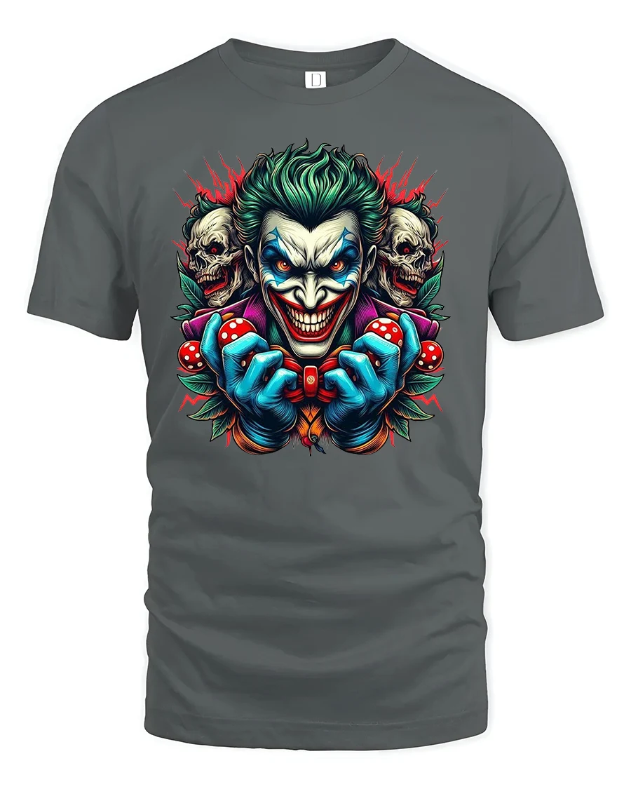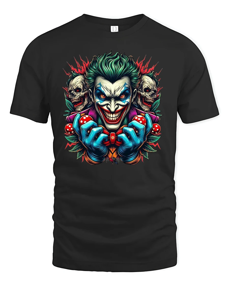The Evil Clown Dice Joker Face Creepy Graphic T-Shirt is perfect for those who love horror themes, street fashion, and standout designs. Ideal for casual wear, parties, concerts, or Halloween, this shirt makes a strong fashion statement. It’s also a great gift for joker fans, gothic fashion lovers, or anyone who enjoys unique and chilling graphic tees.