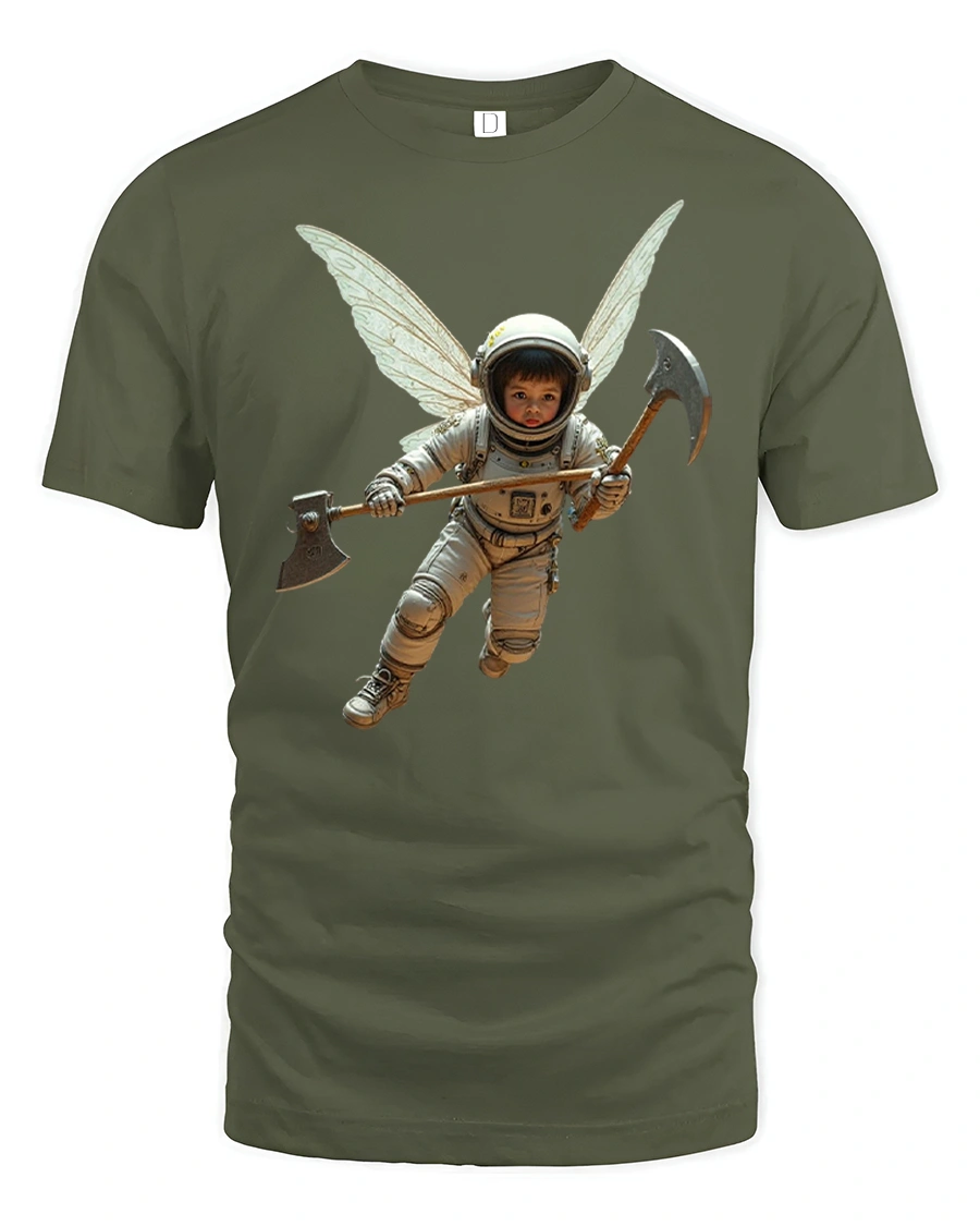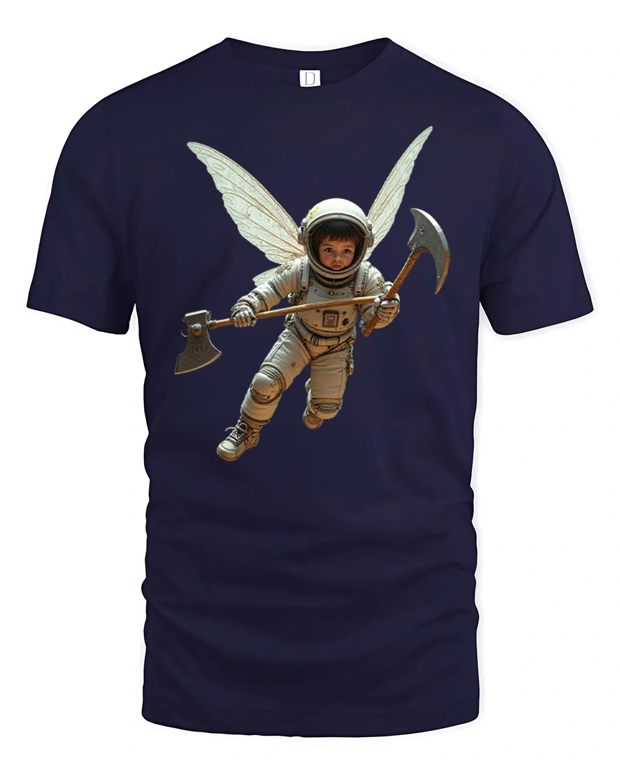 Featuring a surreal astronaut with fairy wings and a double axe, this t-shirt combines fantasy energy with sci-fi coolness, making it perfect for dreamers, space lovers, and art enthusiasts.