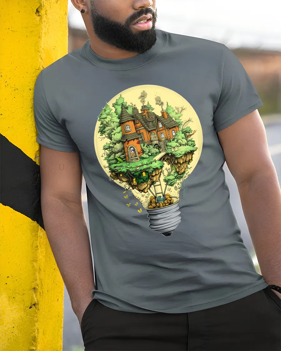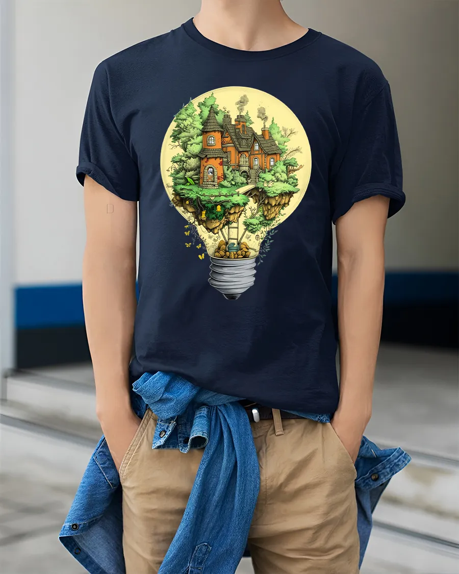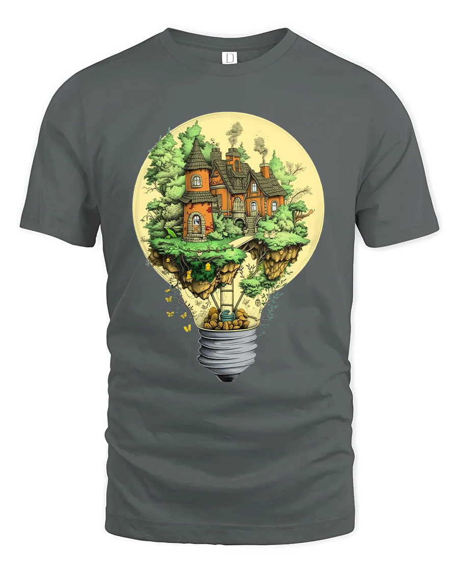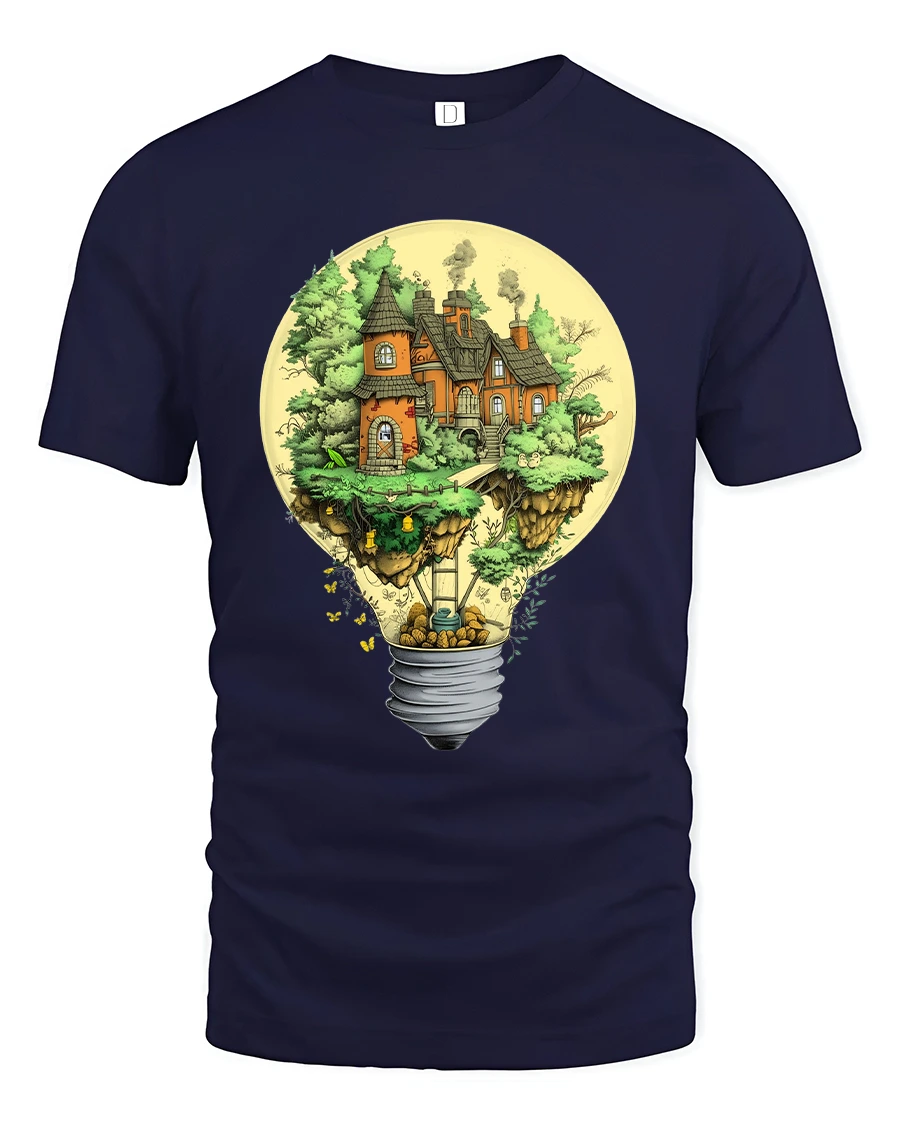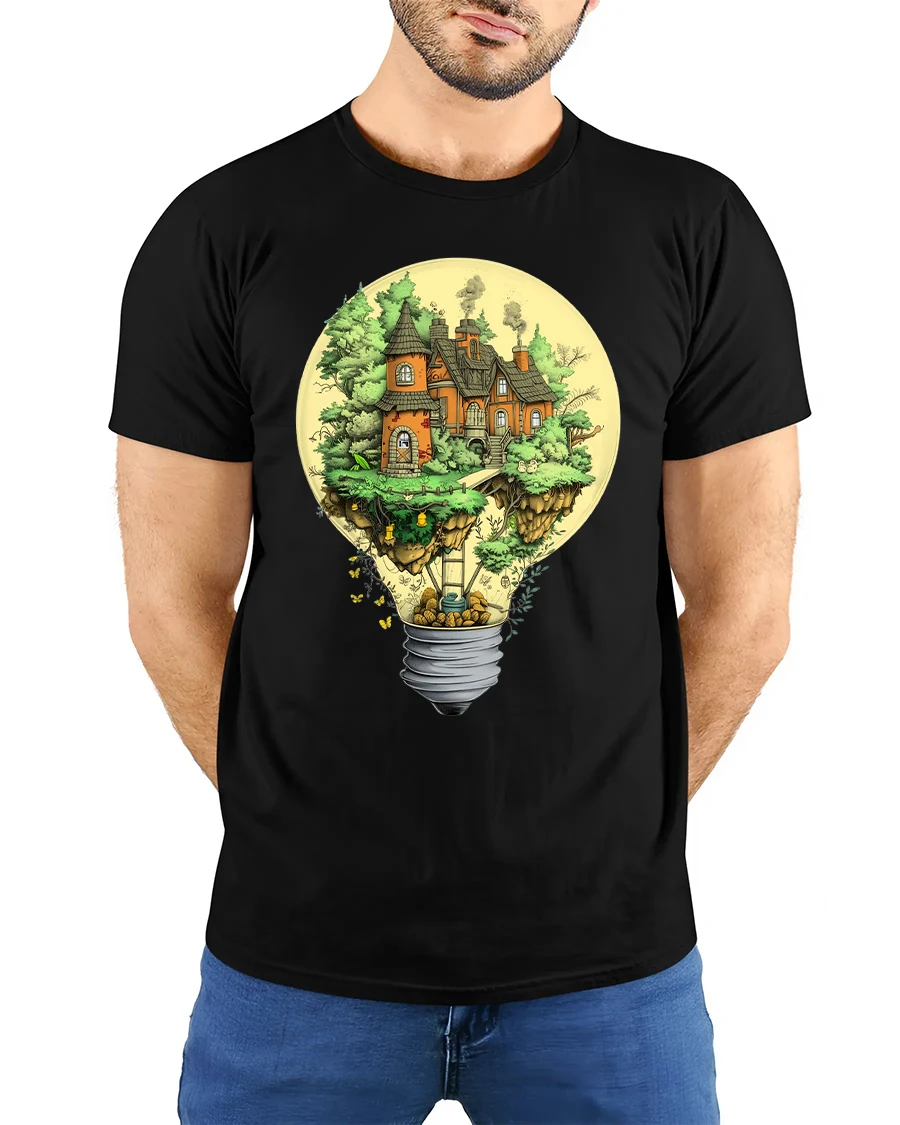 Express your creativity with the Fantasy Lightbulb House Tee Creative Floating Cottage Tshirt. Pair it with jeans, casual outfits, or artistic accessories for a stylish and imaginative look. It also makes a thoughtful gift for illustrators, storytellers, nature lovers, and anyone who enjoys stunning and original graphic apparel.